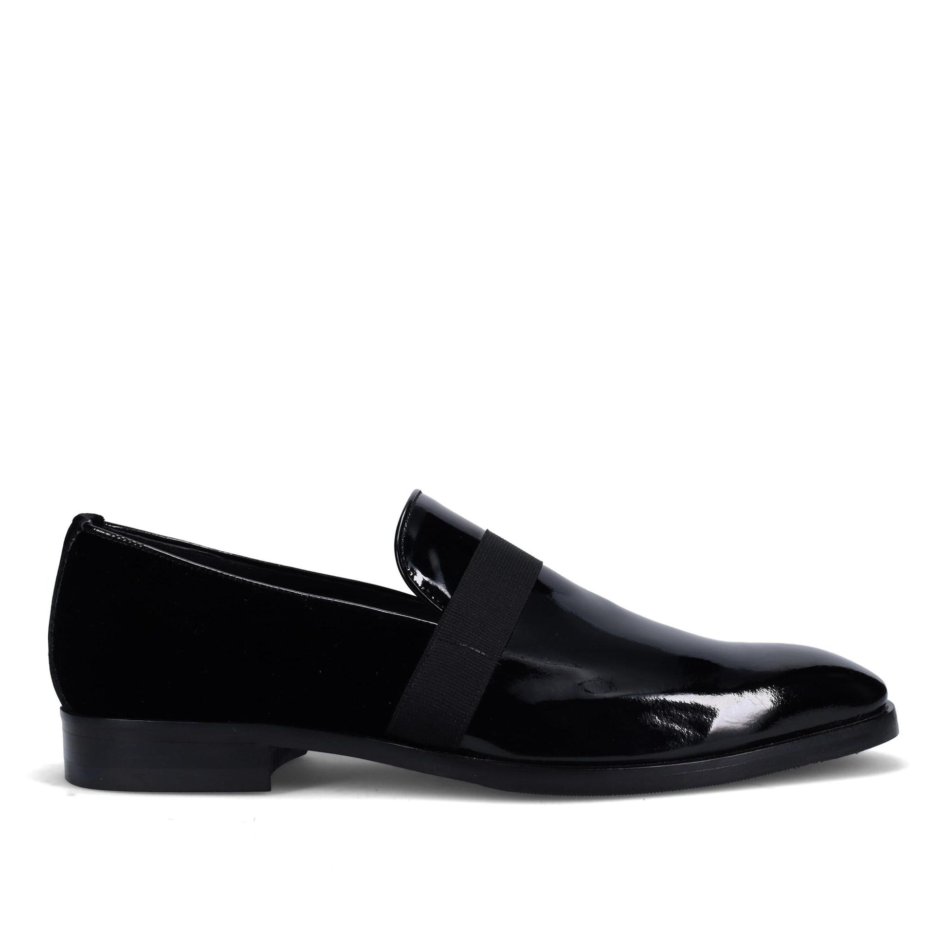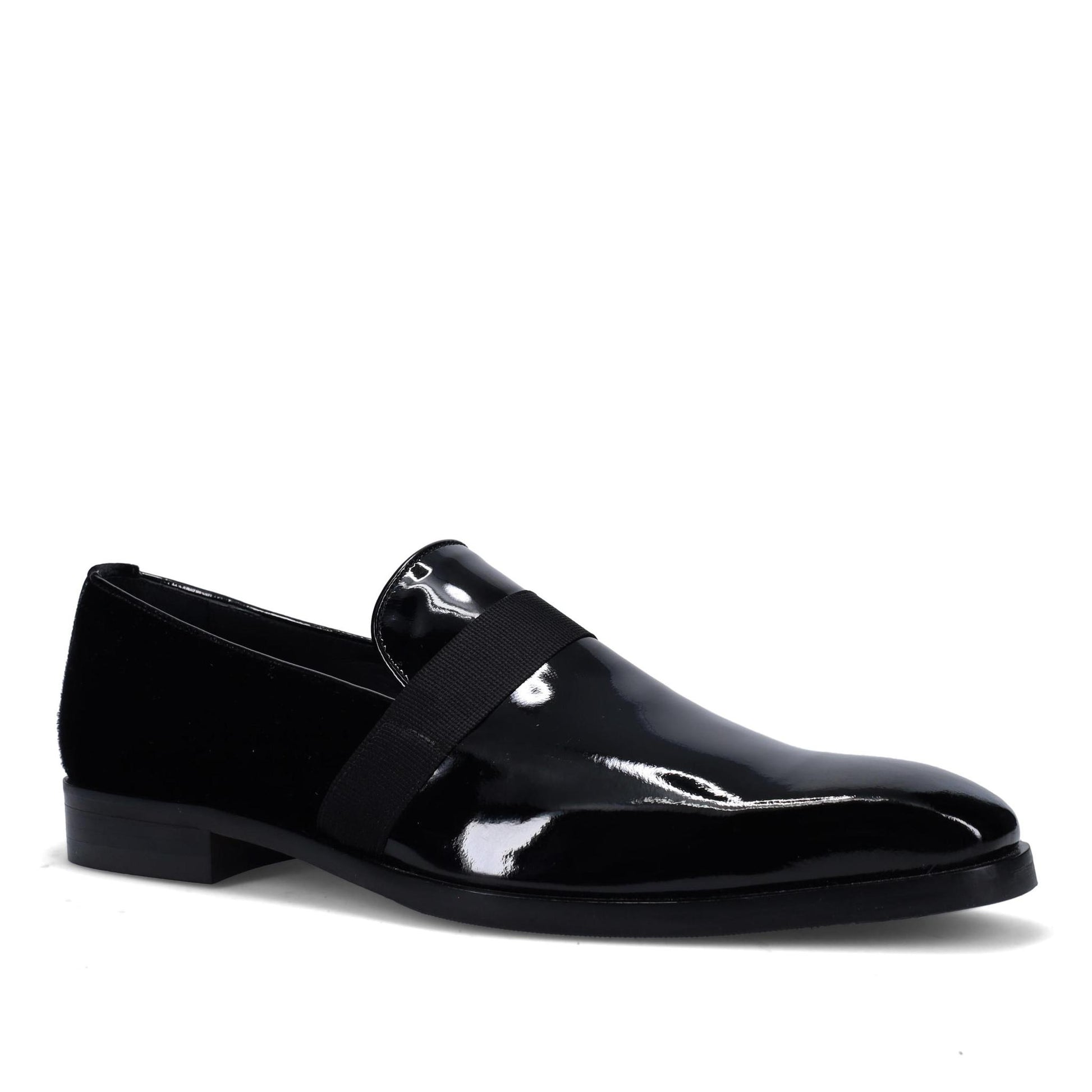 Bronko Smoking Slipper in Gloss Patent and Velvet. Grosgrain Trim. Arch Support and Double Cushioning. True Blake Construction. Made in Italy.