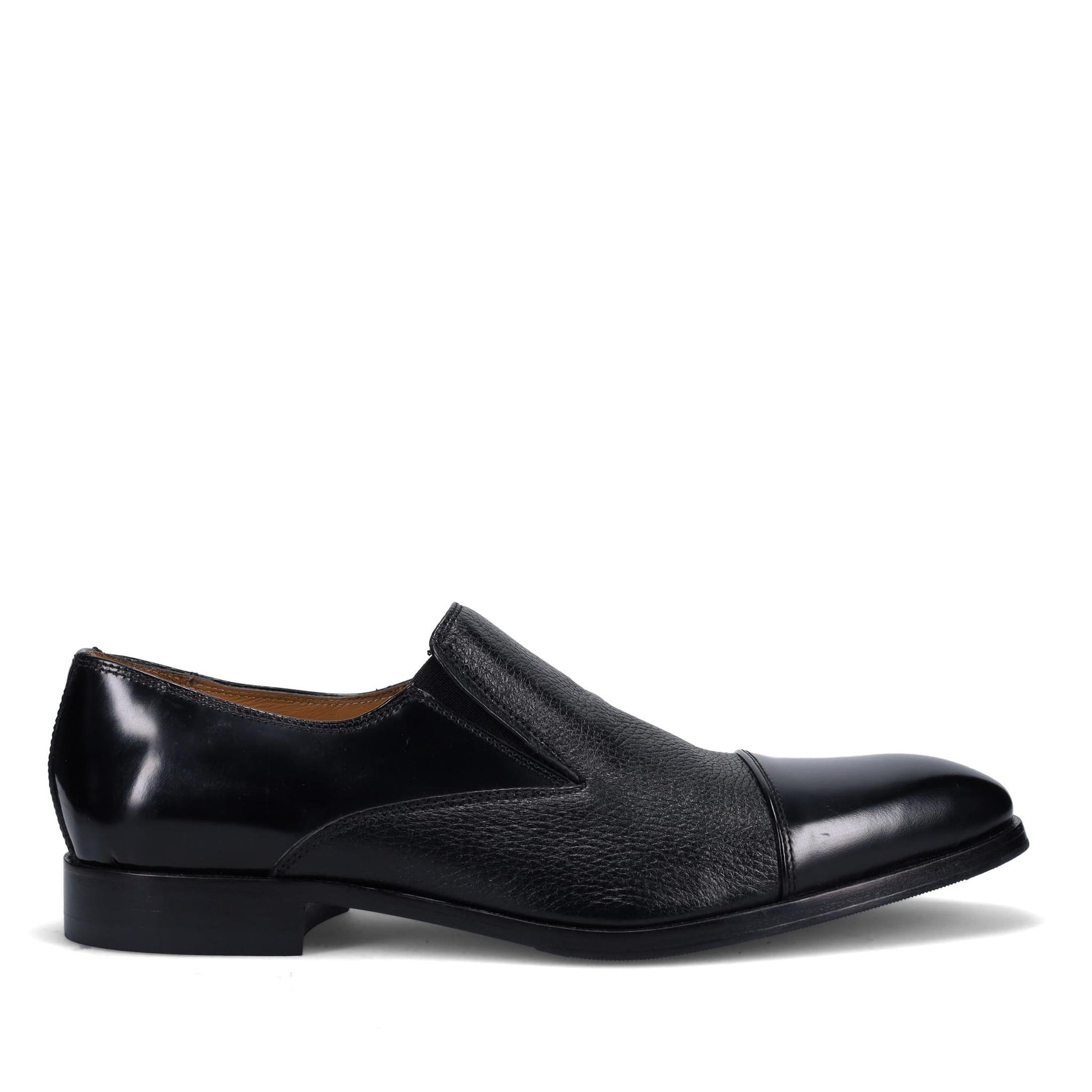 Elvan Cap Toe Slip-On in Black Shine Calf and Supple Deer Skin. Arch Support & Double Padding. Weatherproof. Made in Italy.