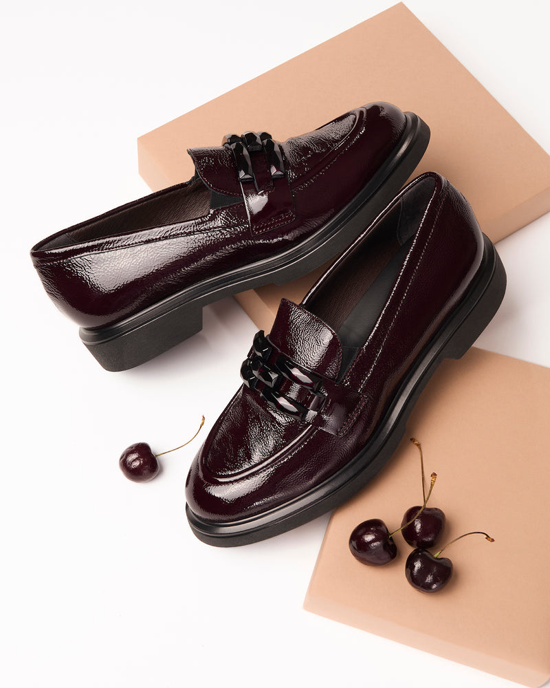 Crafted from soft crinkle patent accented with a faceted chain-link, this loafer is elevated by 5mm gel-cushioning comfort technology for chic all day style.