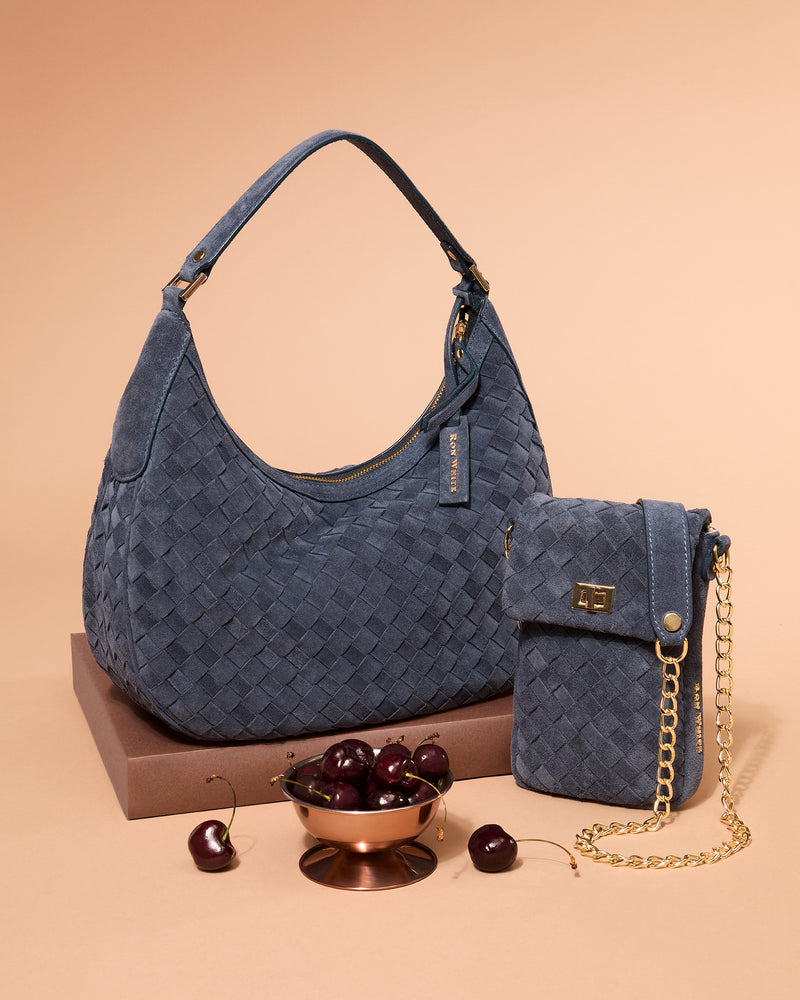 A modern luxurious hobo crafted in handwoven, weatherproof suede — the texture of the season. Spacious, versatile, and stealthily powerful.