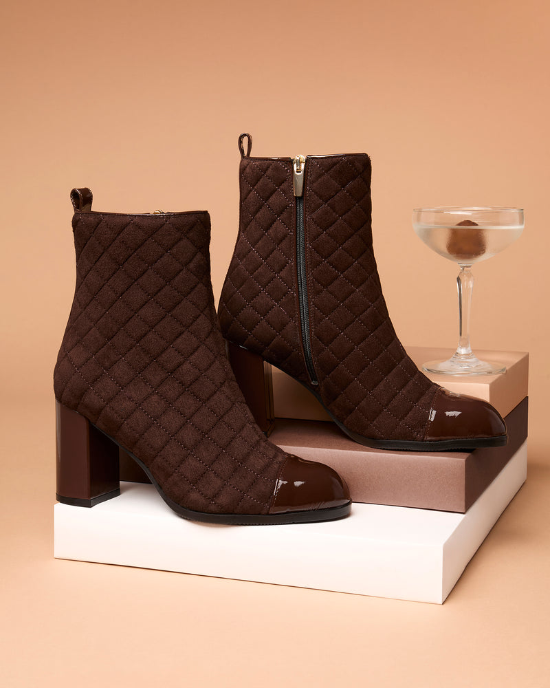 Hand quilted weatherproof cashmere suede accented with flashes of high-gloss patent finished with a sleek side zip, luxe double cushioning, and a sole that grips with style.