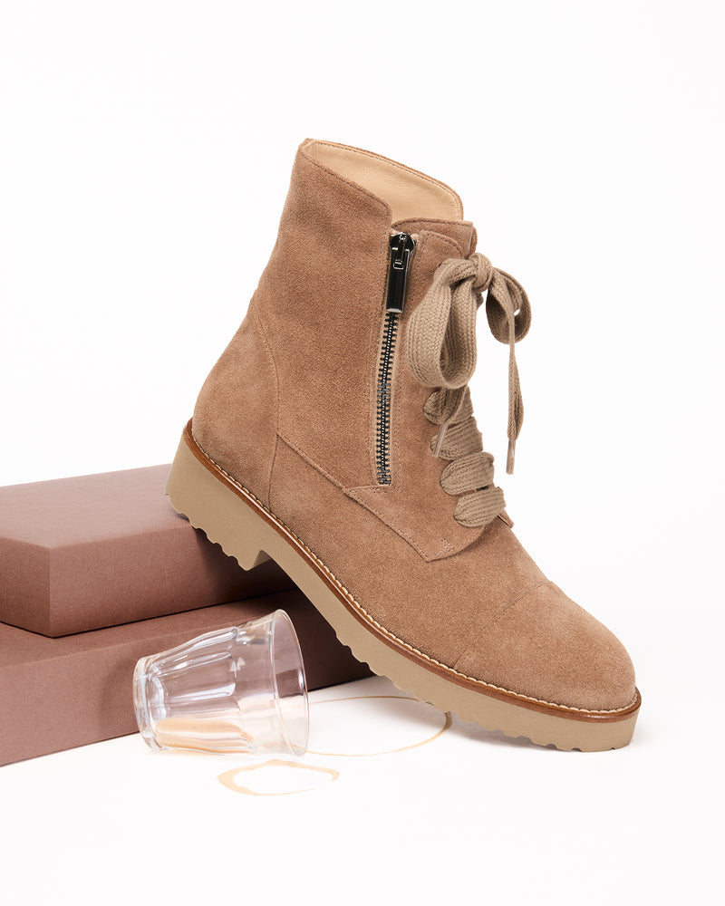 Weatherproof Cashmere suedewith a back whipstitch surprise. Sleek inner zip, pillow-soft double padding and a city-ready heel with a confident rubber sole.
