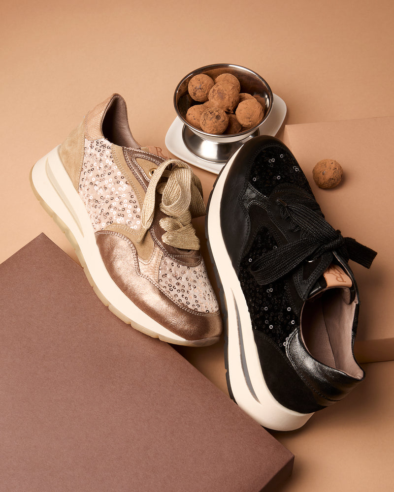 Our definition of “sneaky" glamour, crafted from supple metallic calf and sequined crushed velvet, finished with soft silky knit laces. A fully removable footbed with arch support and metatarsal cushion ensures exceptional comfort.