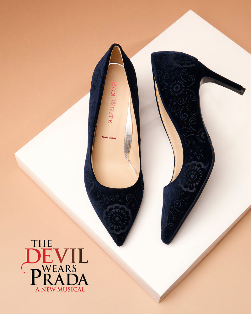 Limited Edition, The Devil Wears Prada Collection by Ron White 👠 Designed for lead character Miranda Priestly in The Devil Wears Prada Musical, played by Vanessa Williams. A signature silhouette crafted in rich midnight velvet, elevated with an intricate laser-cut lace pattern and grounded in All Day Heels™ technology for effortless allure and wearability.