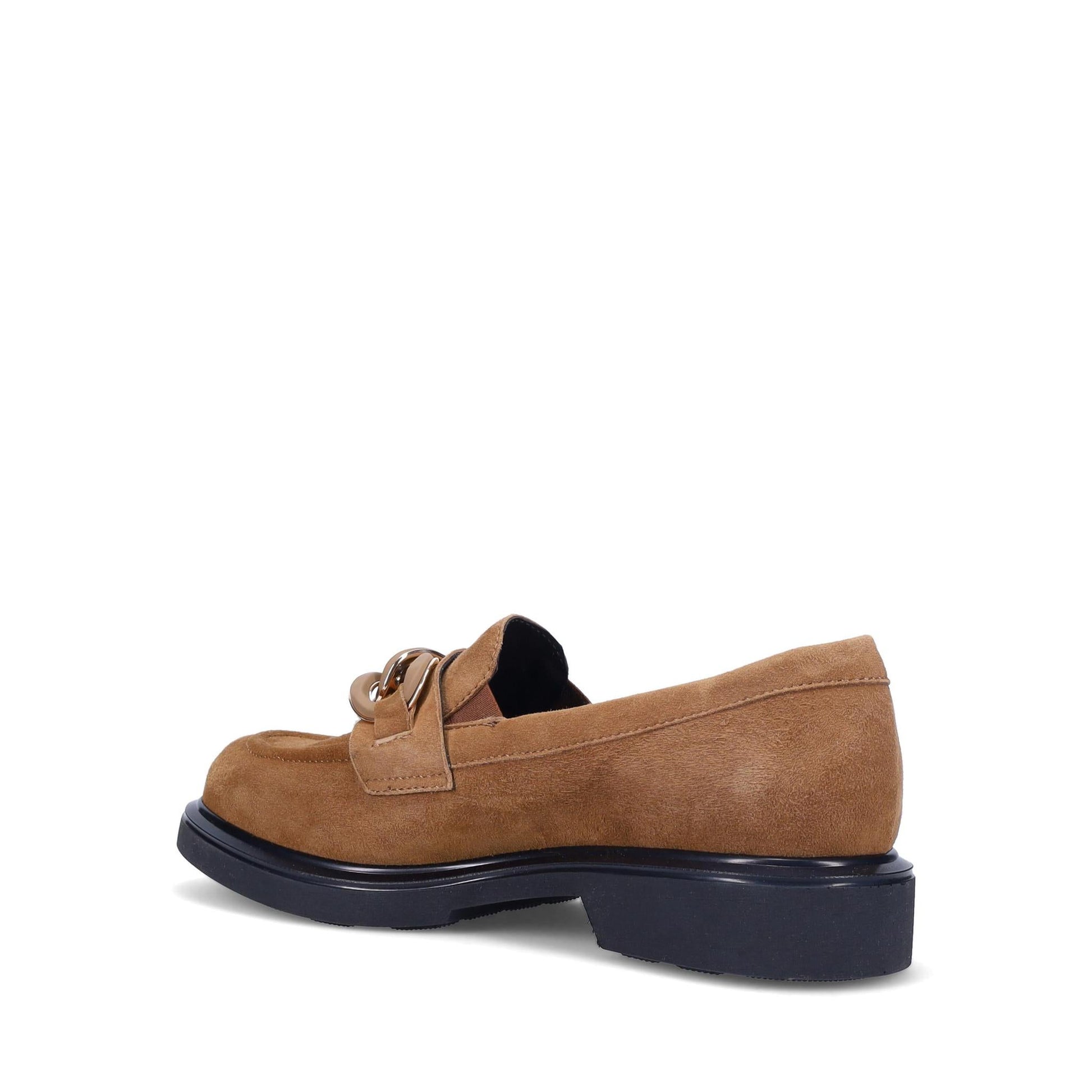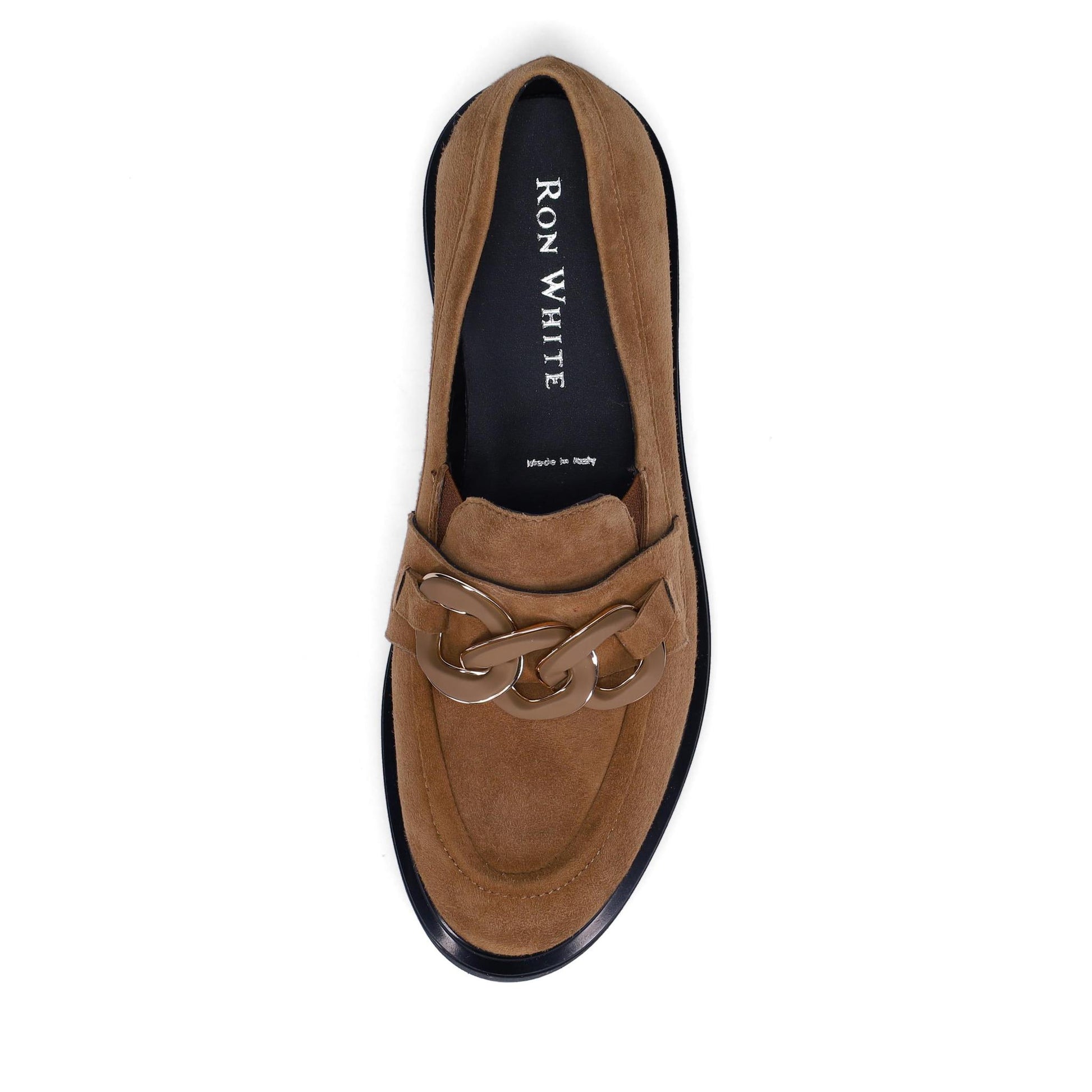 Allison Loafer in Suede. Metallic and Matte Rubber Chain Detail. Unique 5mm Gel injected Foam Cushioning. Anti-Slip Rubber Sole. Made in Italy.