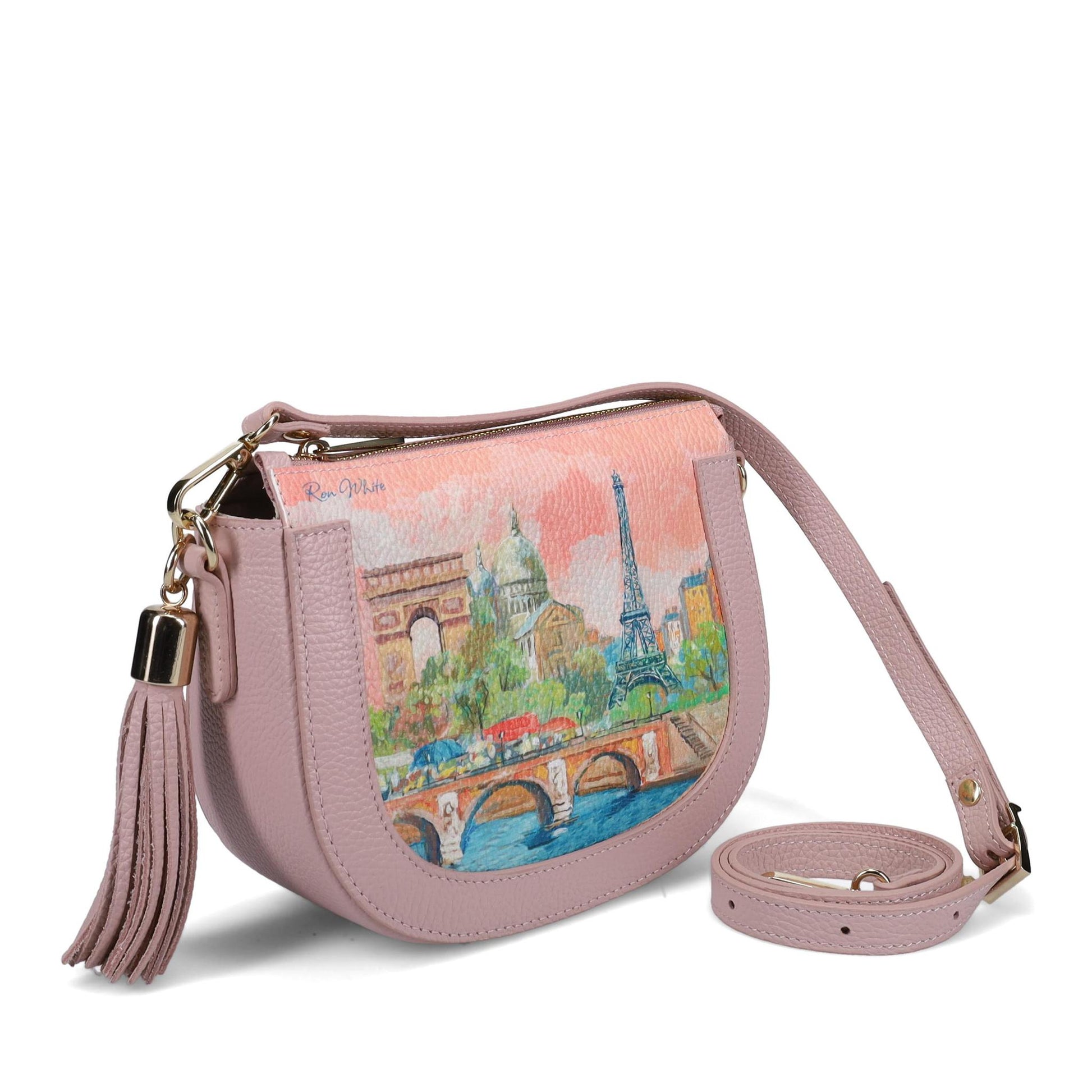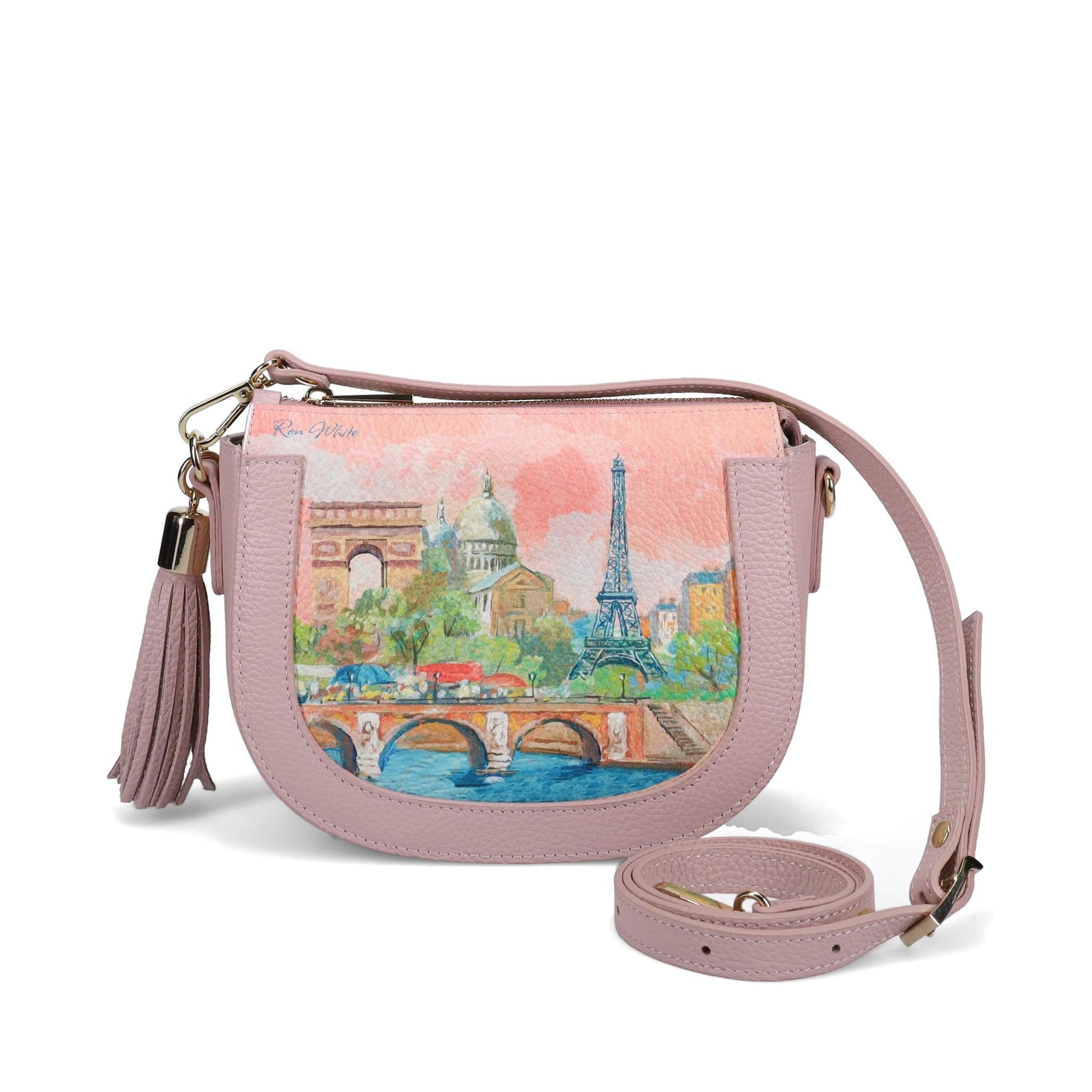 Artisan Crossbody Saddle Bag featuring Limited edition original works inspired by treasured destinations. Hand painted on Supple Tumbled Calf. Jewelry Grade Platino Hardware. Top zip closure. Made in Italy.