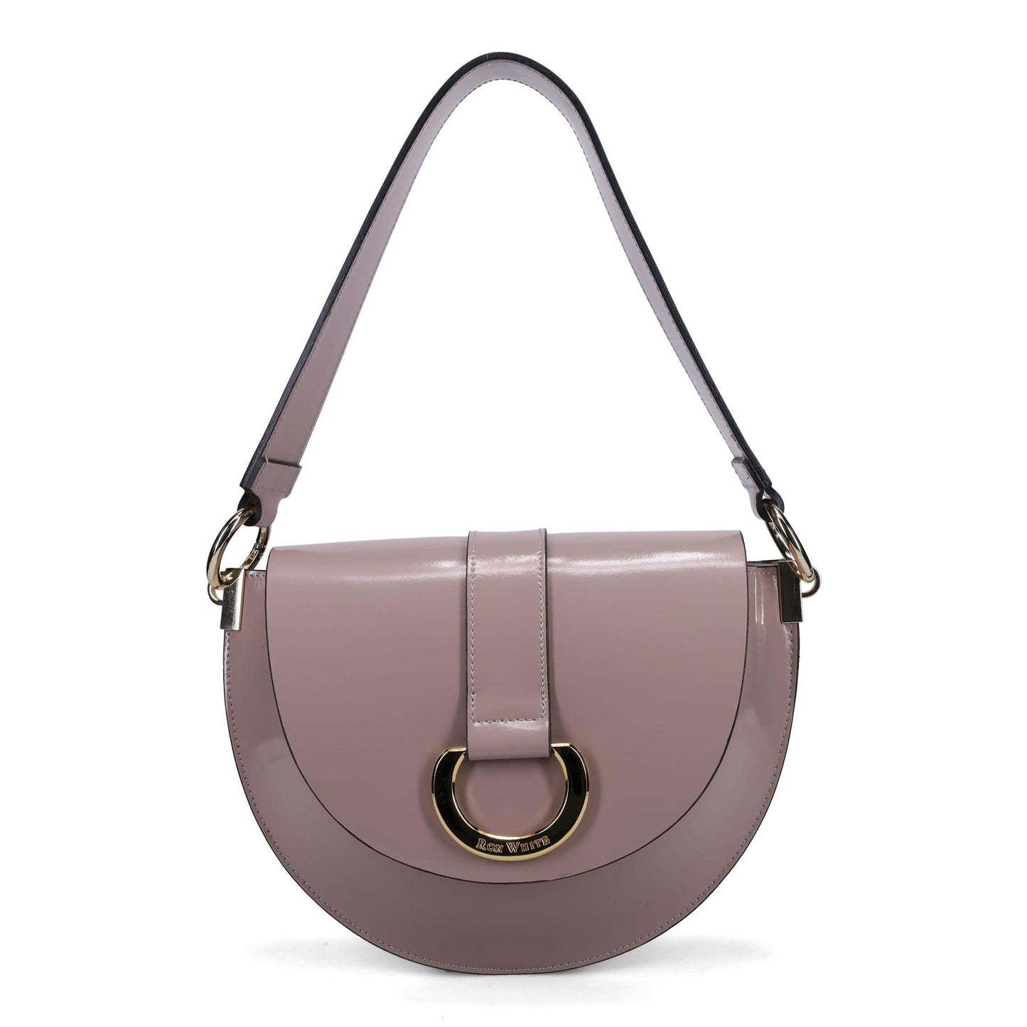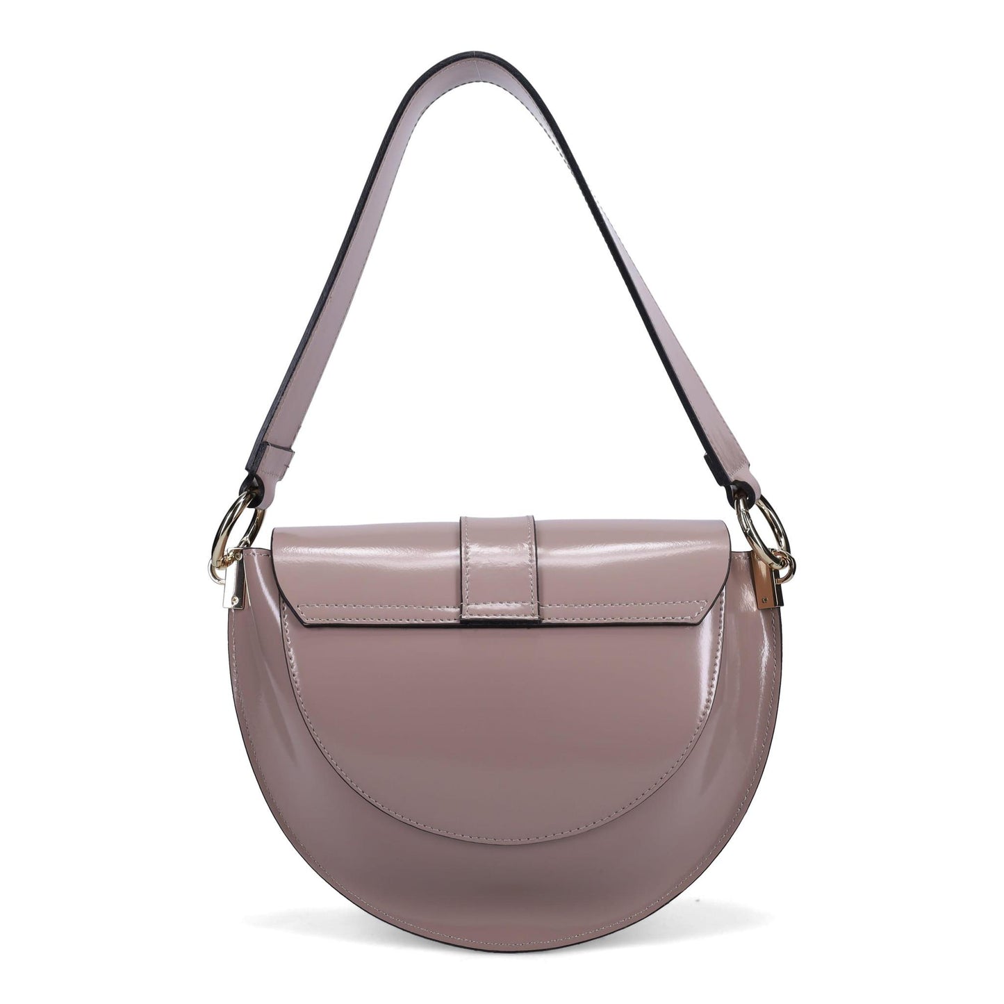Bandora Saddle Bag in Shine Calf. Jewelry Grade Platino Hardware. Flap Over Magnetic Closure. Made in Italy.