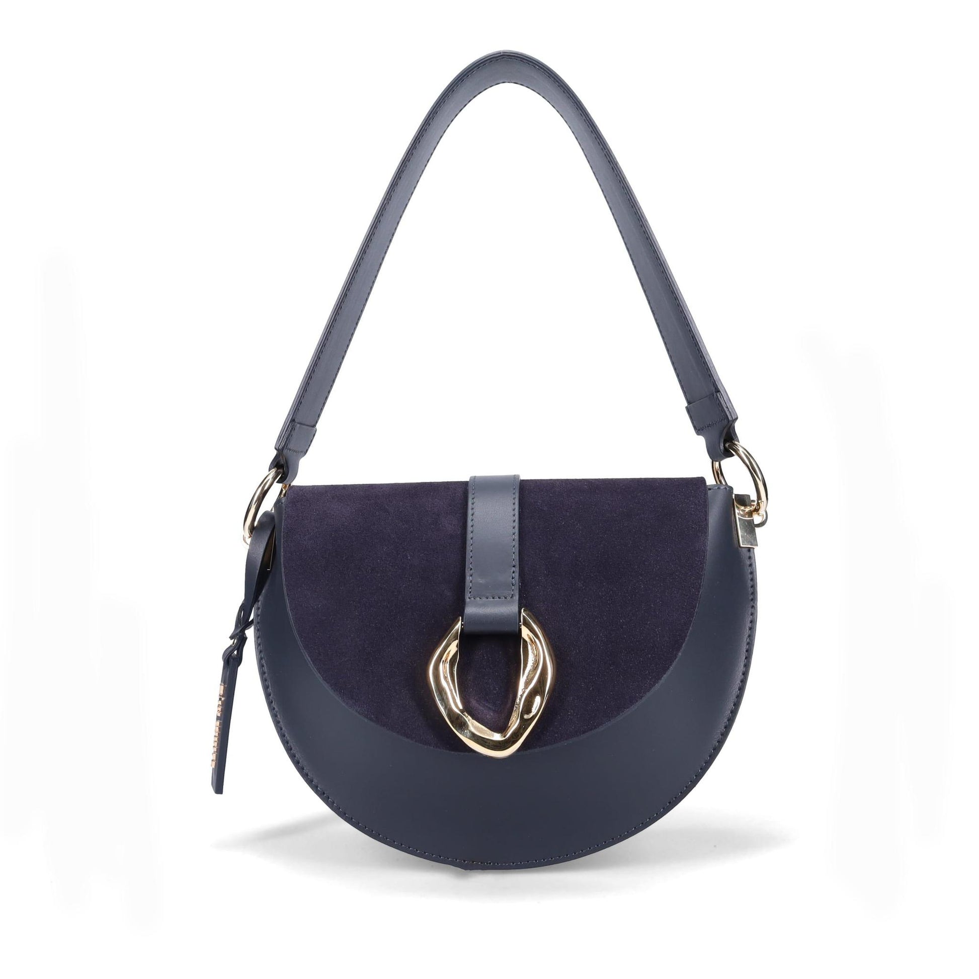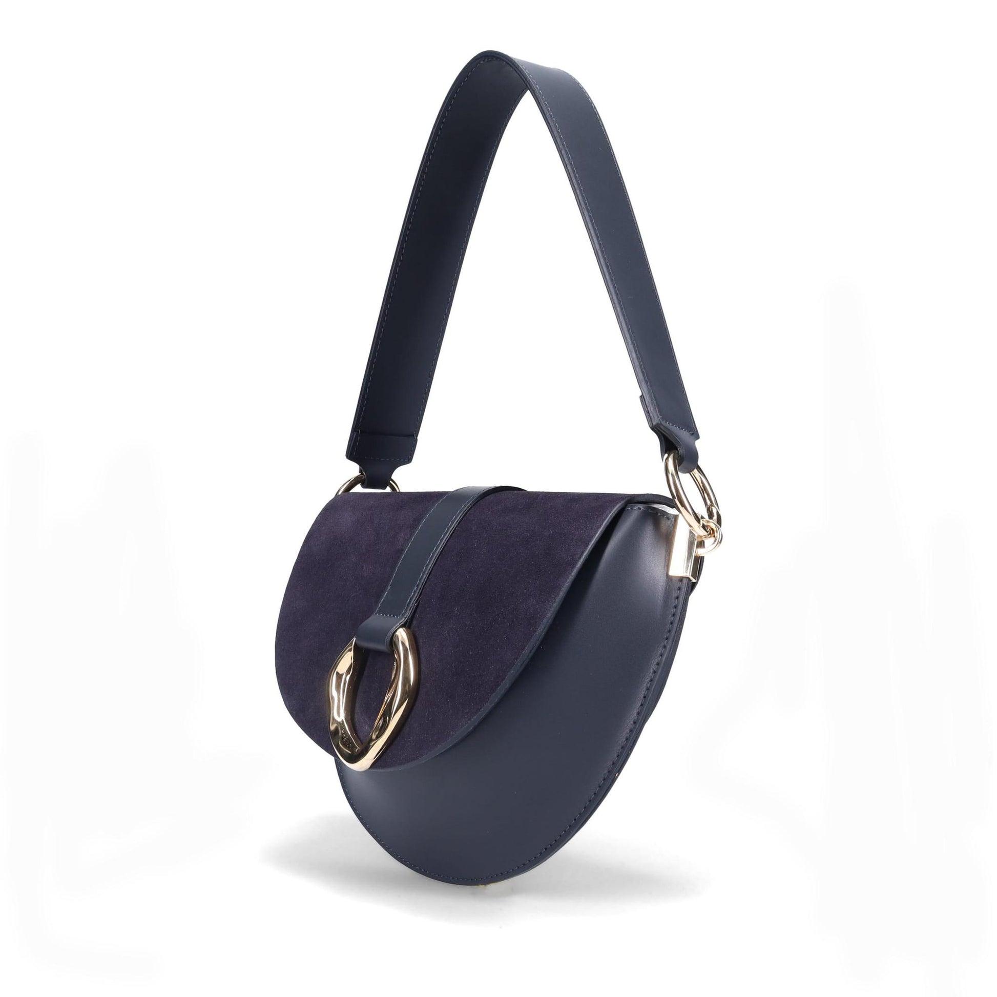 The Beckett Saddle Bag in Smooth Calf and Suede. Jewelry Grade Platino Hardware. Flap Over Magnetic Closure. Made in Italy.