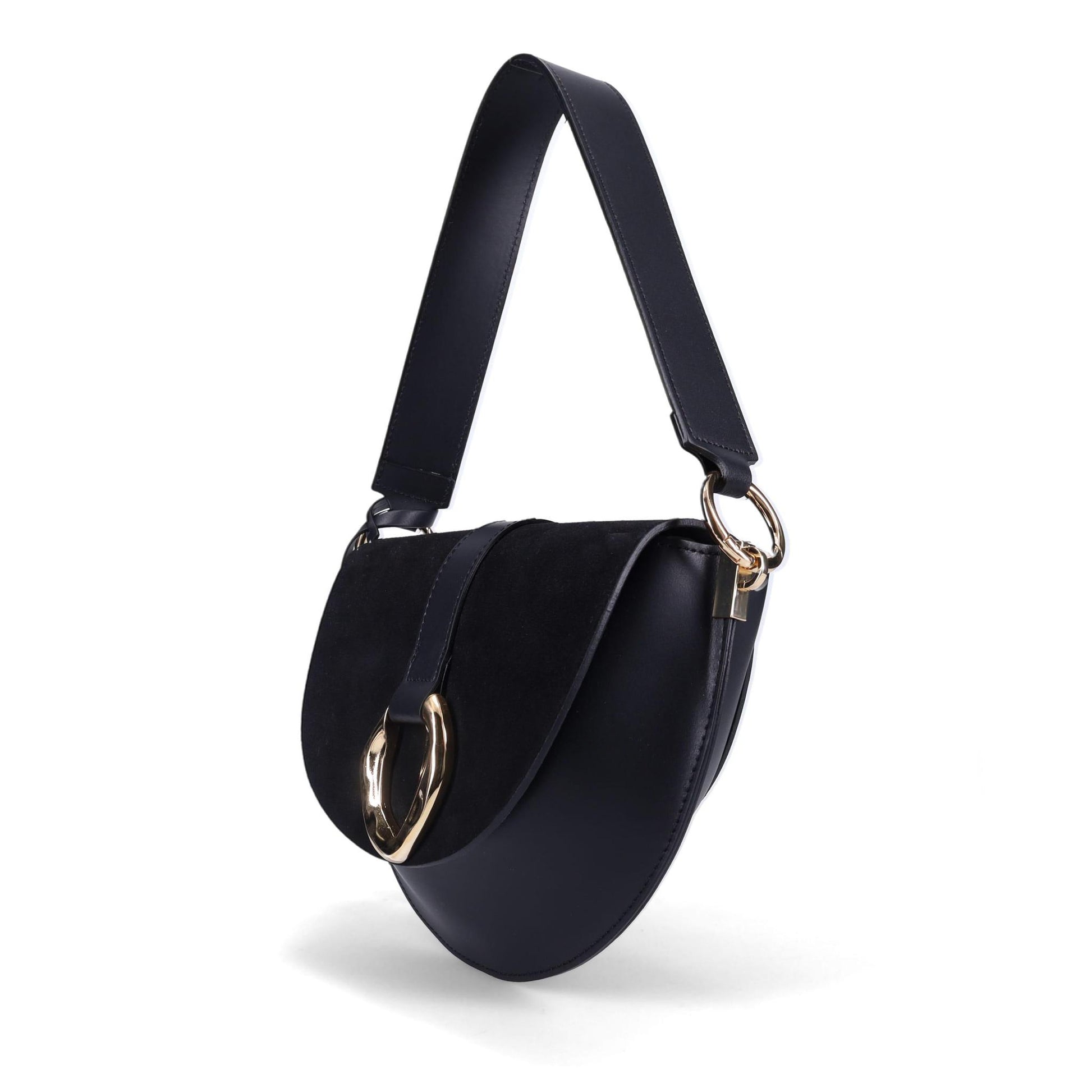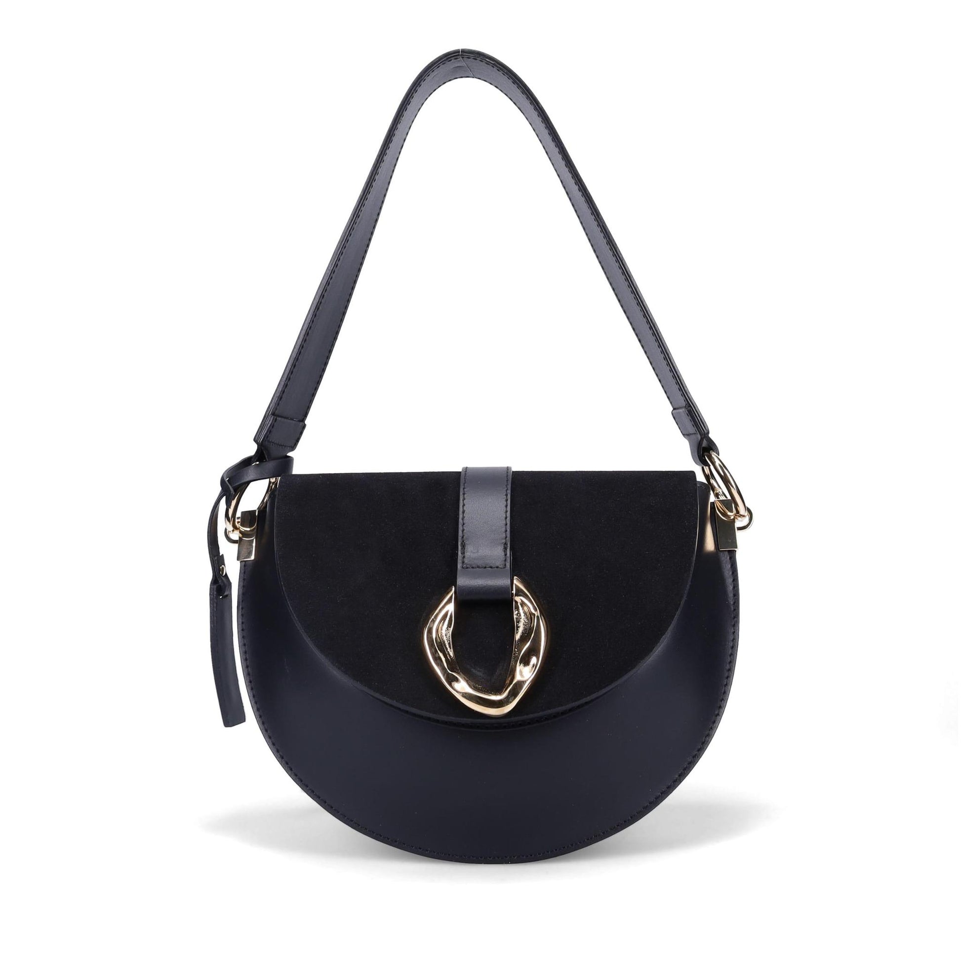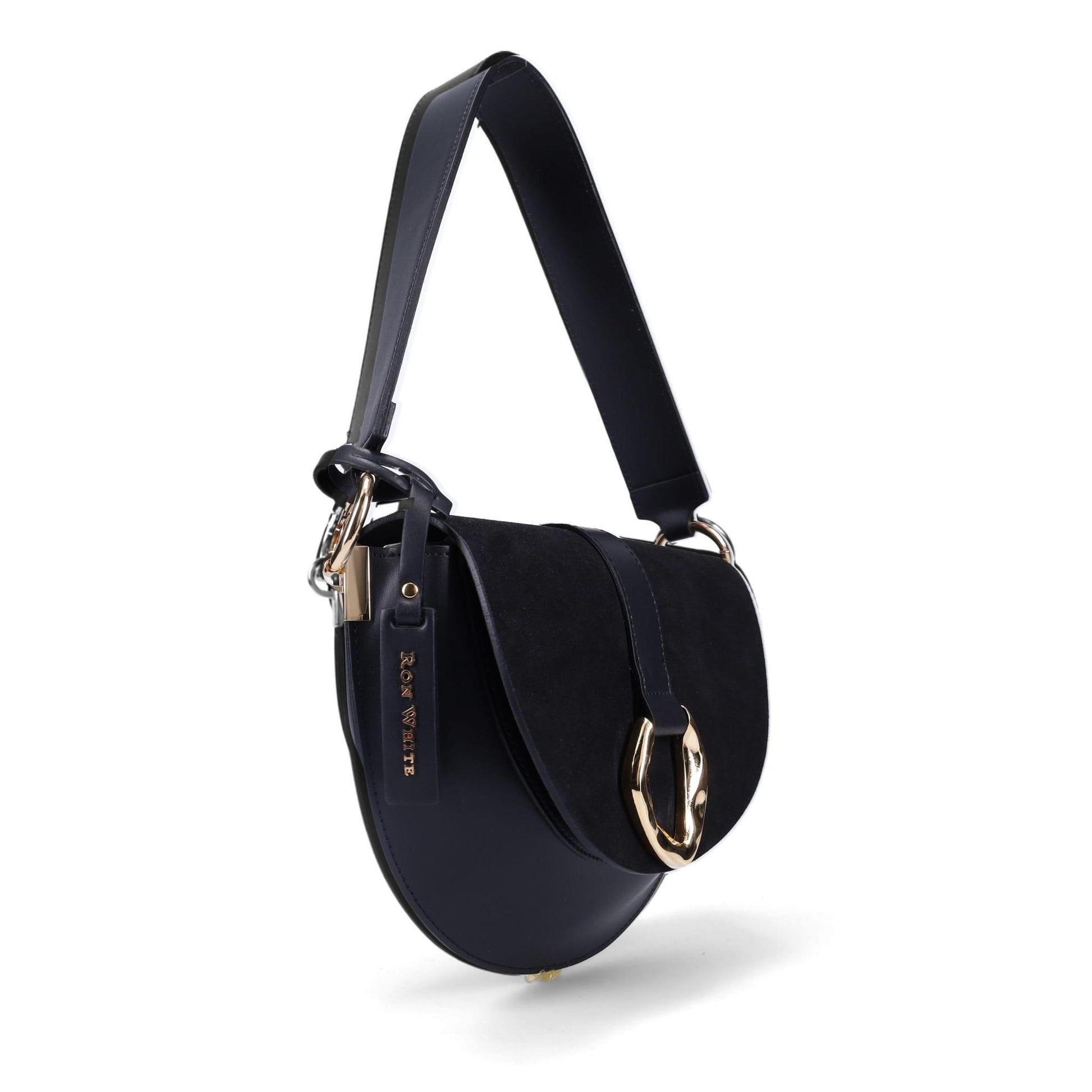 The Beckett Saddle Bag in Smooth Calf and Suede. Jewelry Grade Platino Hardware. Flap Over Magnetic Closure. Made in Italy.