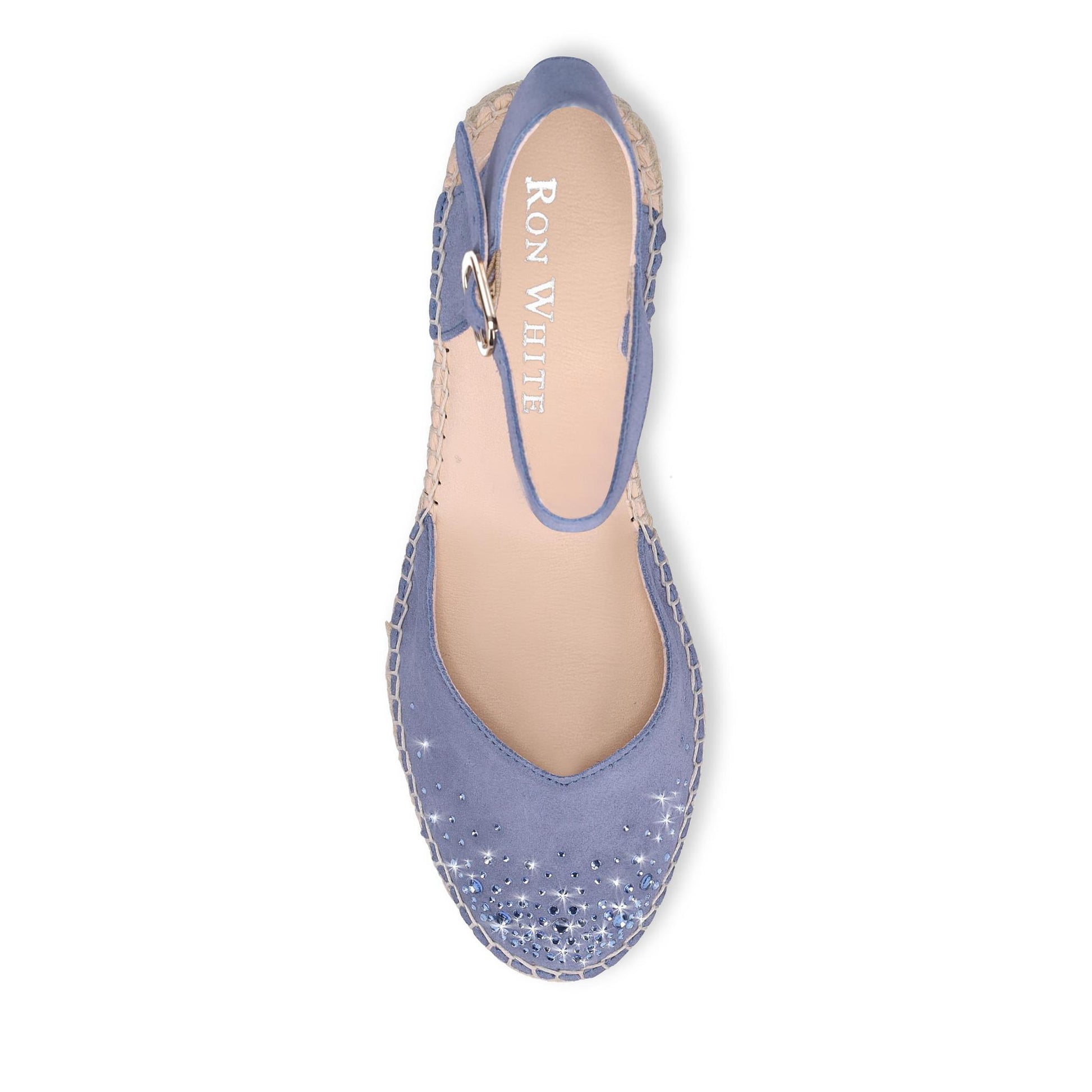 Breeza Espadrille Sandal in Suede with Crystal detail. Authentic espadrille platform. Ankle strap with adjustable buckle. Antibacterial microfiber lining. Anti-slip rubber outsole. Made in Spain.