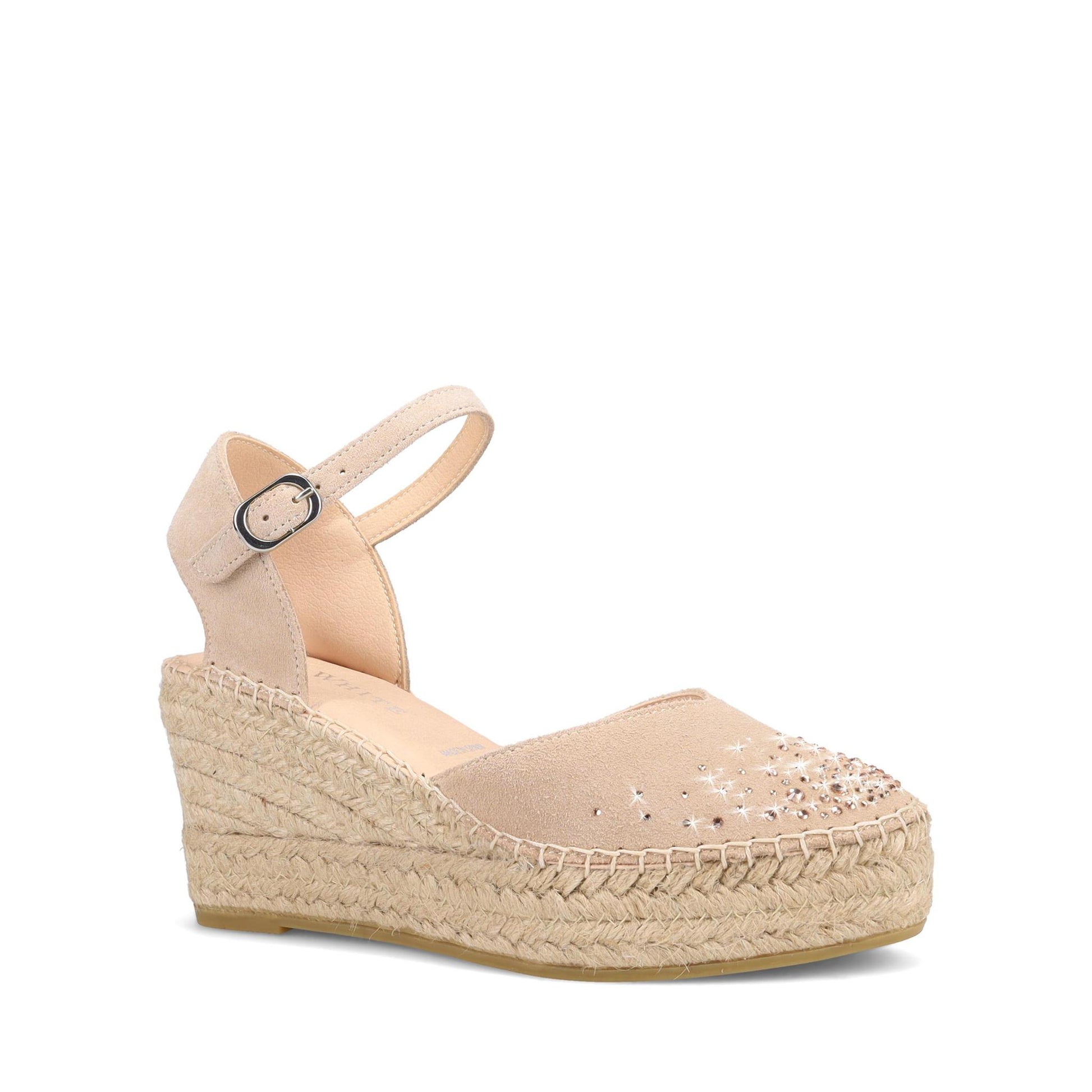 Breeza Espadrille Sandal in Suede with Crystal detail. Authentic espadrille platform. Ankle strap with adjustable buckle. Antibacterial microfiber lining. Anti-slip rubber outsole. Made in Spain.