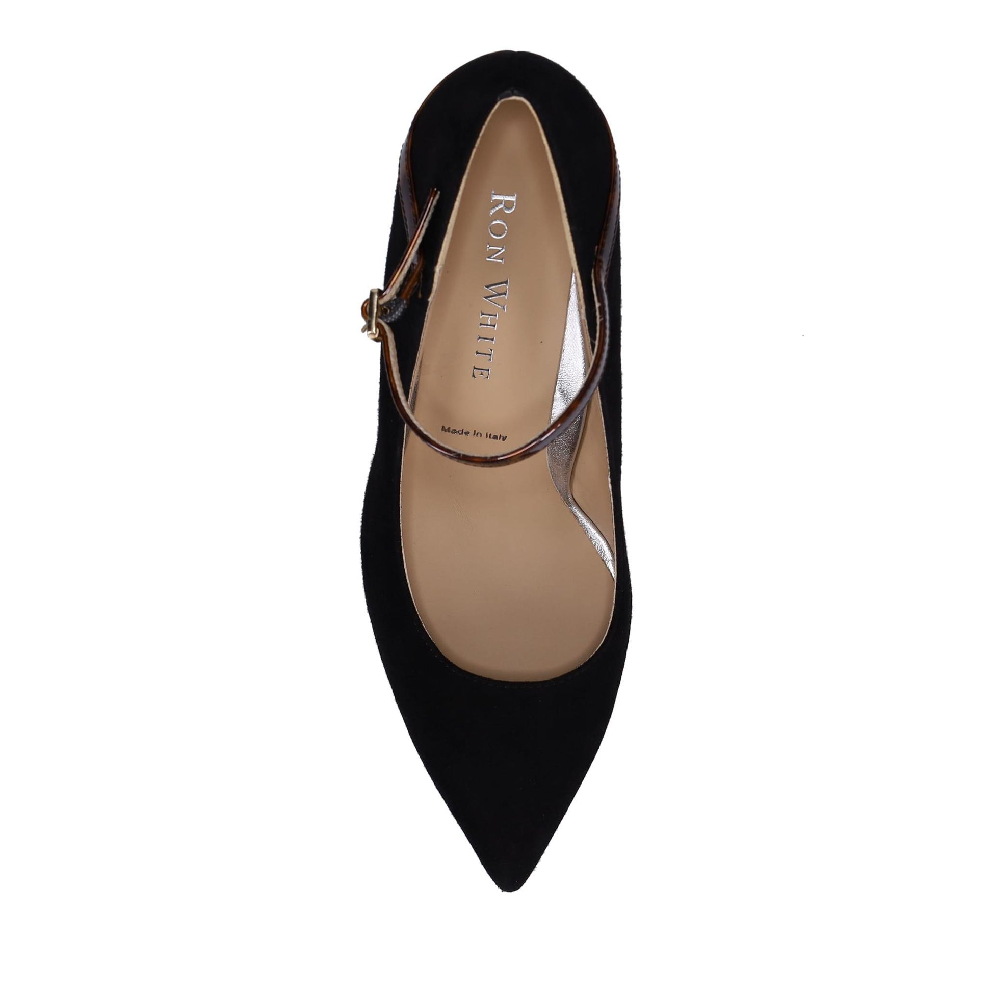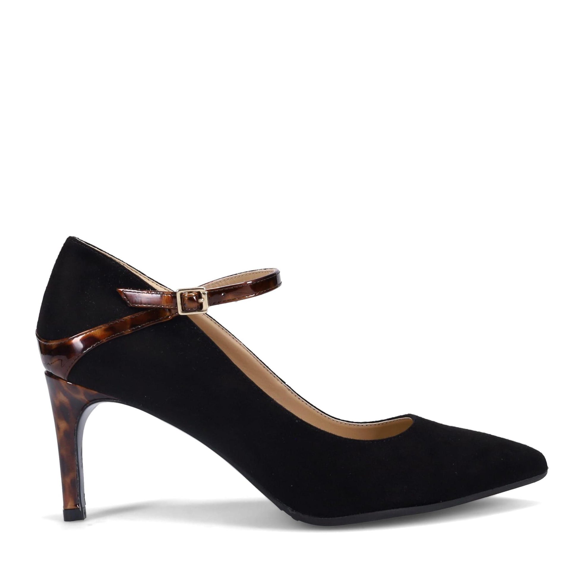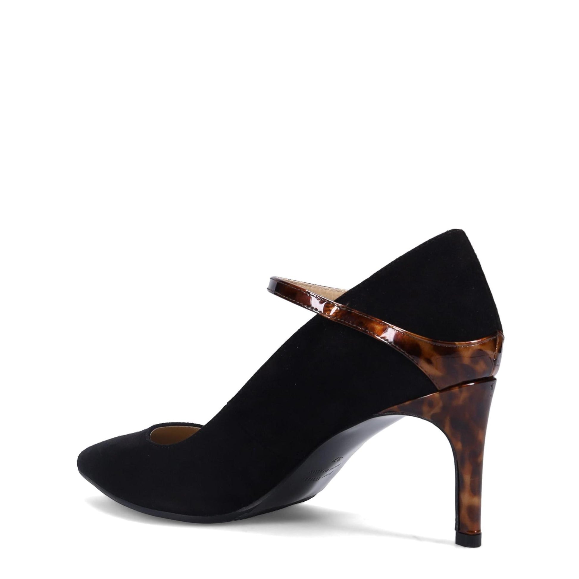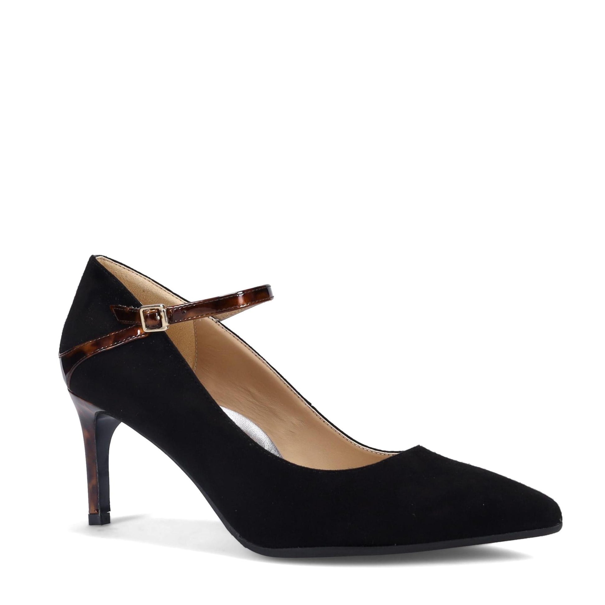 Caroline Maryjane Pump in Weatherproof Cashmere Suede. Tortoise Patent Wrapped Heel. Adjustable Buckle. Arch Support & Sumptuous Double Padding. Made in Italy.