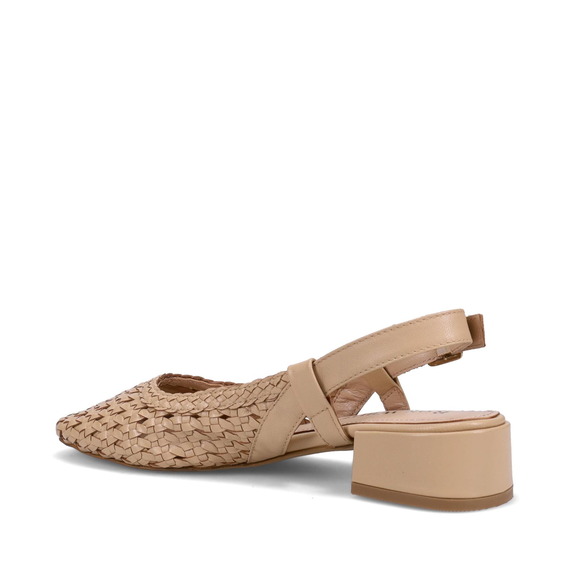 Coralie Slingback in Hand Woven Nappa. Adjustable Buckle. Memory foam padding. Leather with rubber outsole. Made in Italy.