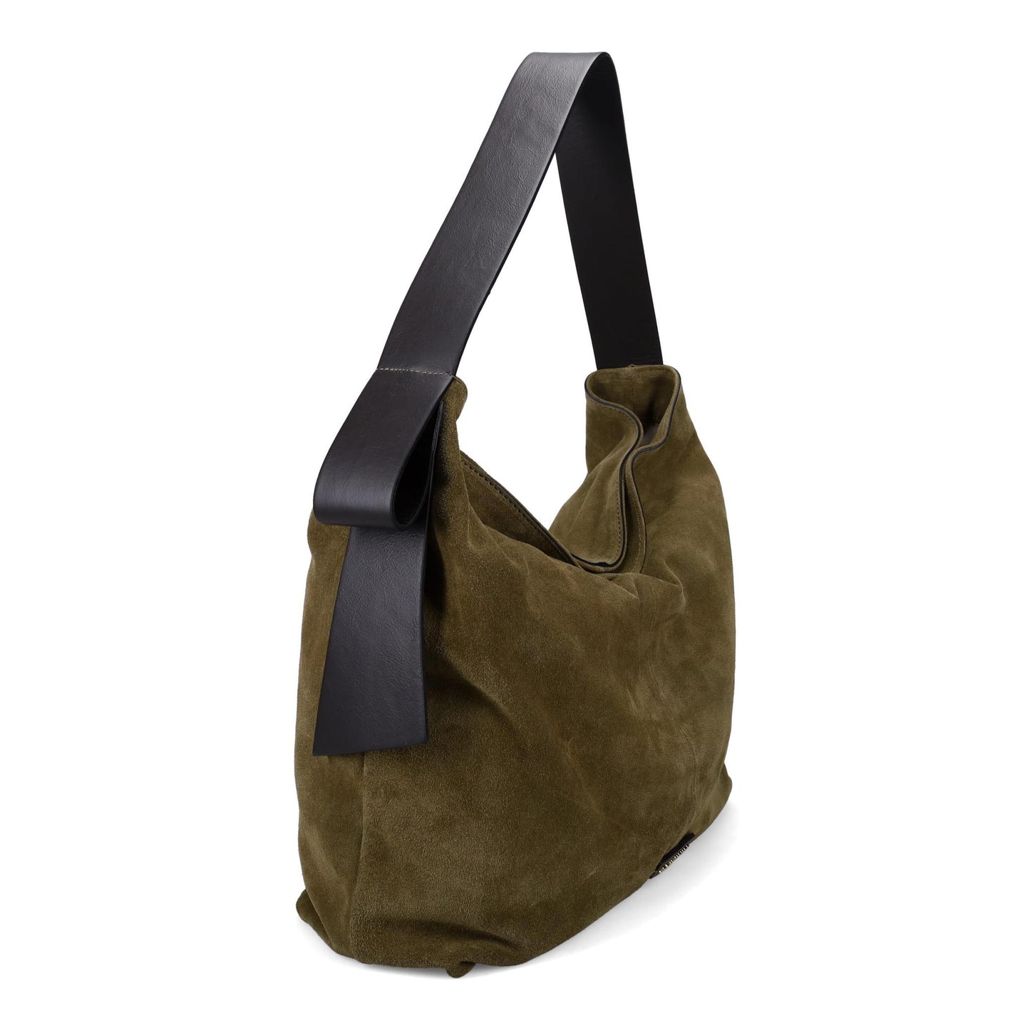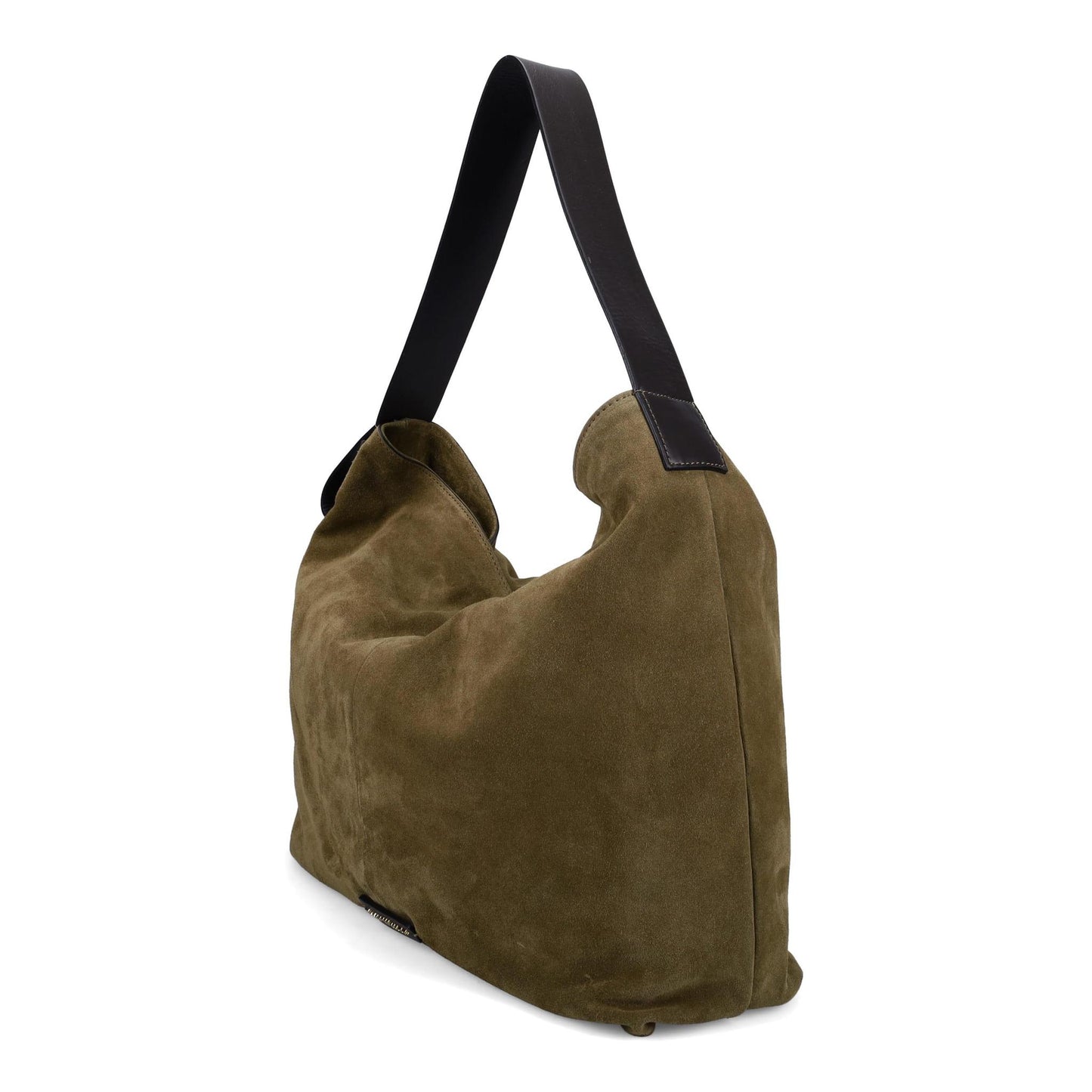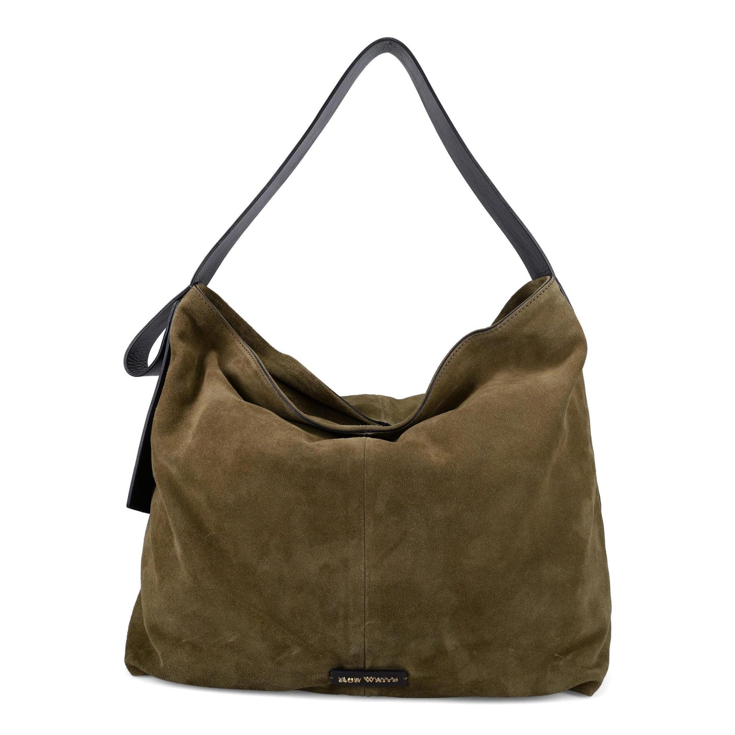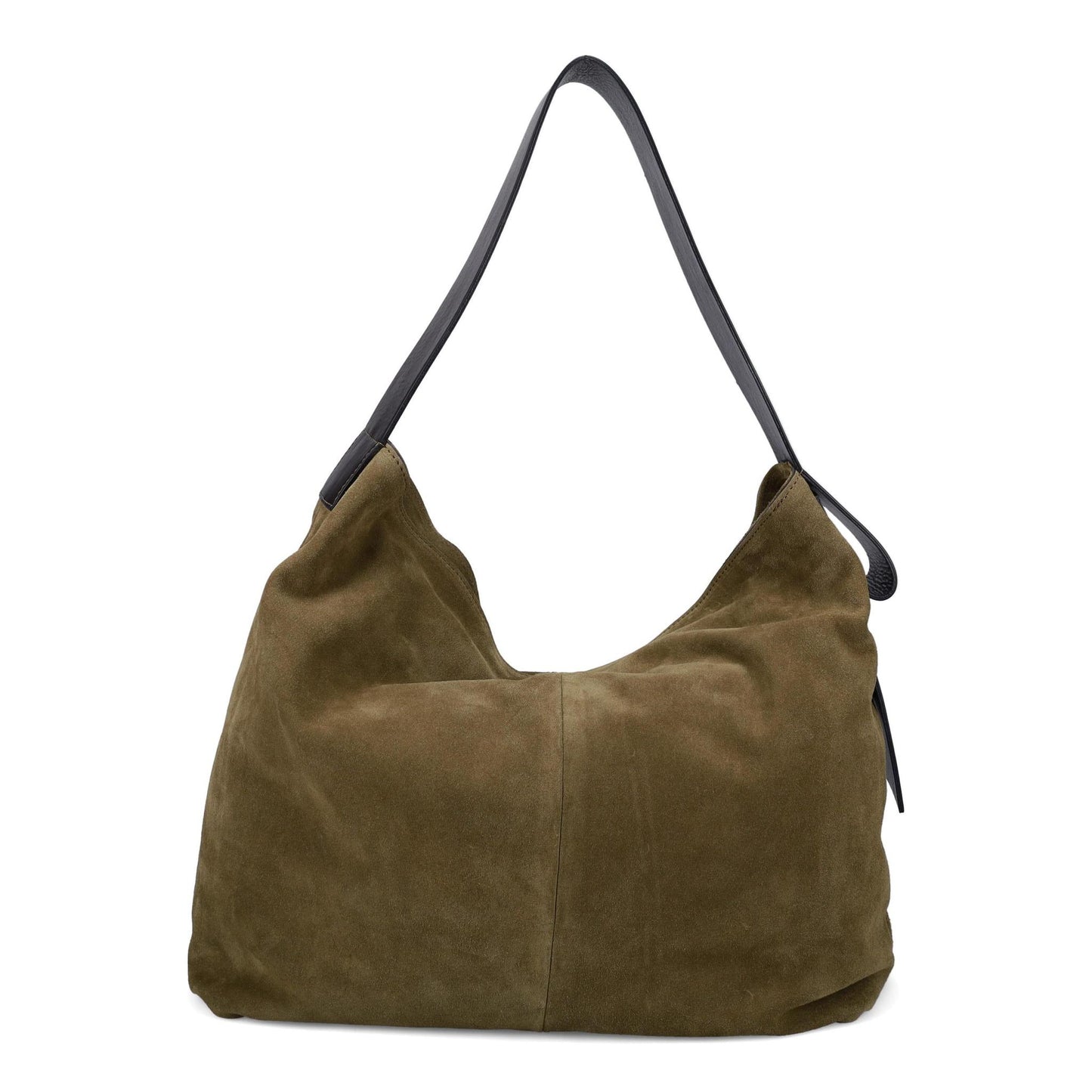 Doran Hobo in Oiled Suede with Calf Trim. Jewelry Grade Platino Hardware. Top Zip Closure. Made in Italy.