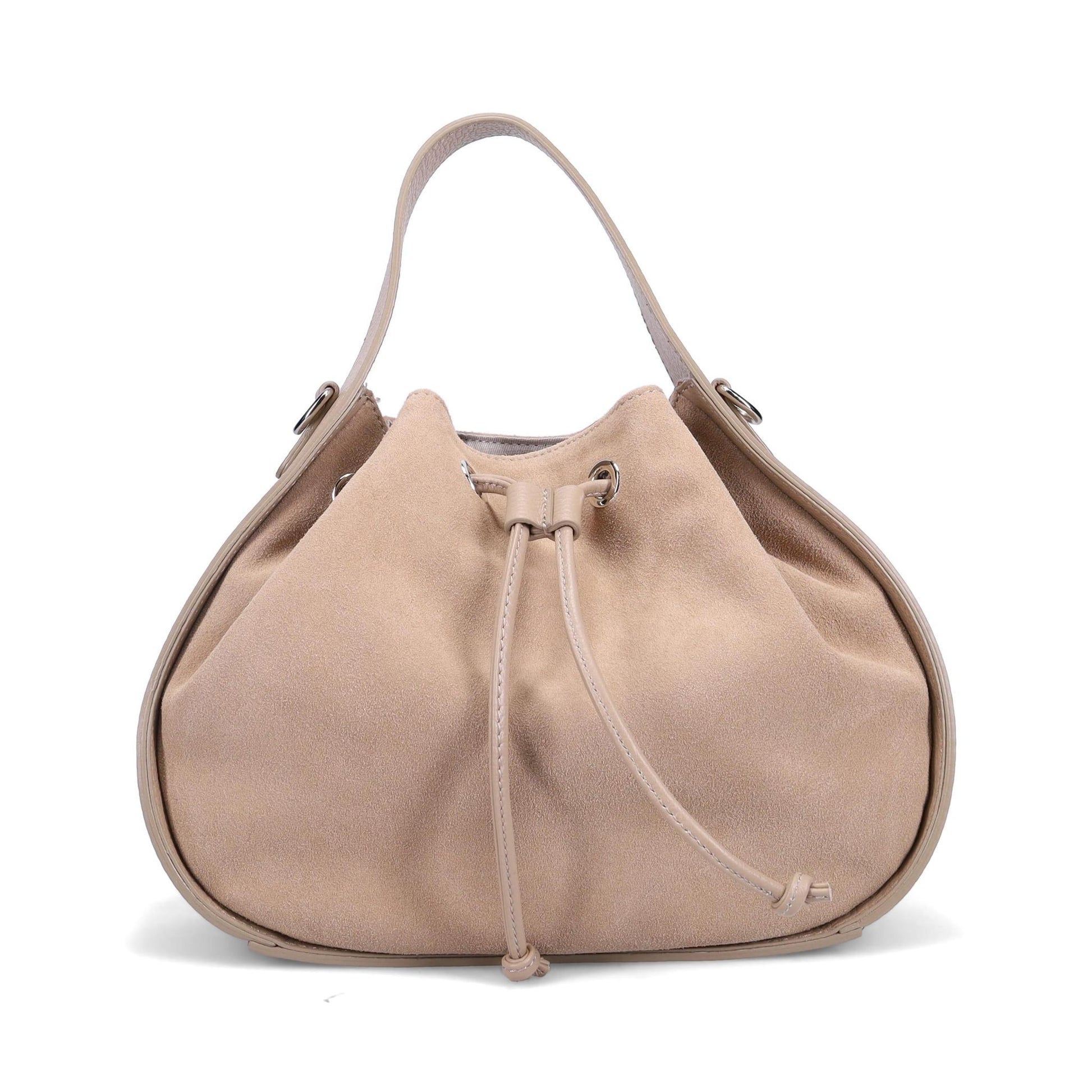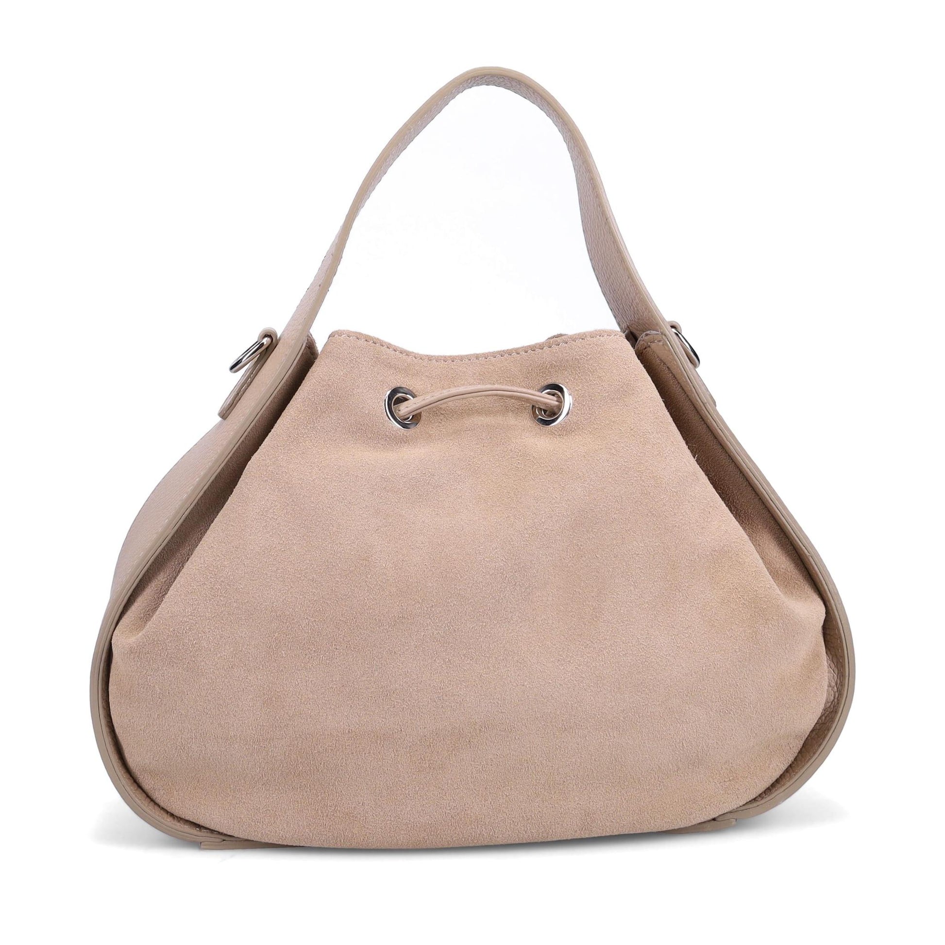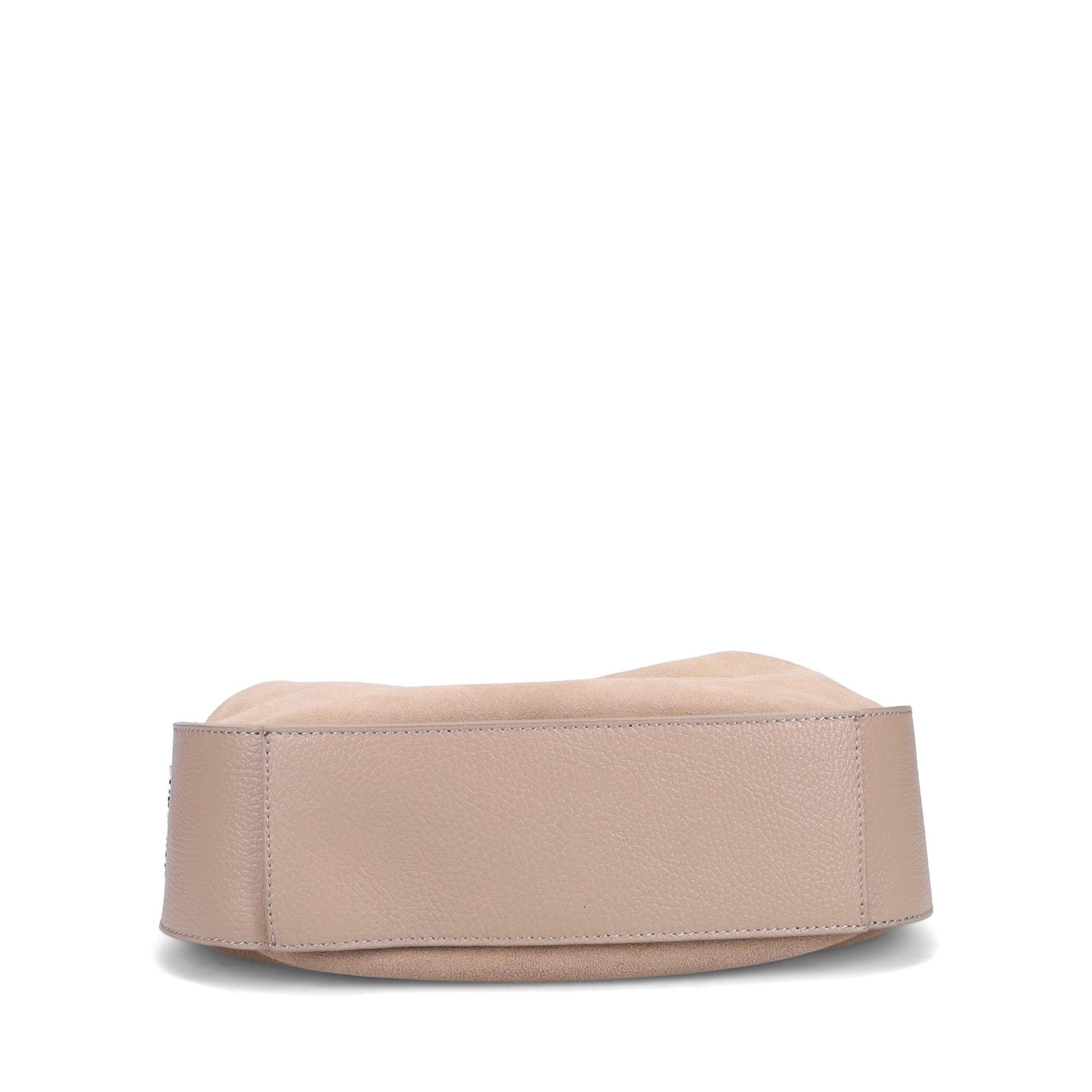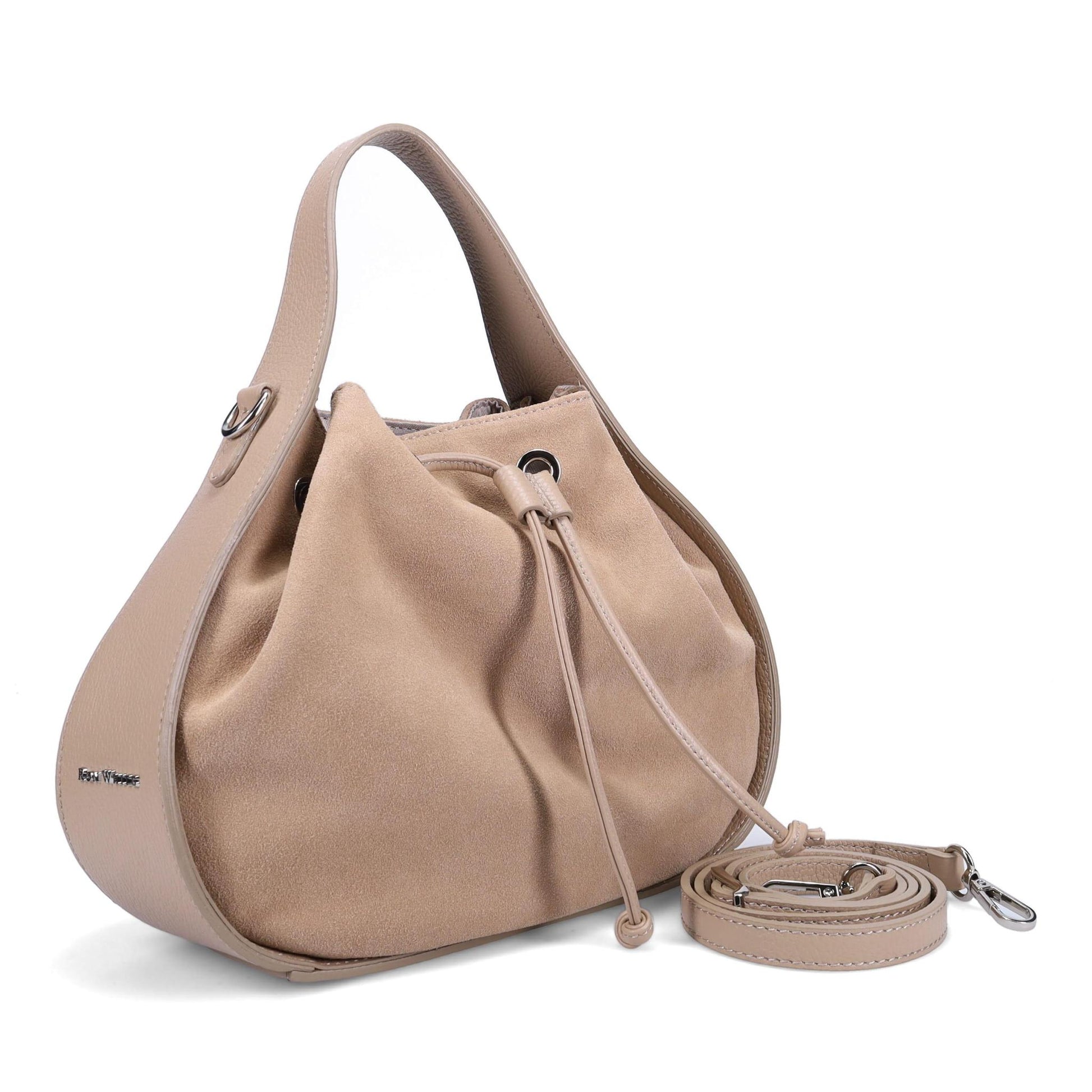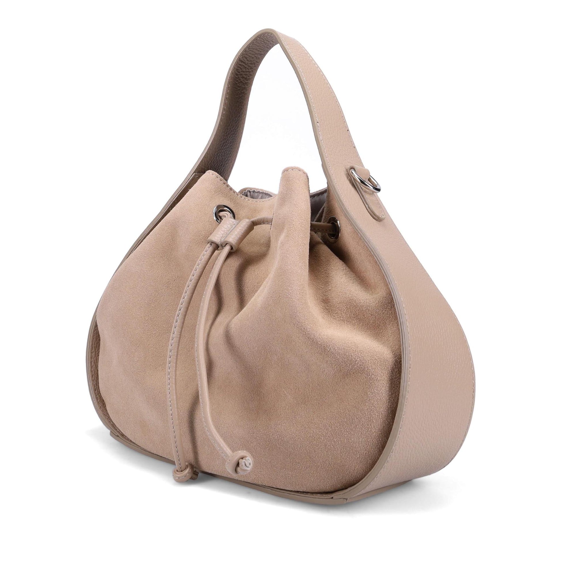 Doverly Hobo Bag in Suede and Tumbled Calf. Jewelry grade silver hardware. Drawstring closure. Made in Italy.
