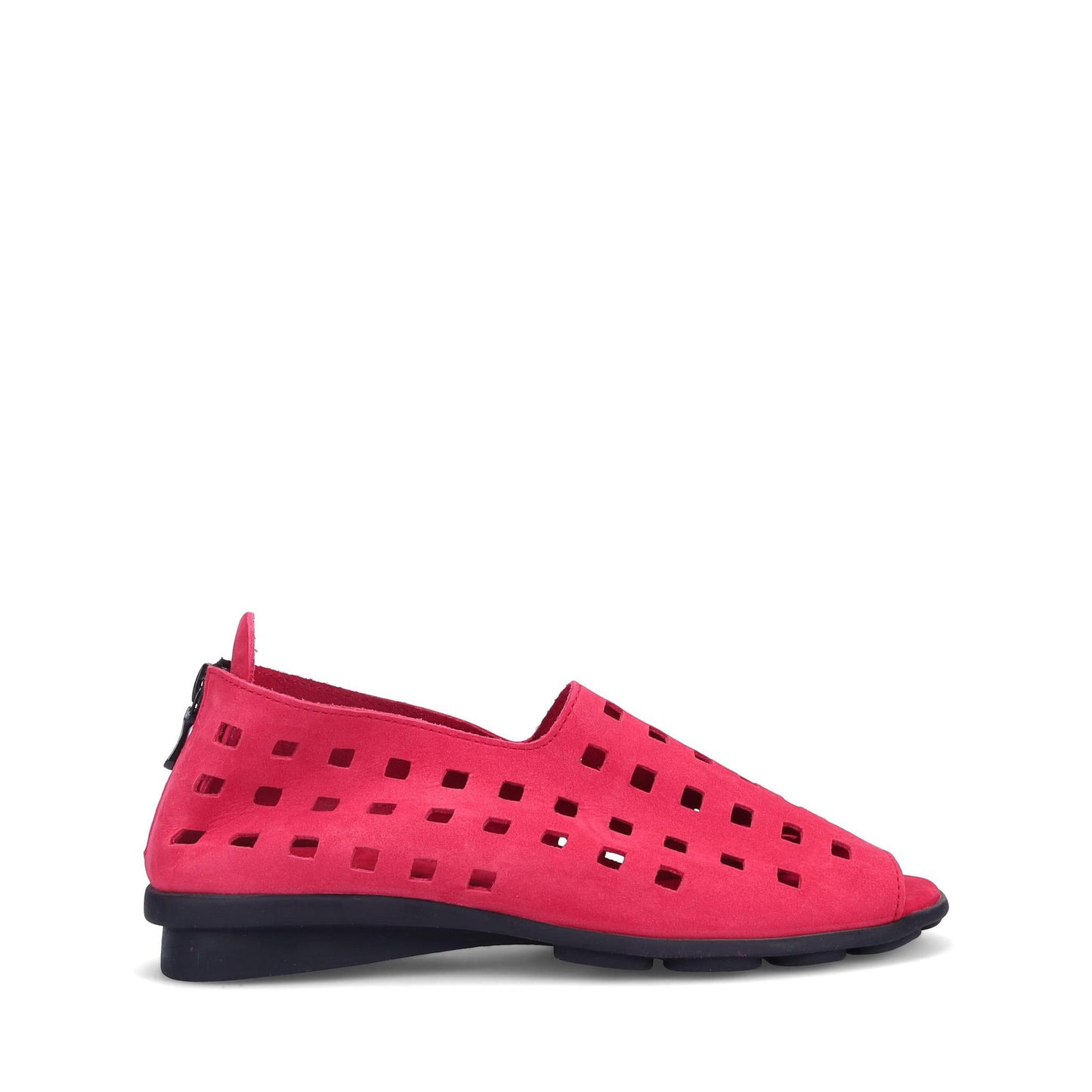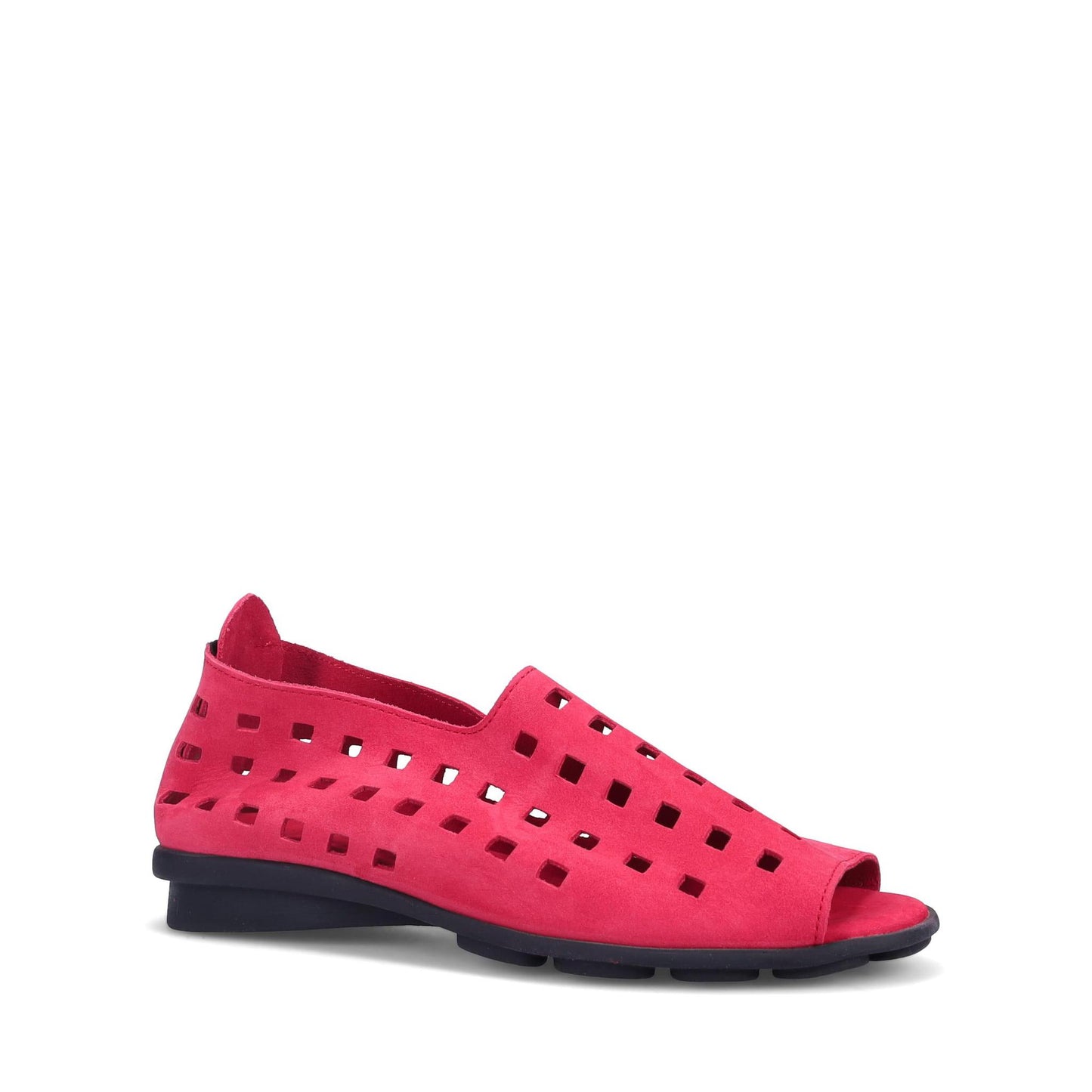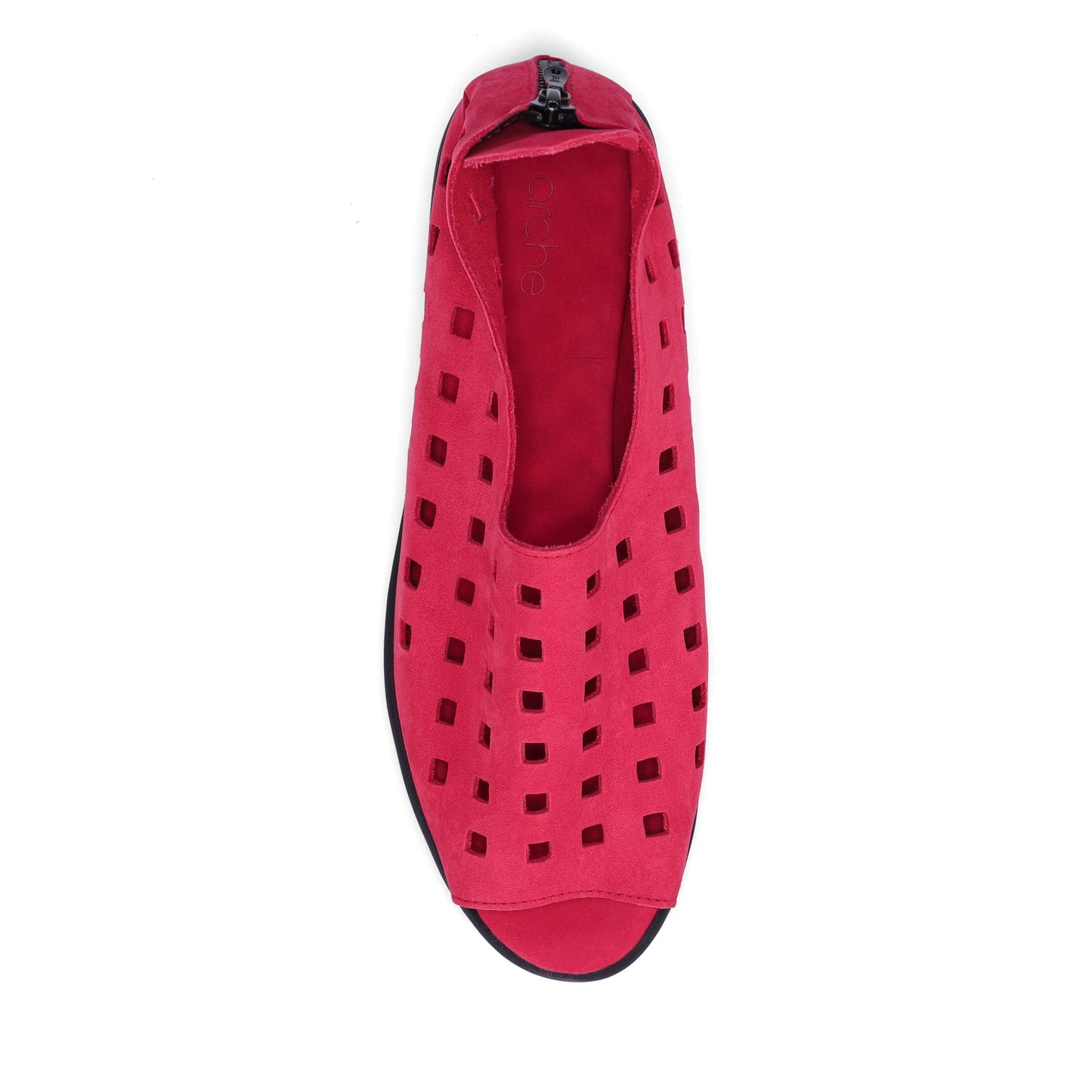 Arche Drick Peep-Toe Flat in Supple Unlined Nubuck. Geometric Cut-outs. Back Zipper. Natural Latex Cushioning. Made in France.