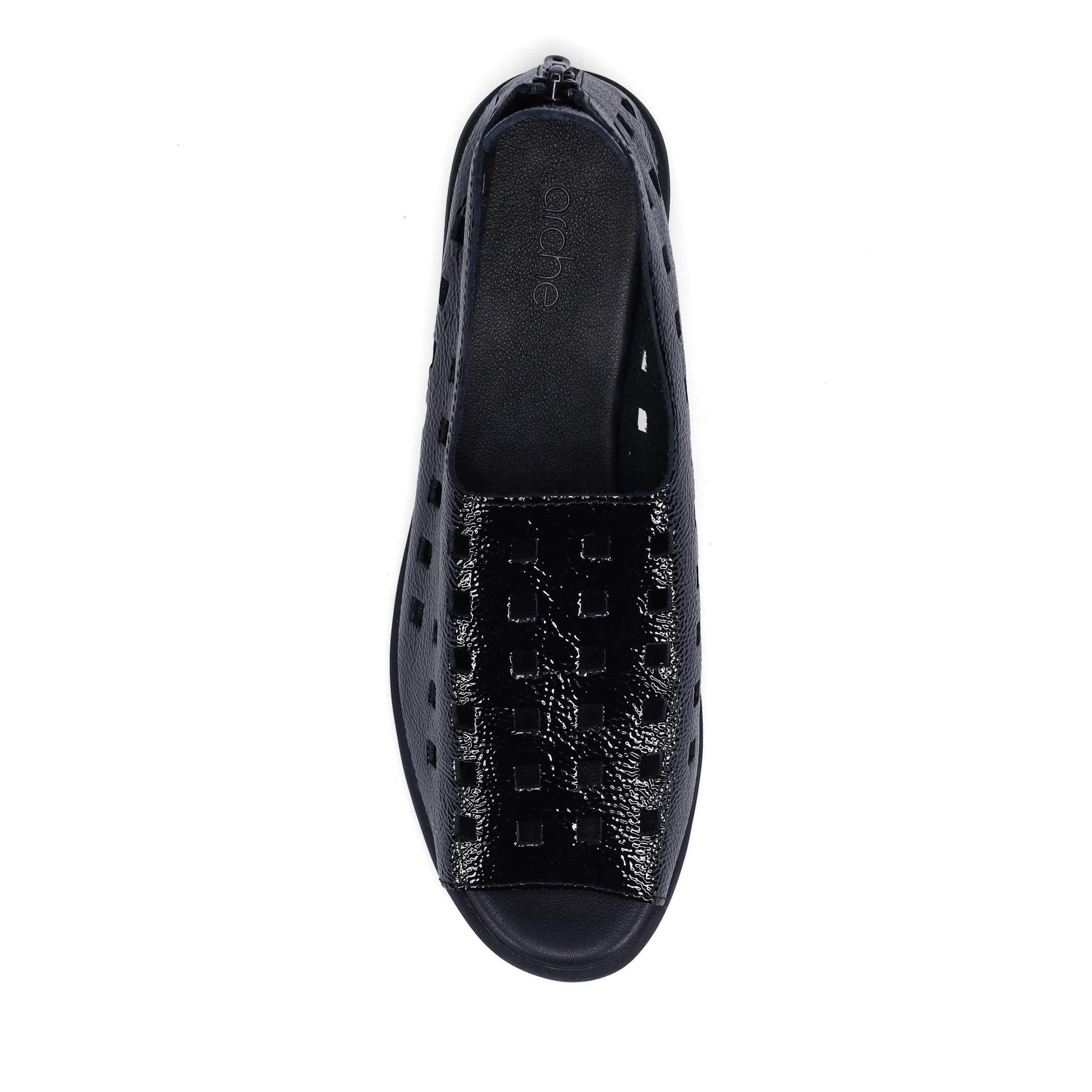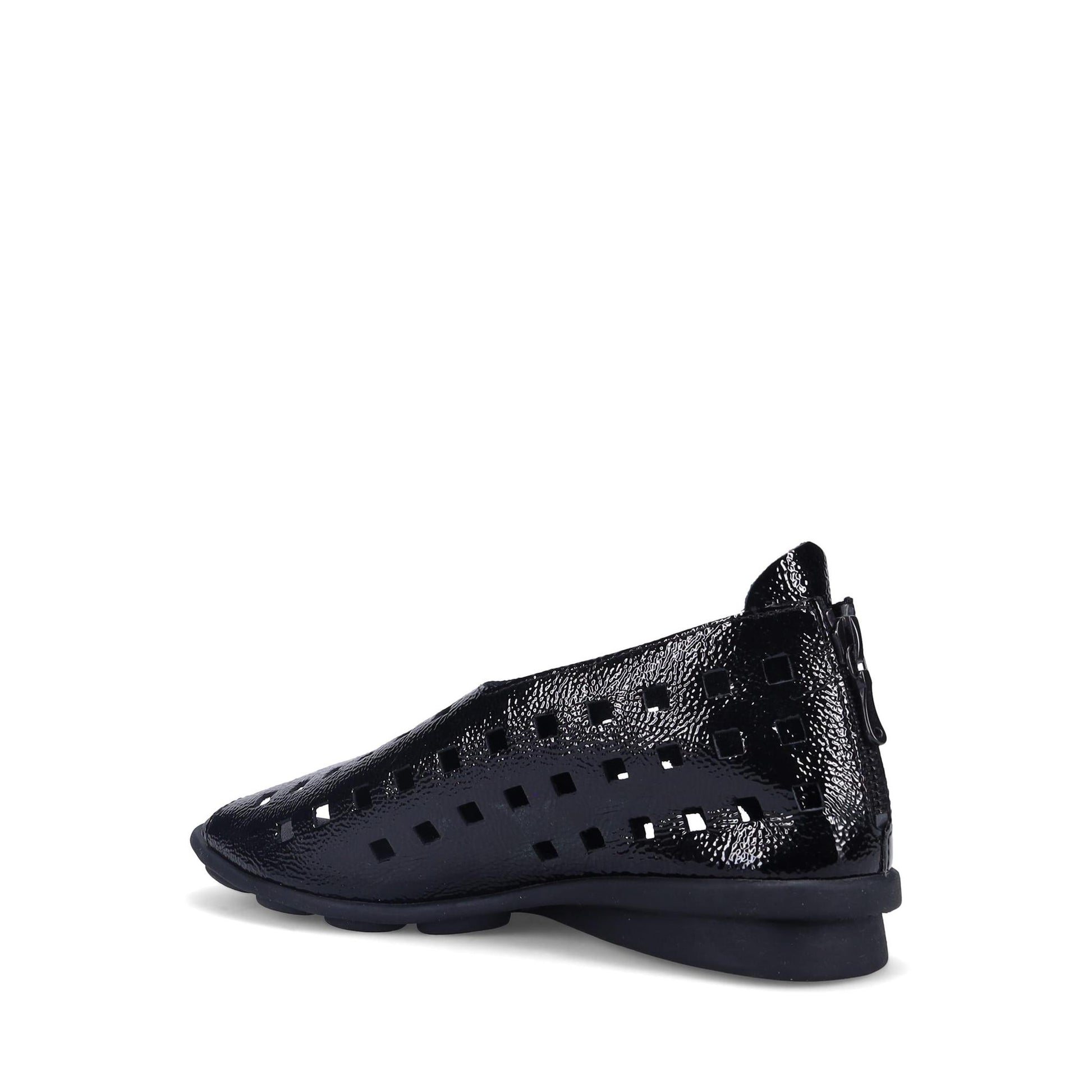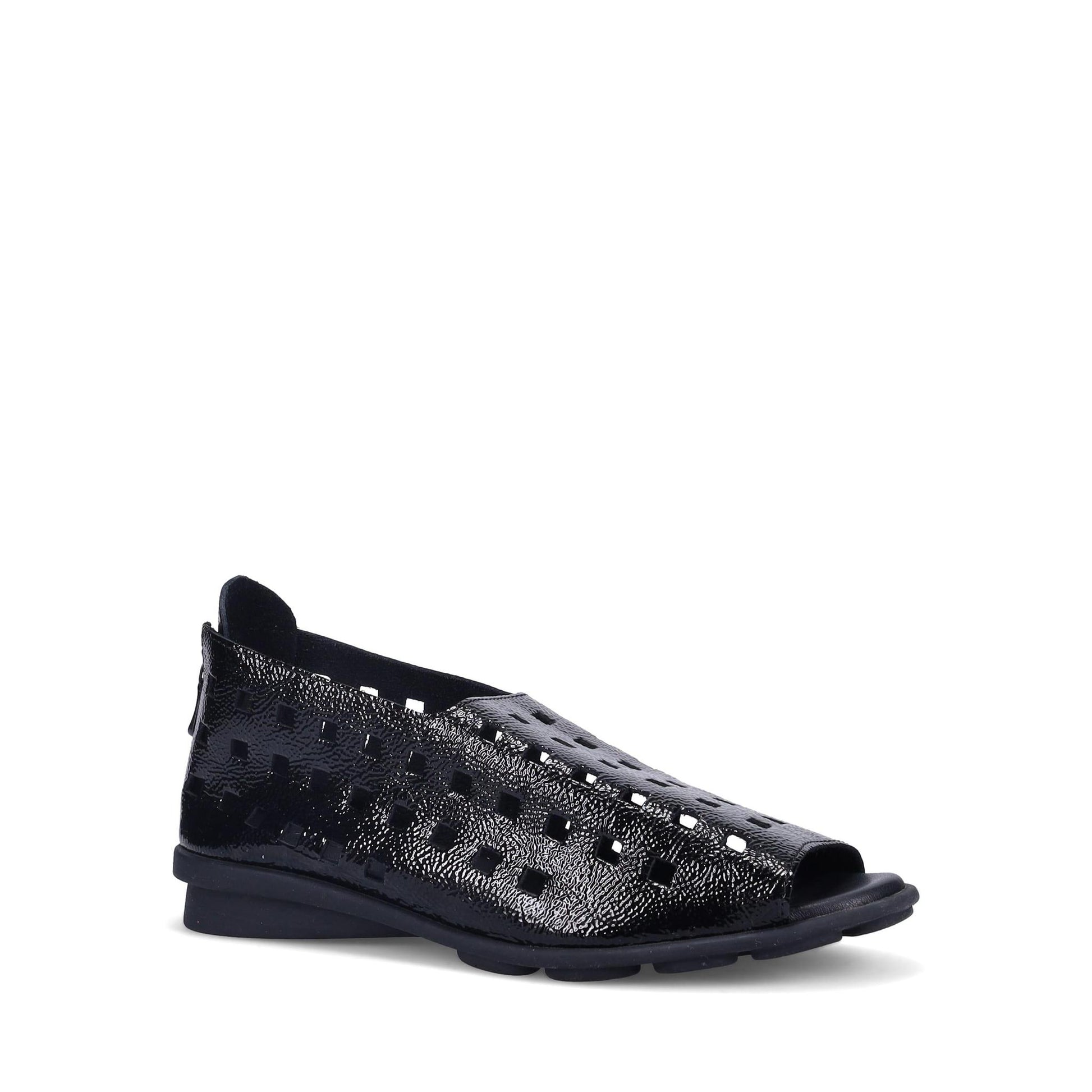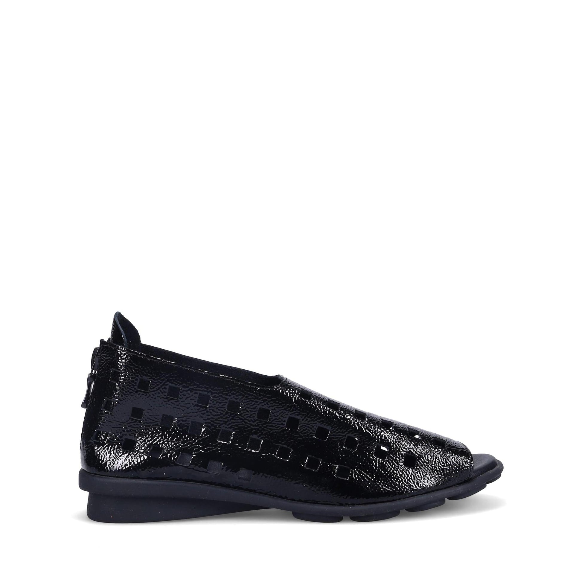 Arche Drick Peep-Toe Flat in Noir Supple Calfskin Patent Leather. Geometric Cut-outs. Back Zipper. Natural Latex Cushioning. Made in France.