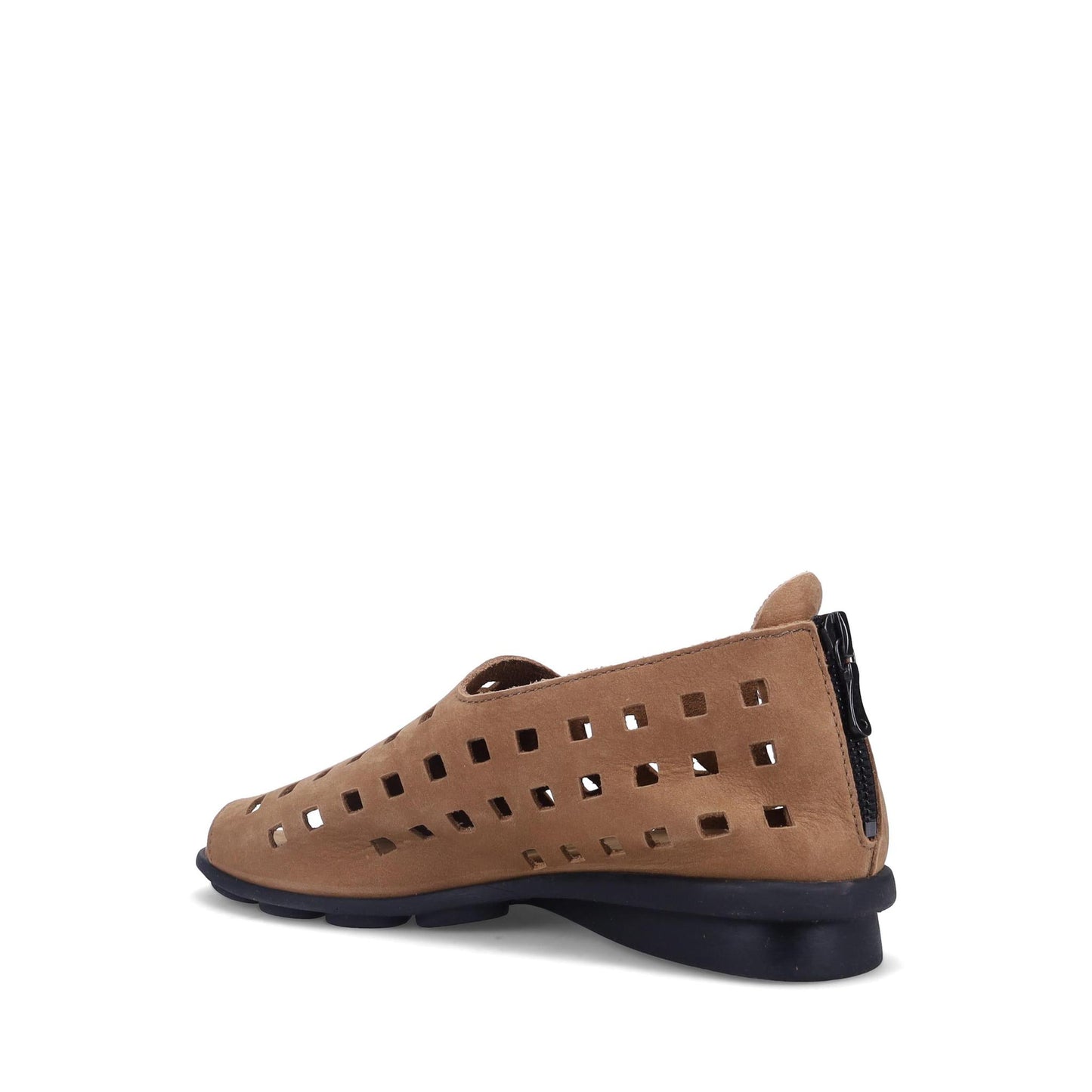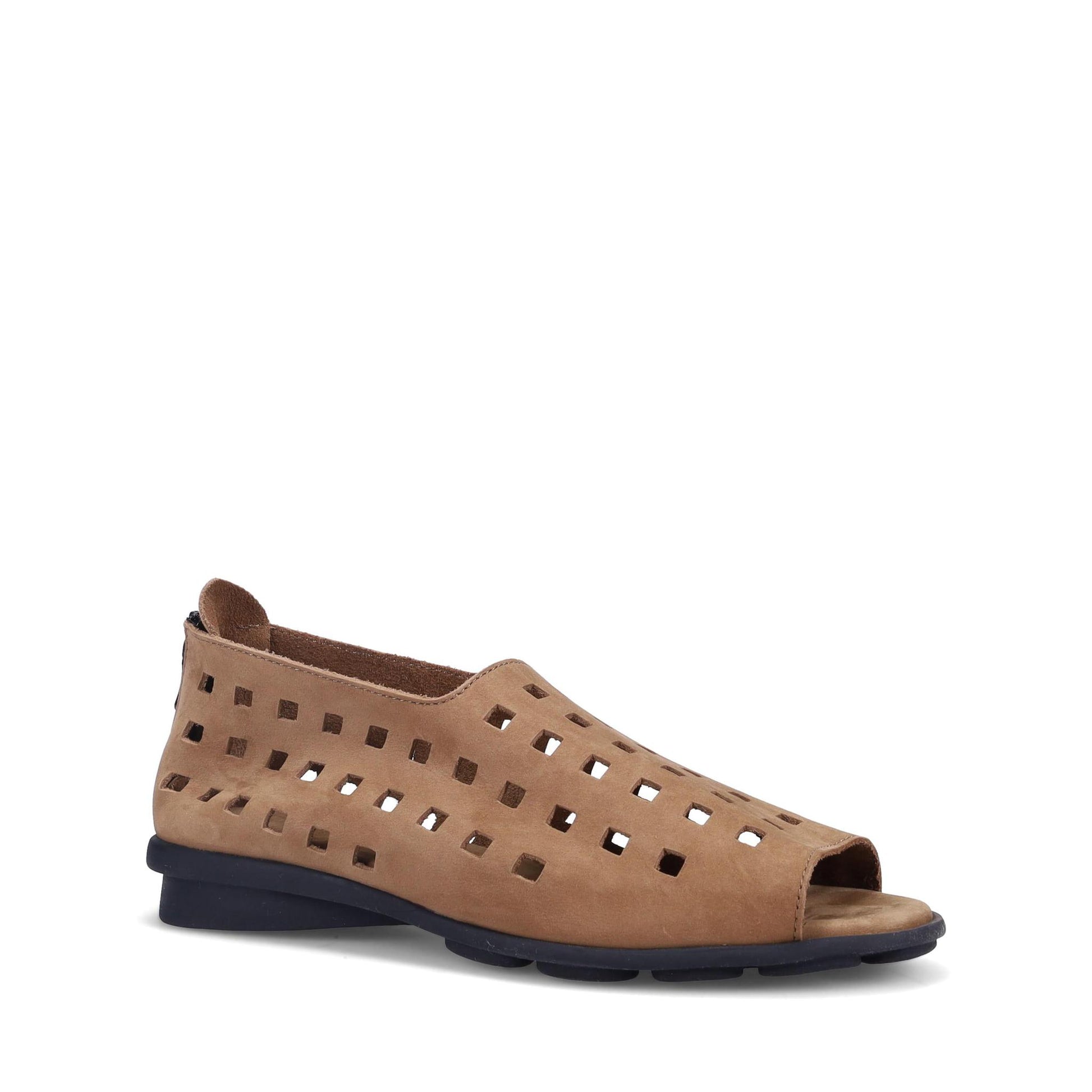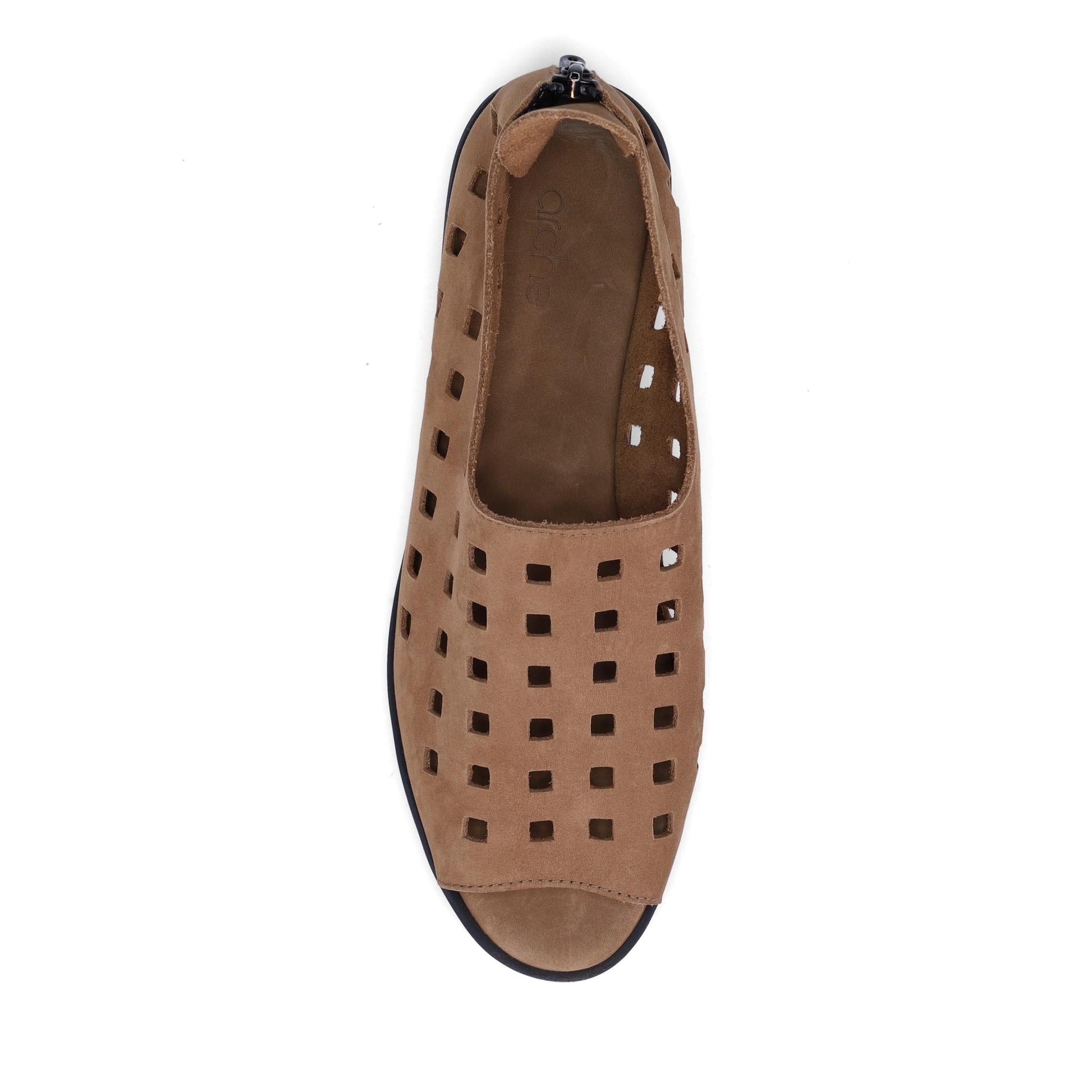 Arche Drick Peep-Toe Flat in Supple Unlined Nubuck. Geometric Cut-outs. Back Zipper. Natural Latex Cushioning. Made in France.