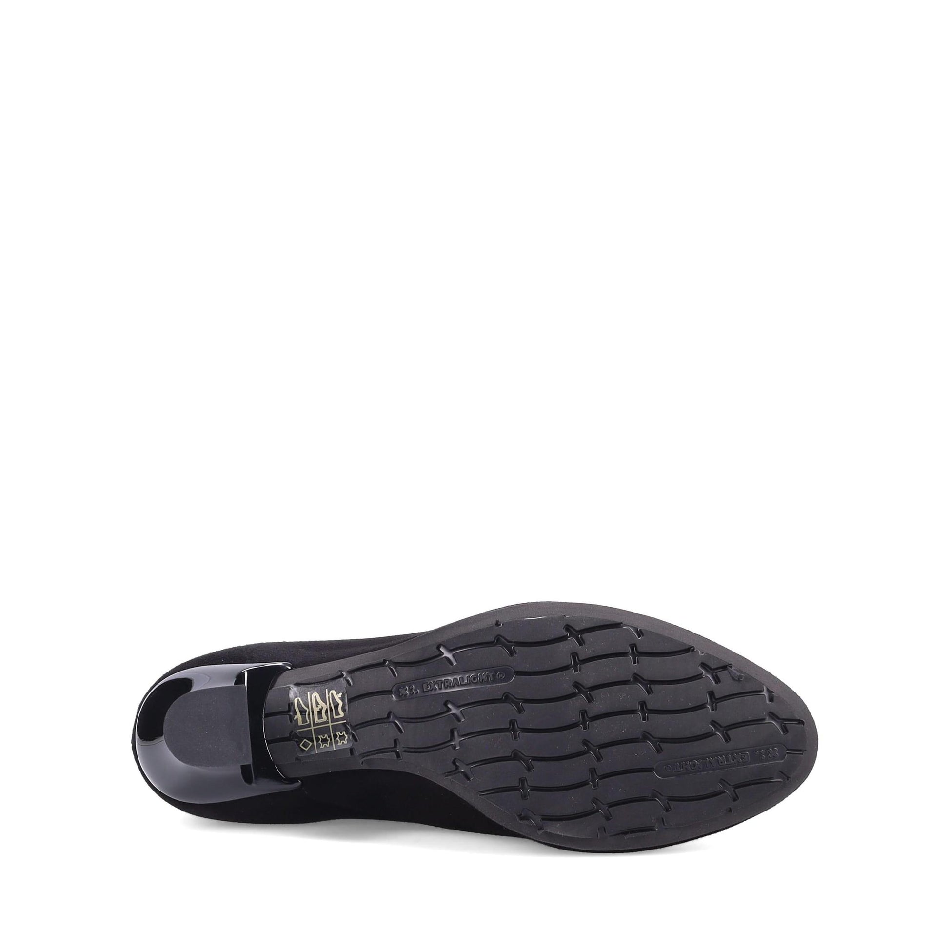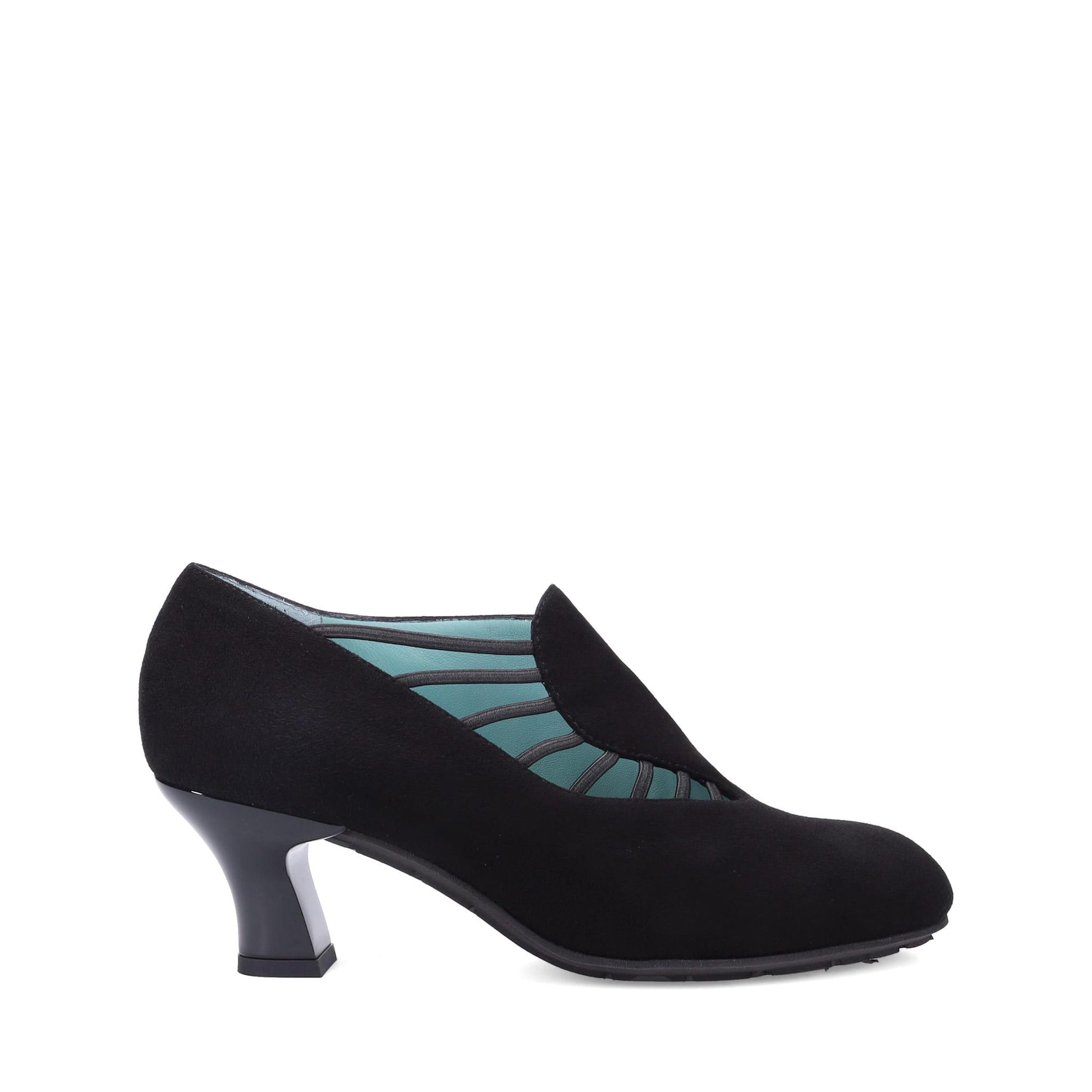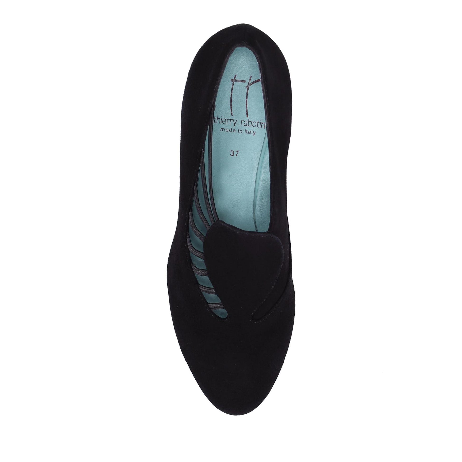 Thierry Rabotin Drosera Pump. Black Soft Suede with Elastic Detail. Nappa Wrapped Heel. Leather and Rubber Outsole. Made in Italy.