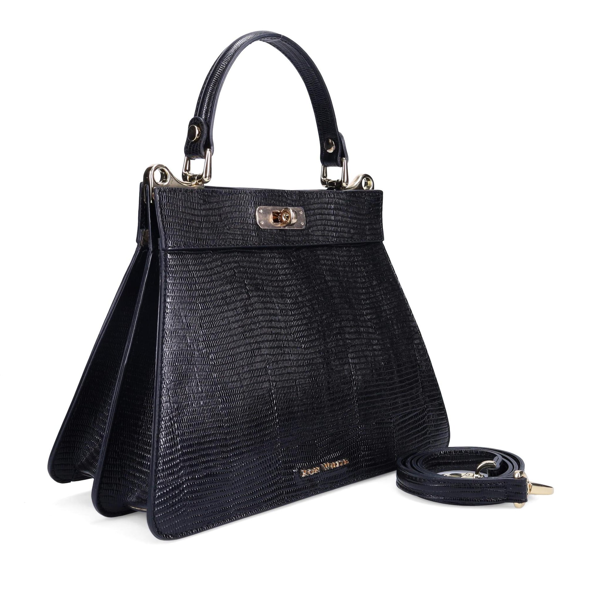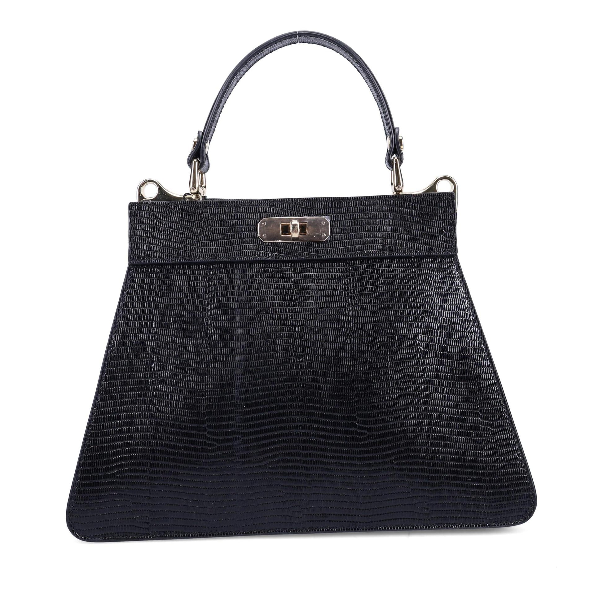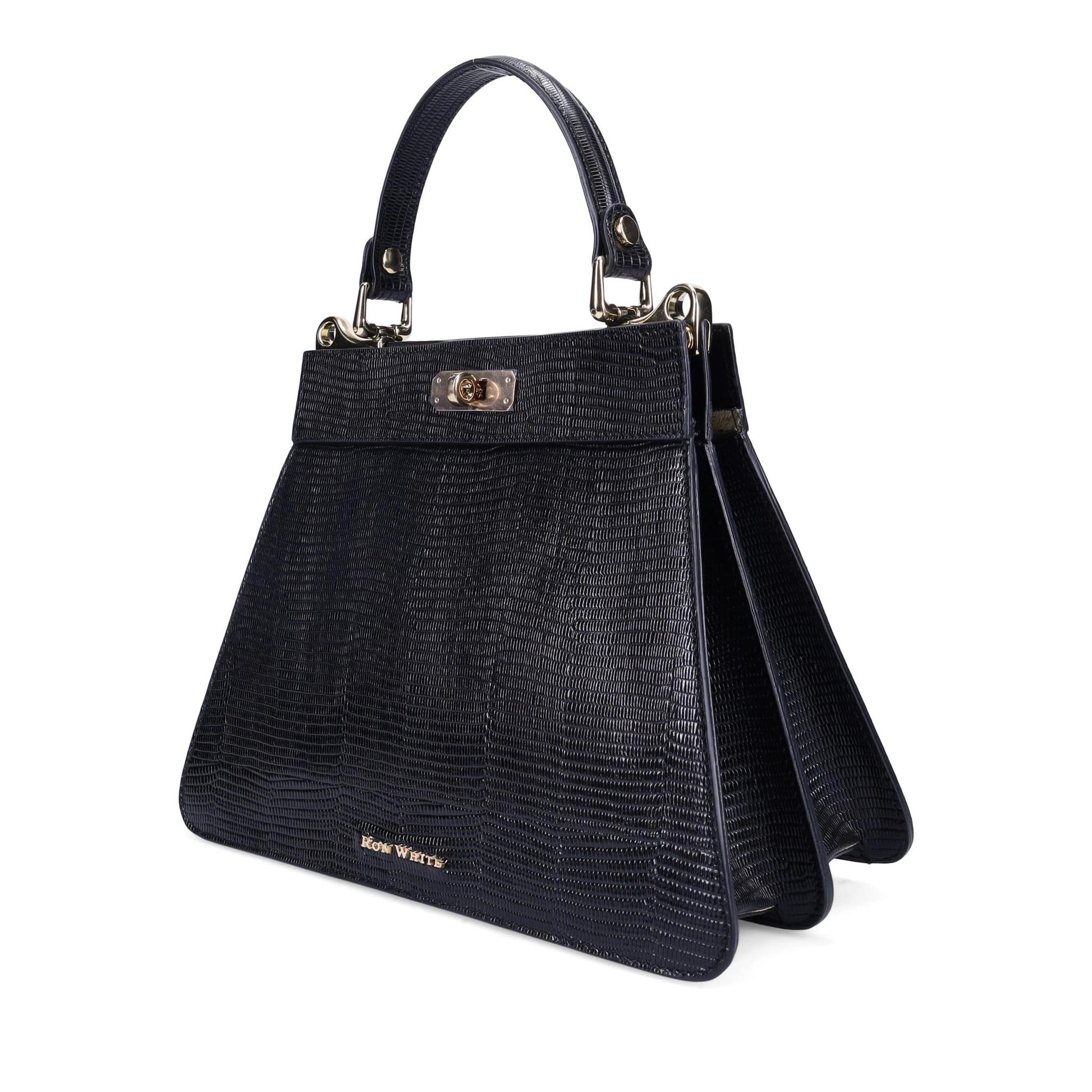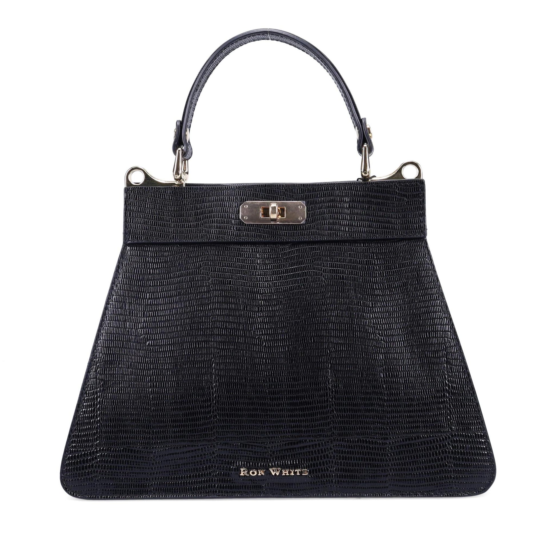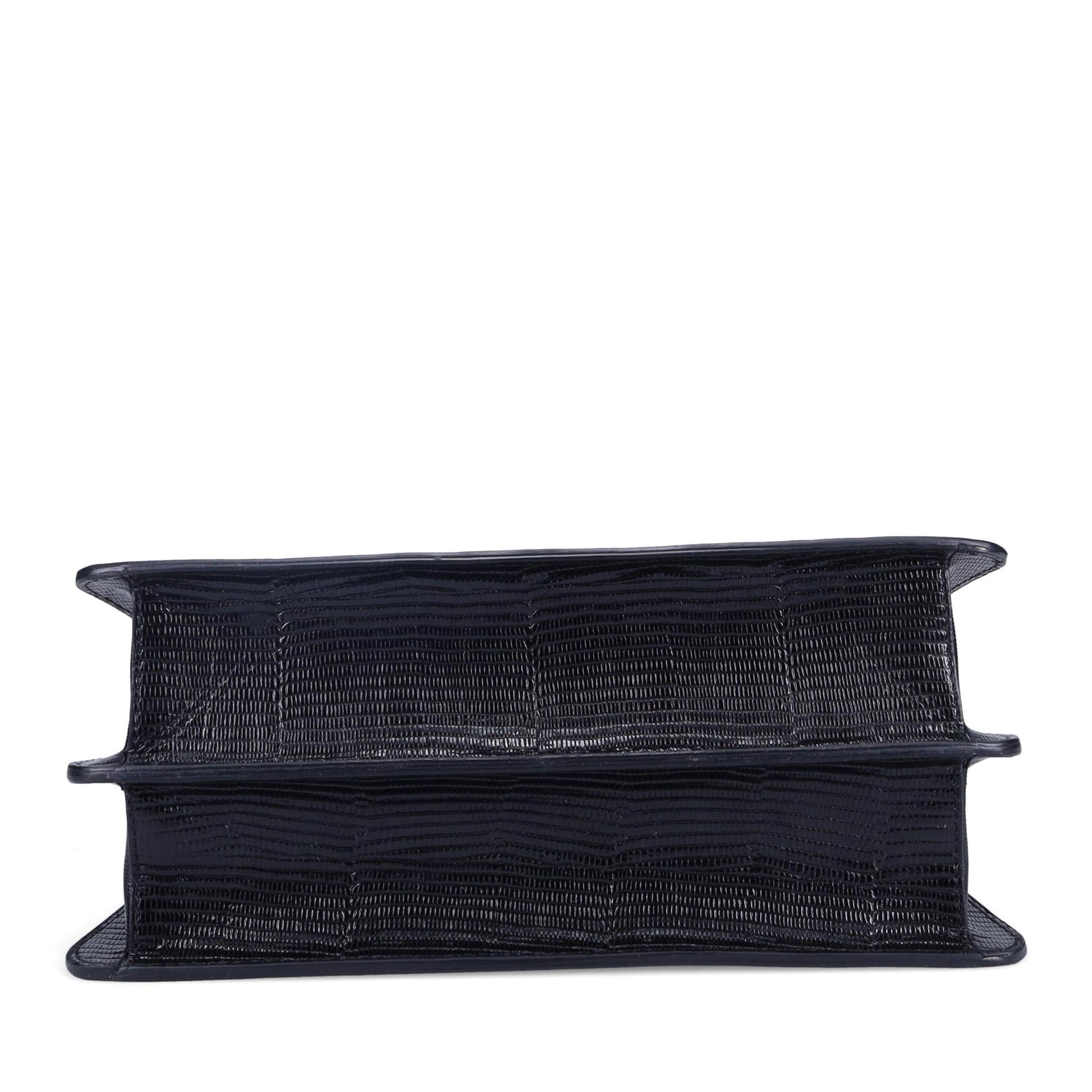 Duchess Structured Handbag in Lizar Printed Calf. Jewelry Grade Platino Hardware. Two main sections with dual lock closure. Made in Italy.