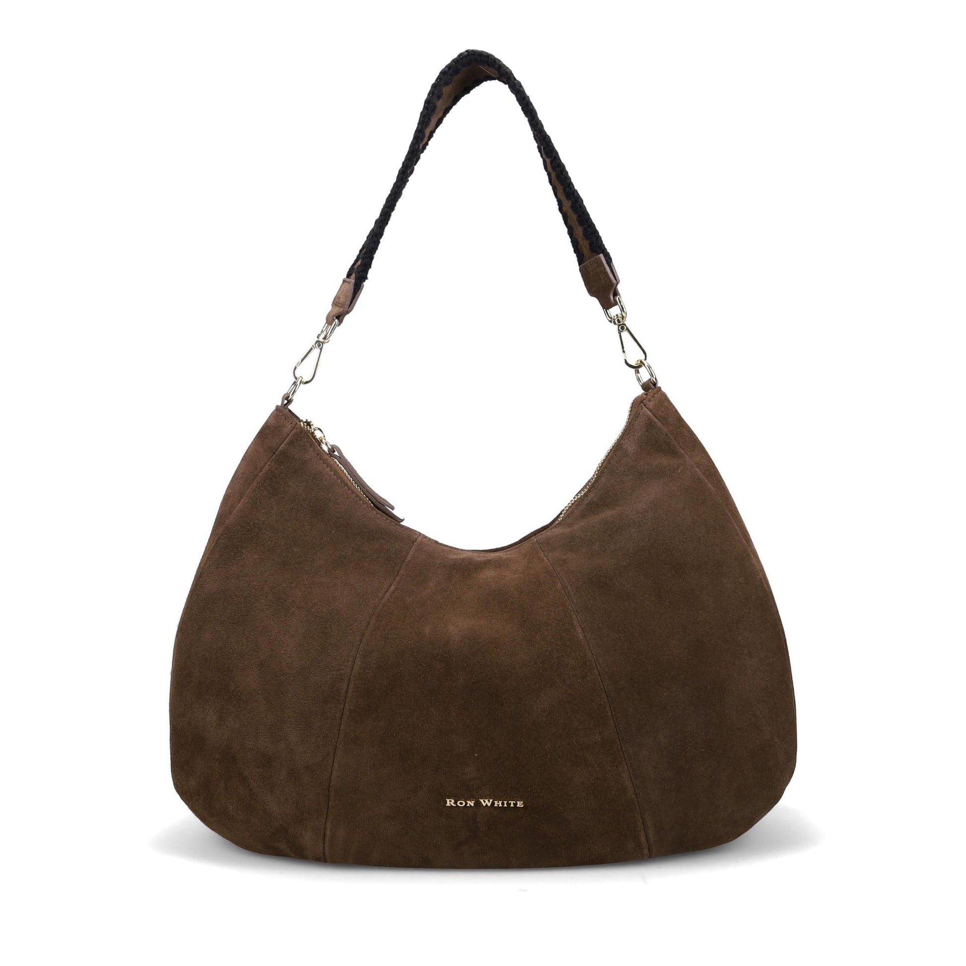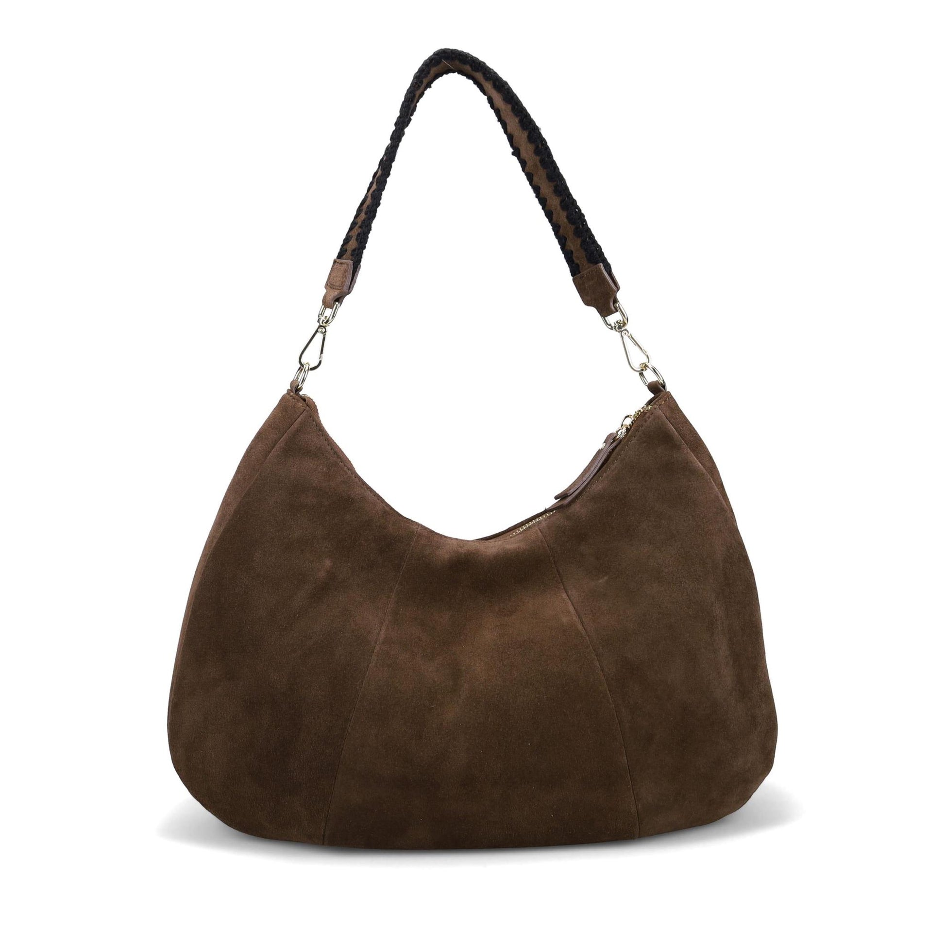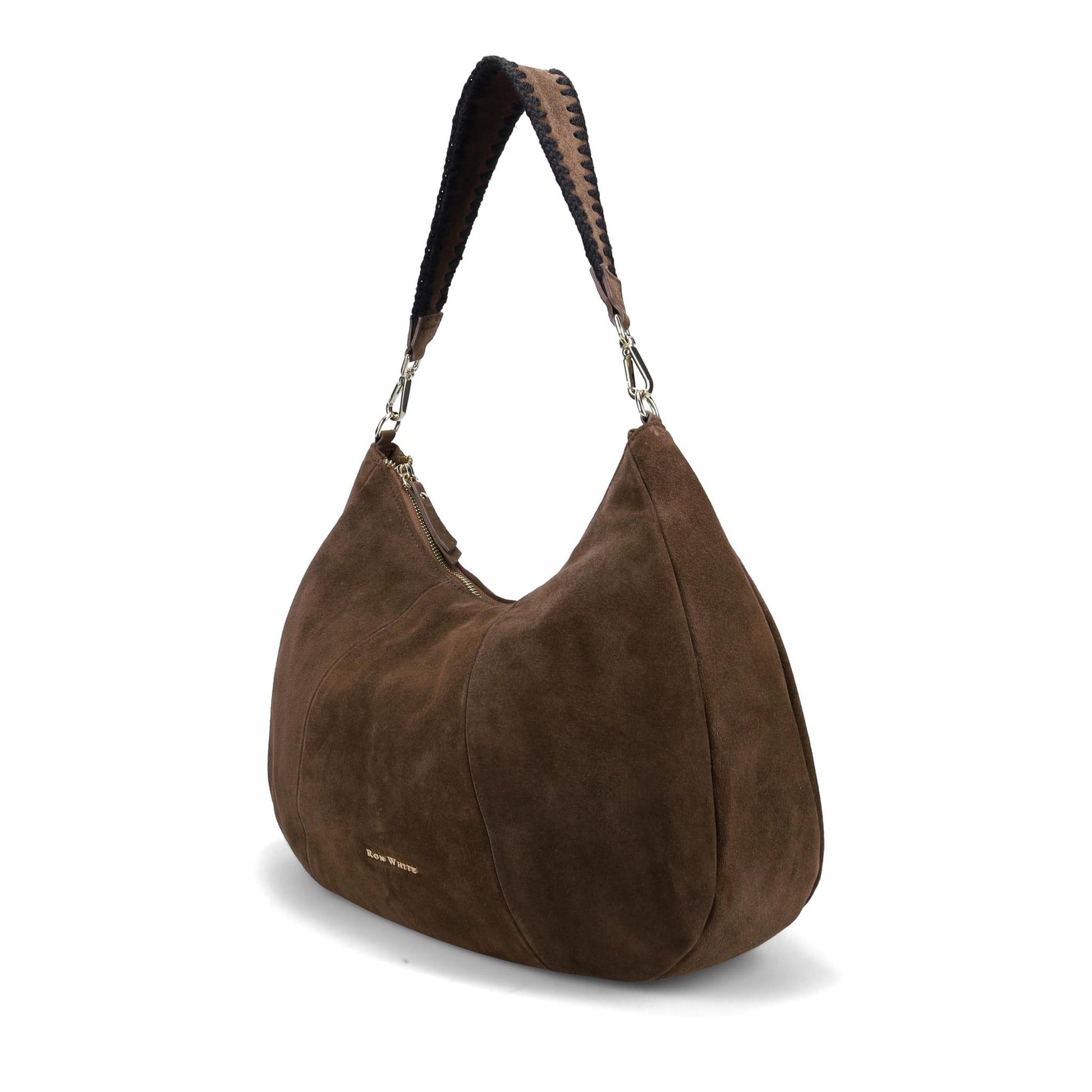 Dunfield Hobo in Oiled Suede with Lambs Wool Whipstitch detail. Jewelry Grade Platino Hardware. Top Zip Closure. Made in Italy.