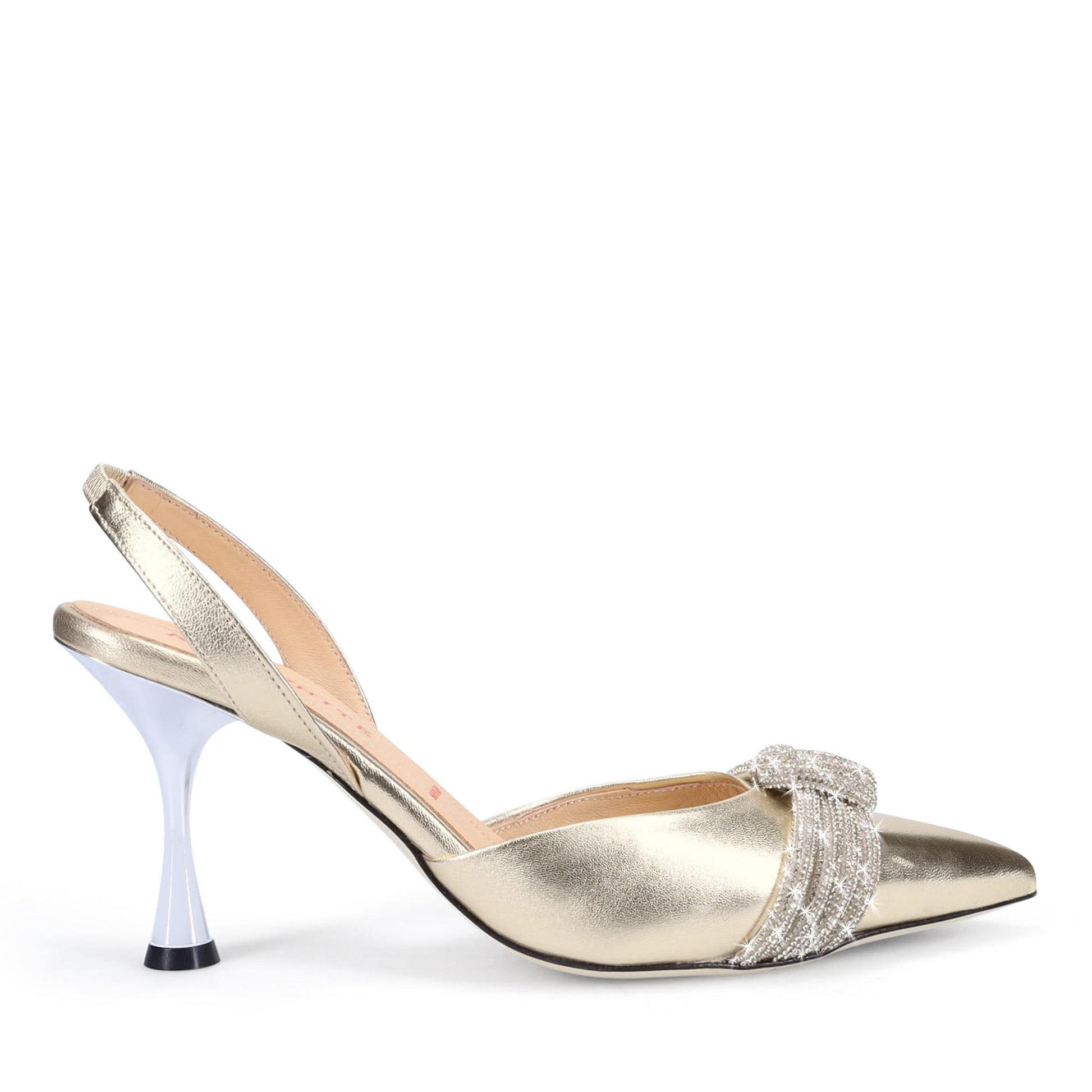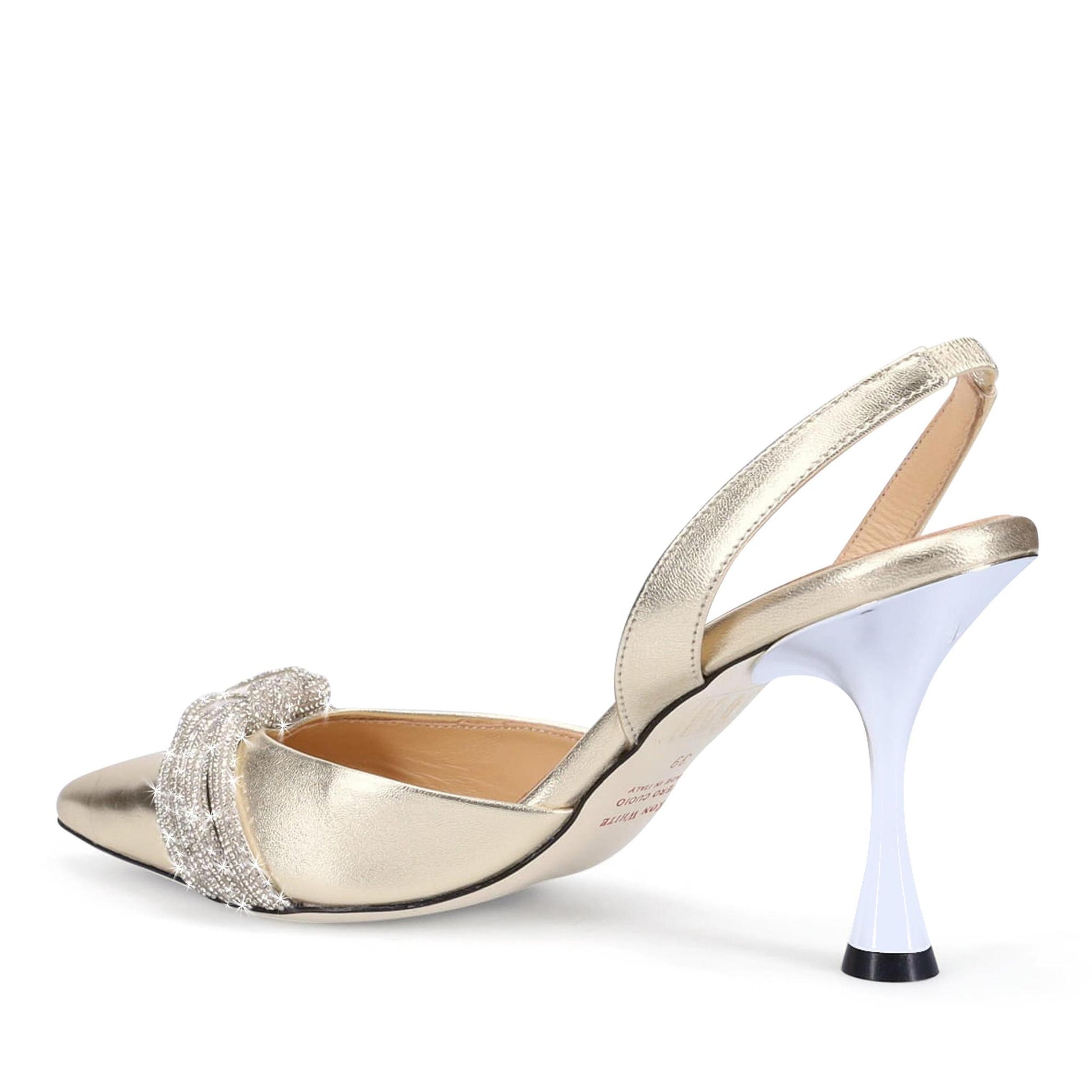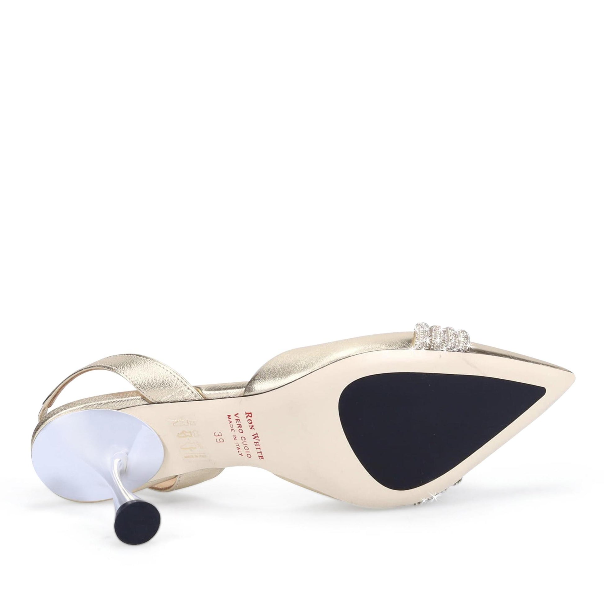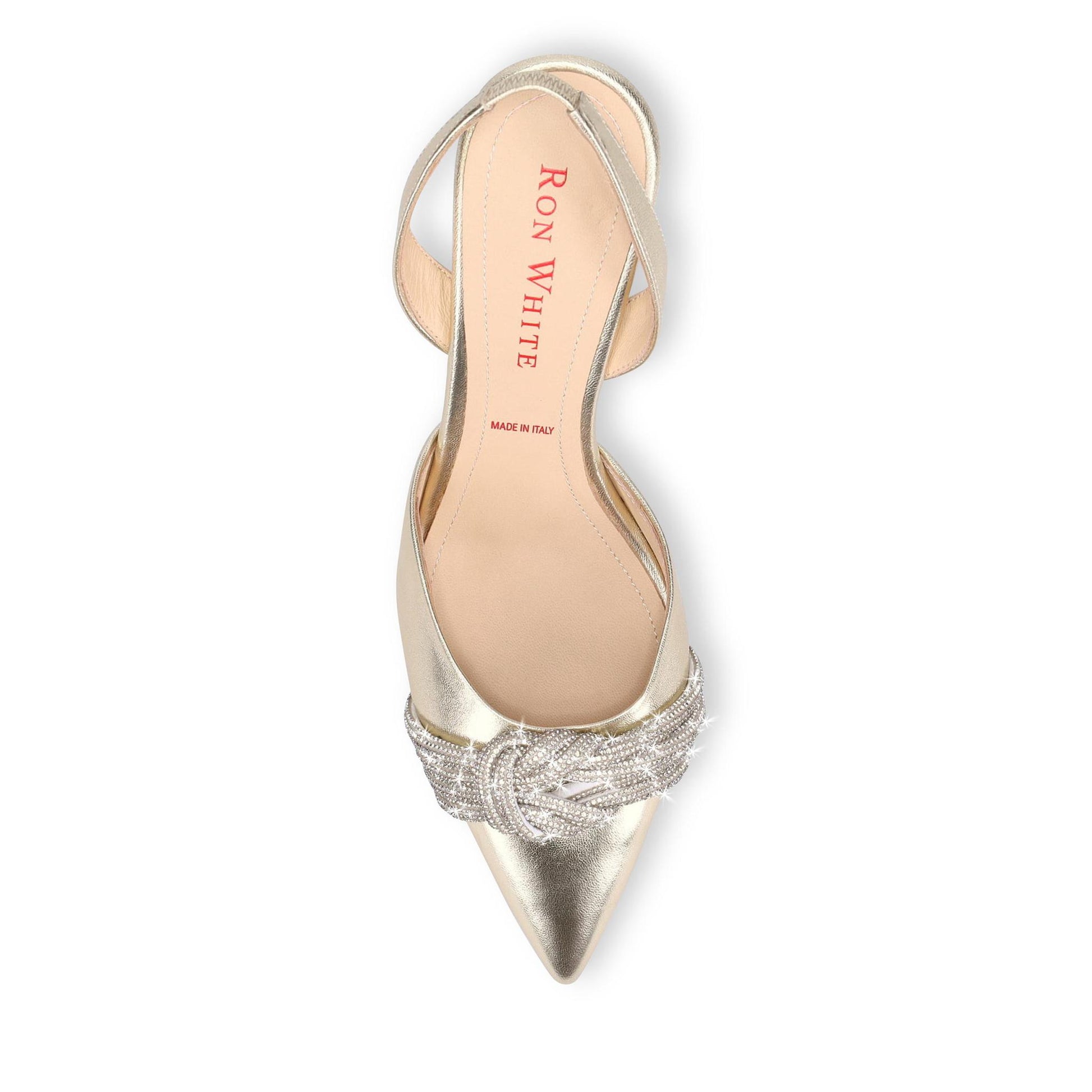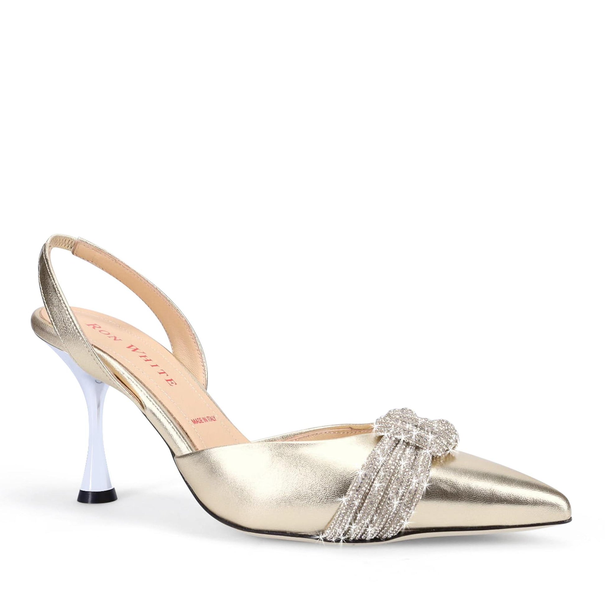 Limited Edition, The Devil Wears Prada Collection by Ron White 👠 Designed for lead character Miranda Priestly in The Devil Wears Prada Musical, played by Vanessa Williams. Buttery Metallic Nappa with Crystal Trim. Halter-Back with Elastic. Sumptuous Double Padding. Made in Italy.