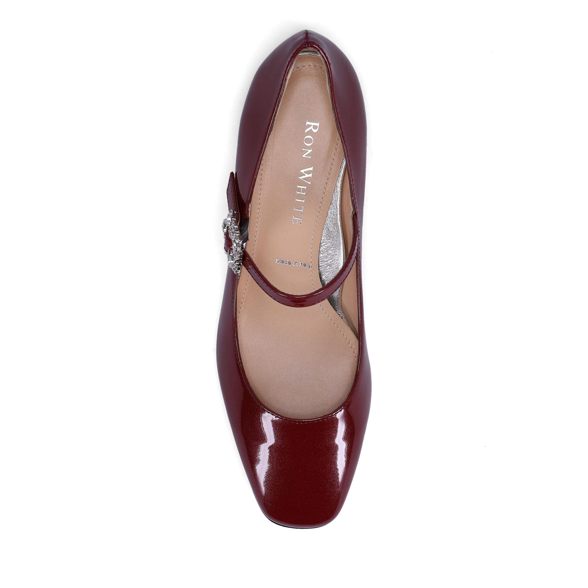 Elaine Patent Maryjane in Crystal Dusted Patent. Adjustable Strap with Crystal Buckle. Arch Support and Double Padding. Made in Italy.