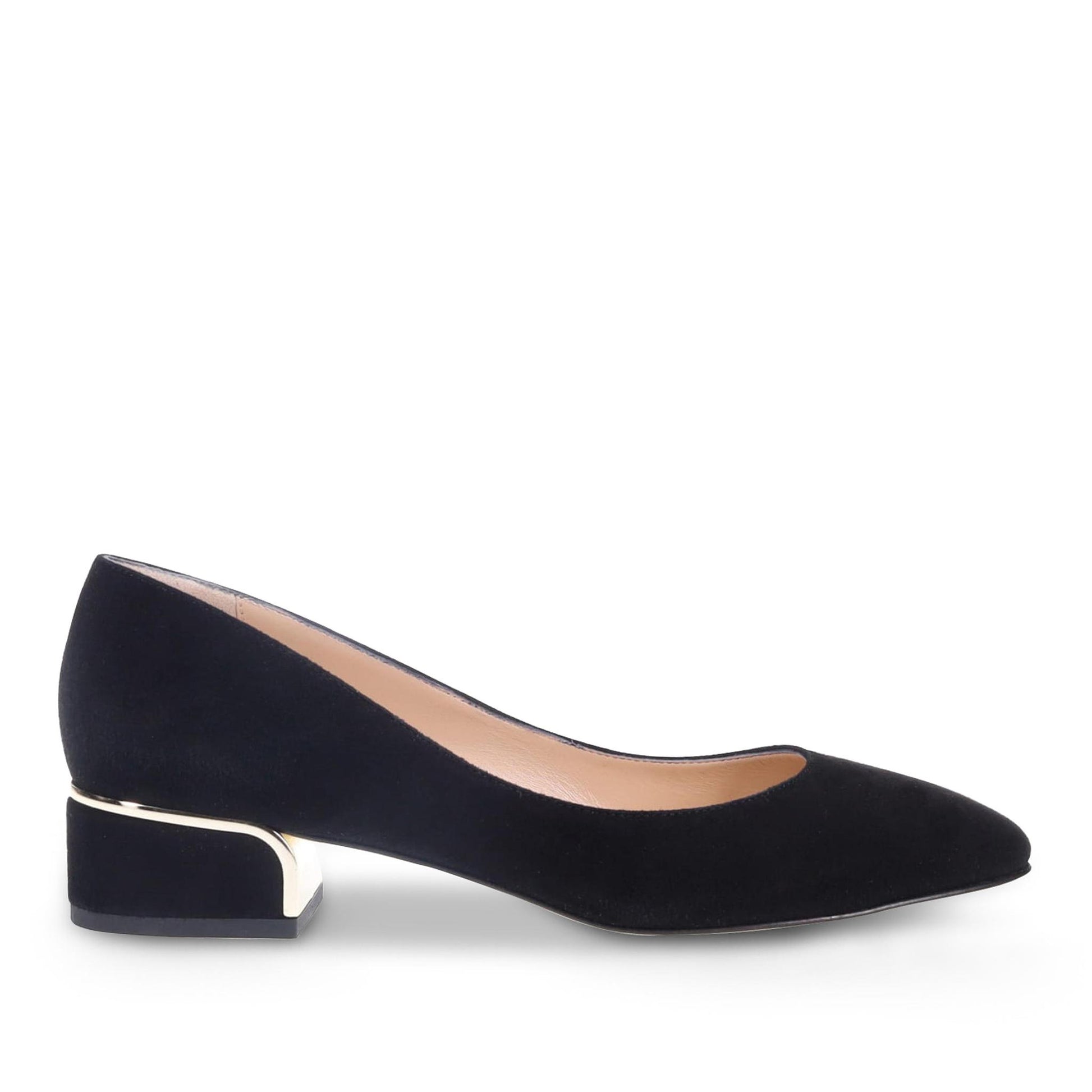 Elexia Low Heel Pump in Weatherproof Cashmere Suede. Metallic Heel detail. Arch Support and Double Padding. Made in Italy.