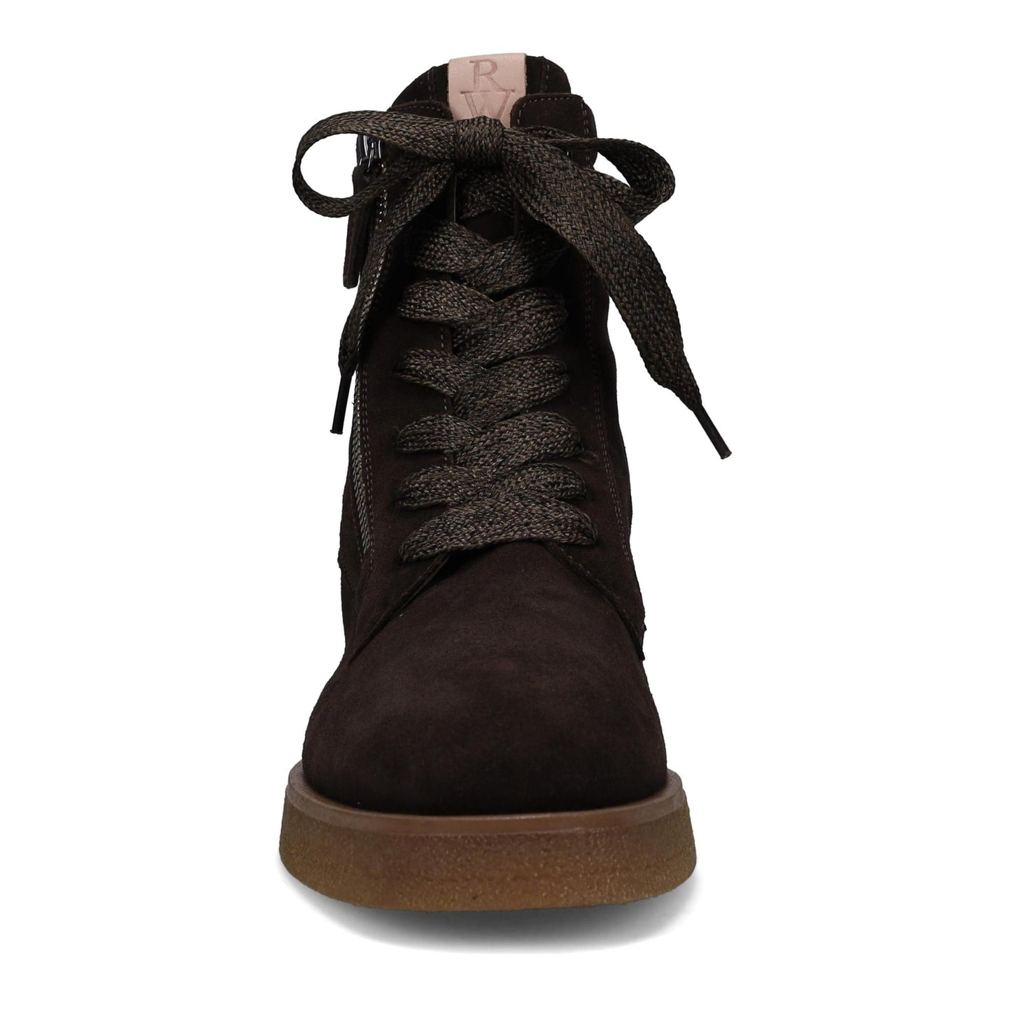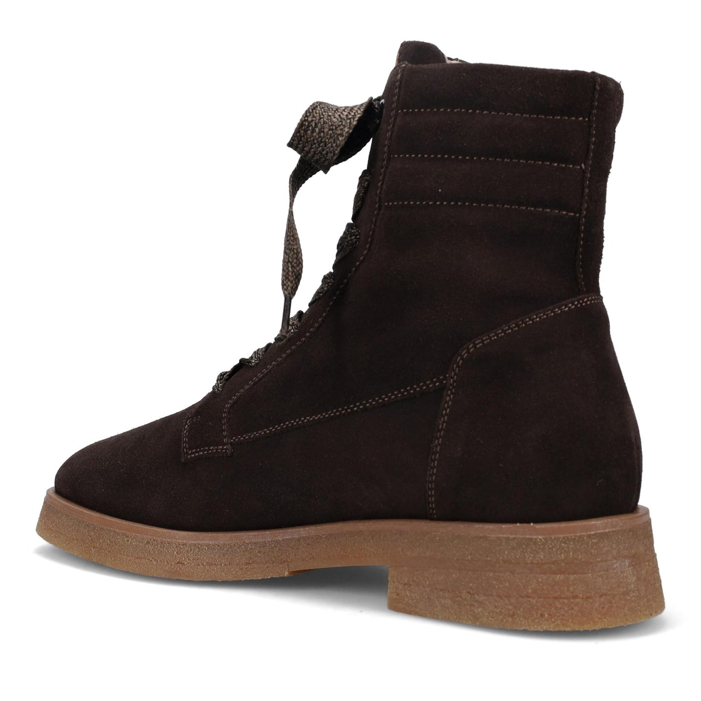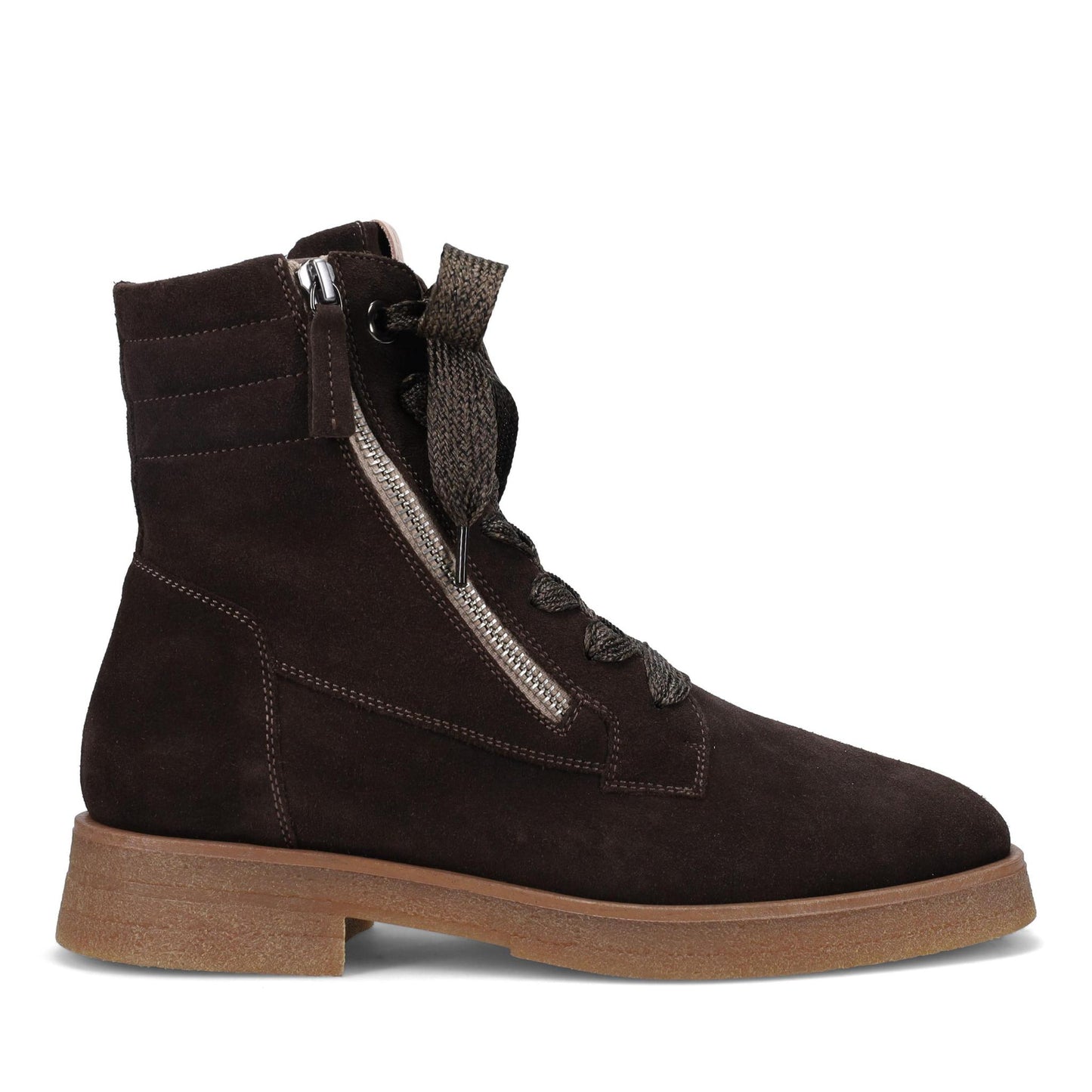 Hayley Ankle Boot in Weatherproof Suede. Functioning Laces with Outside Zipper. Fully Removable Footbed with Arch Support. Anti-Slip Rubber Outsole. Made in Italy.