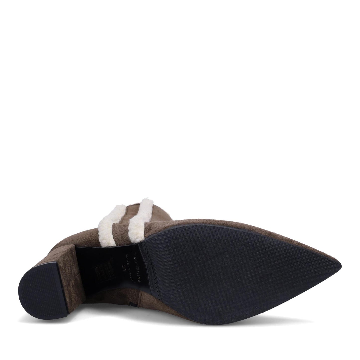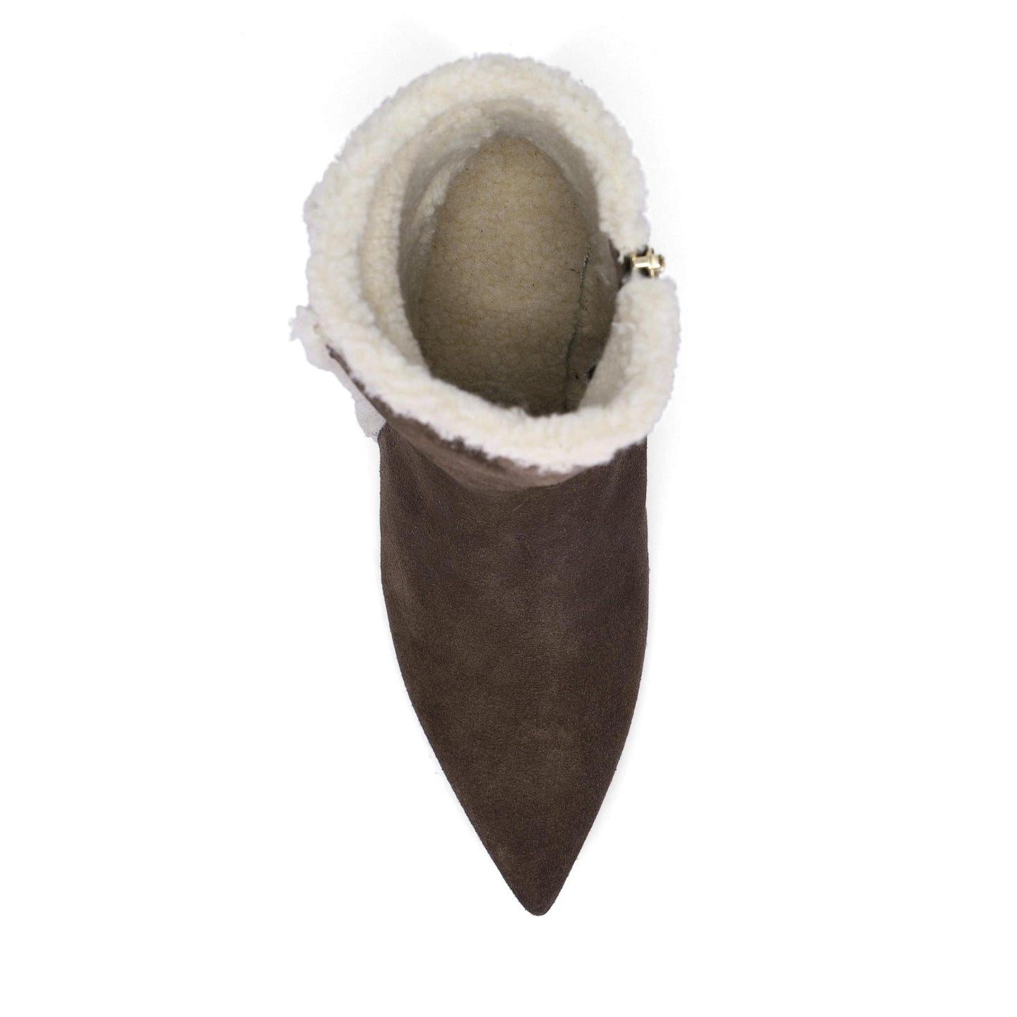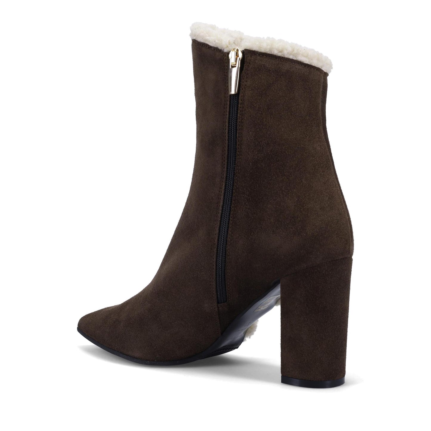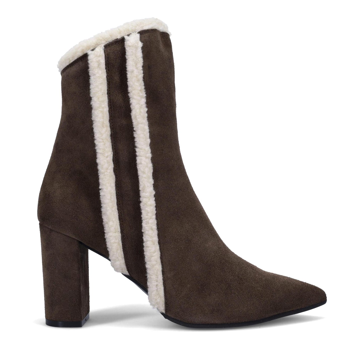 Larissa Ankle Boot in Weatherproof Suede with Faux Shearling Detail. Faux Shearling Lined. Inside Zipper. Double Padding. Made in Italy.
