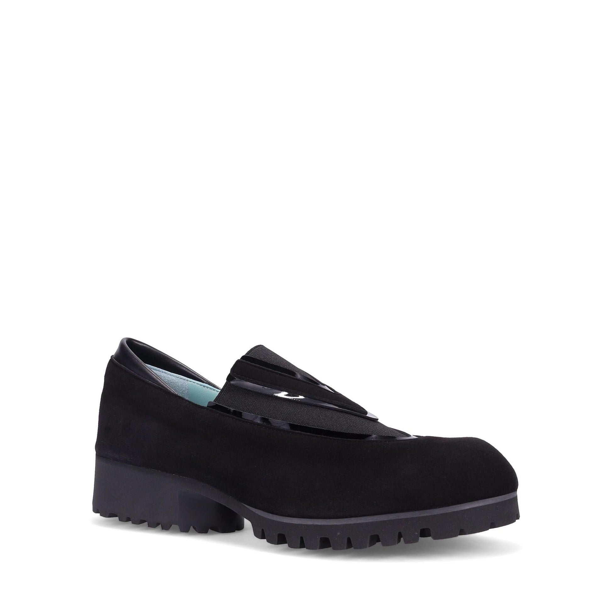 Thierry Rabotin Slip On in soft all-over Suede with Patent Trim and Elastic Detail. Ultralight Rubber Outsole. Made in Italy.