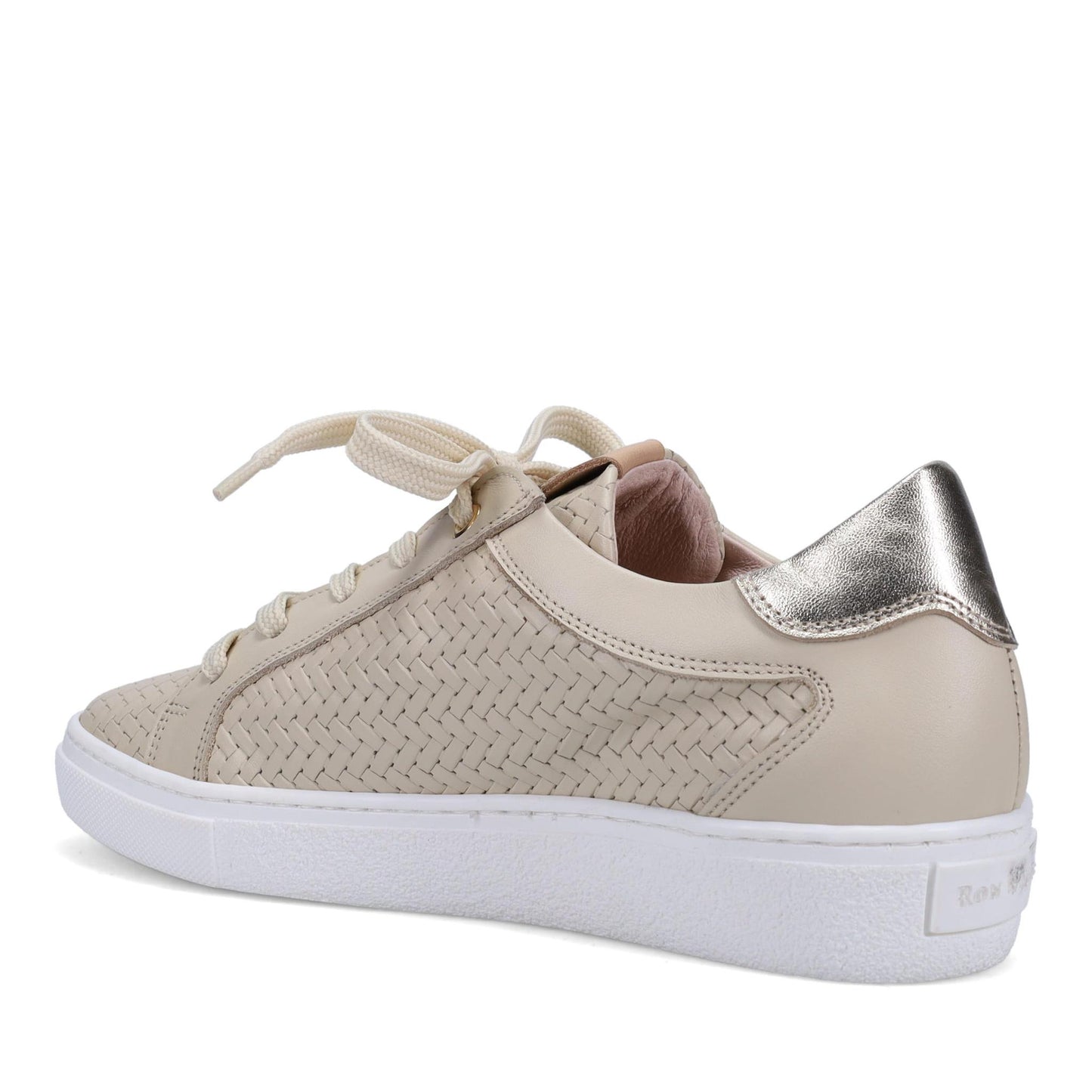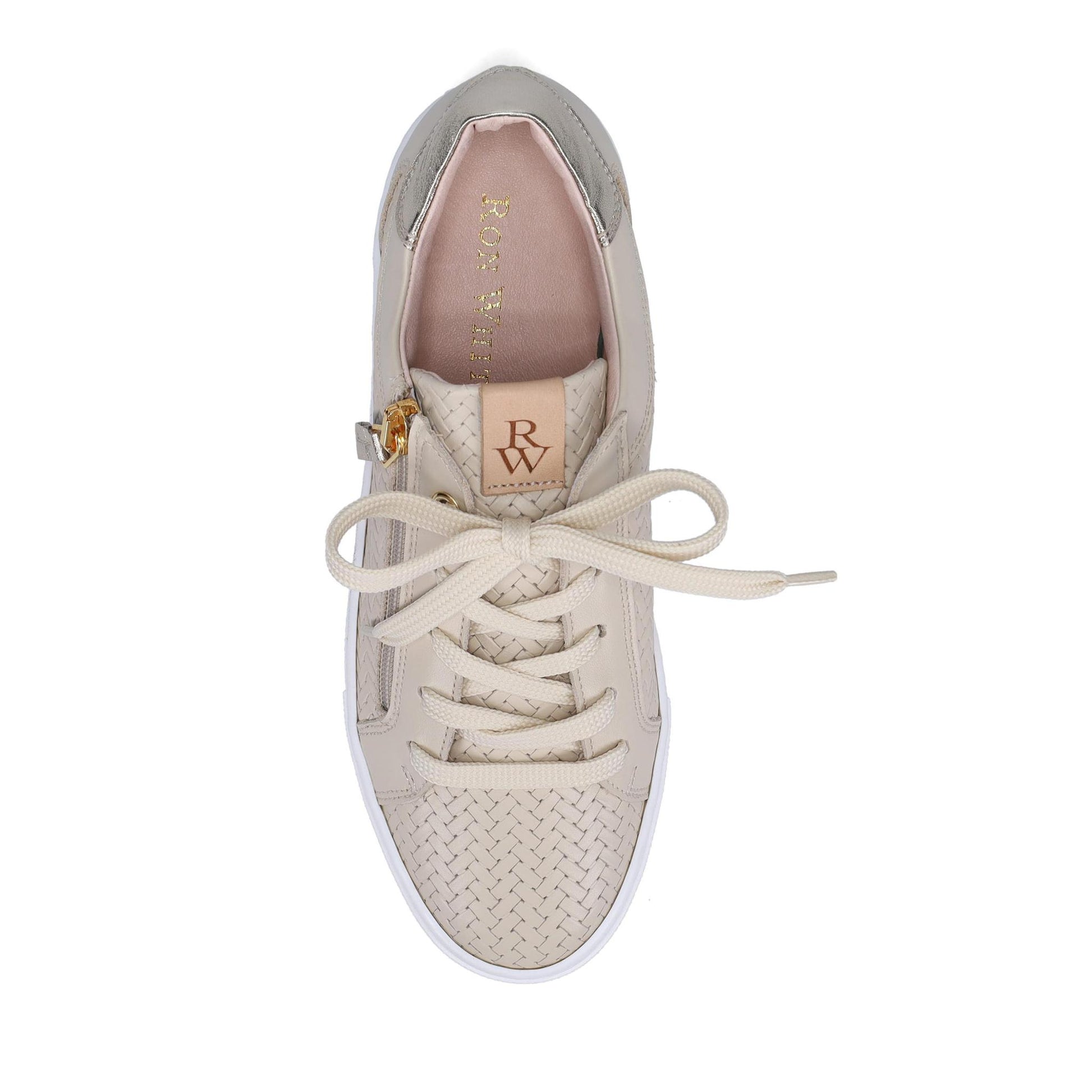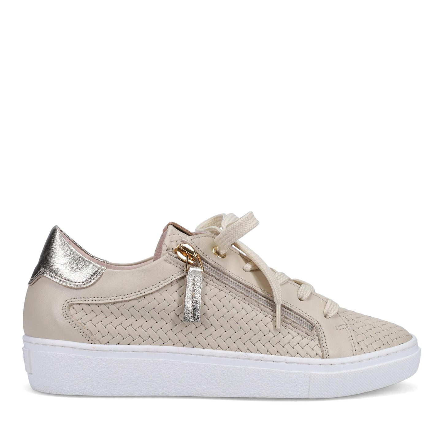 Oralie Footbed Sneaker in Woven Embossed Calf. Front laces and outside zipper. Features a full removable Footbed with arch and Metatarsal support. Made in Italy.