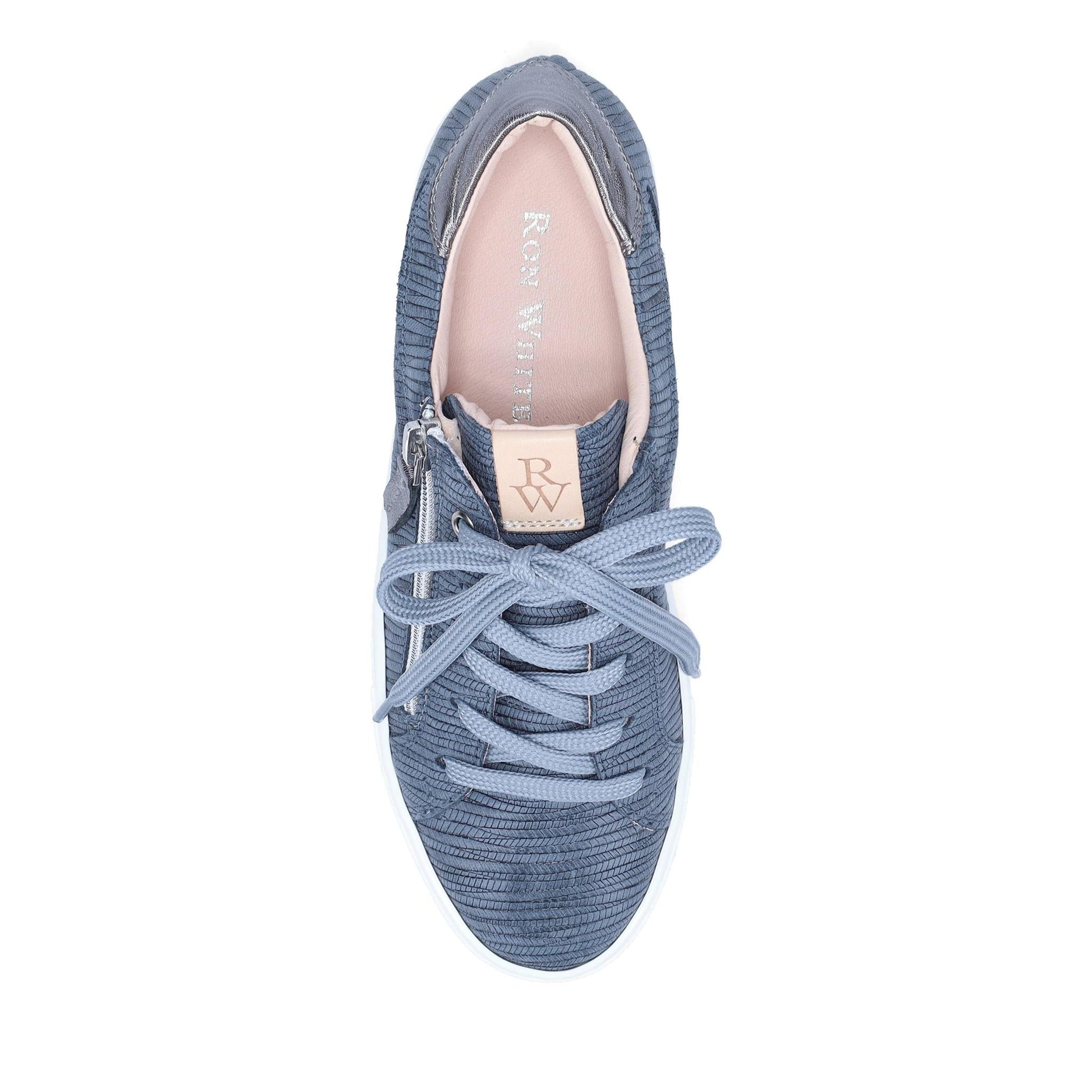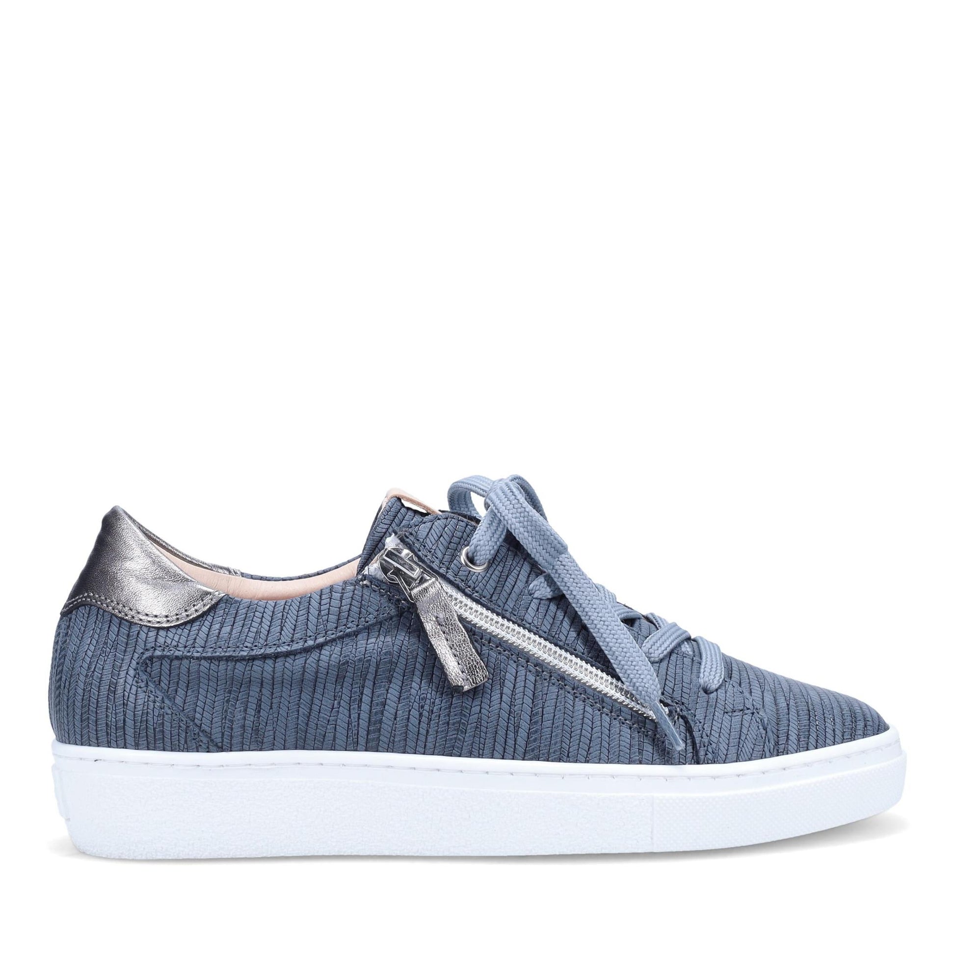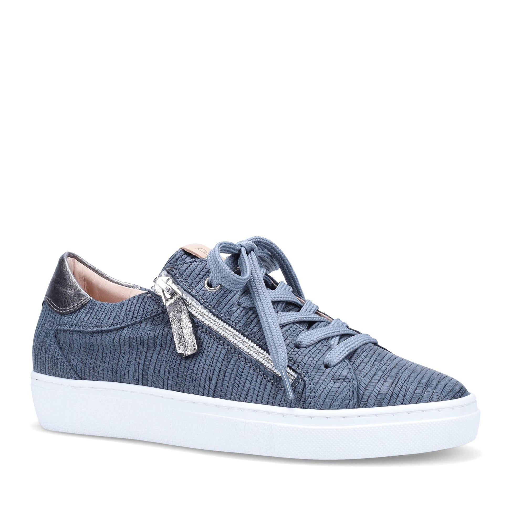 Oriya Epi Footbed Sneaker in Embossed Nubuck. Laces and outside zipper. Removable Footbed with arch and metatarsal support. Anti-slip rubber outsole. Made in Italy.
