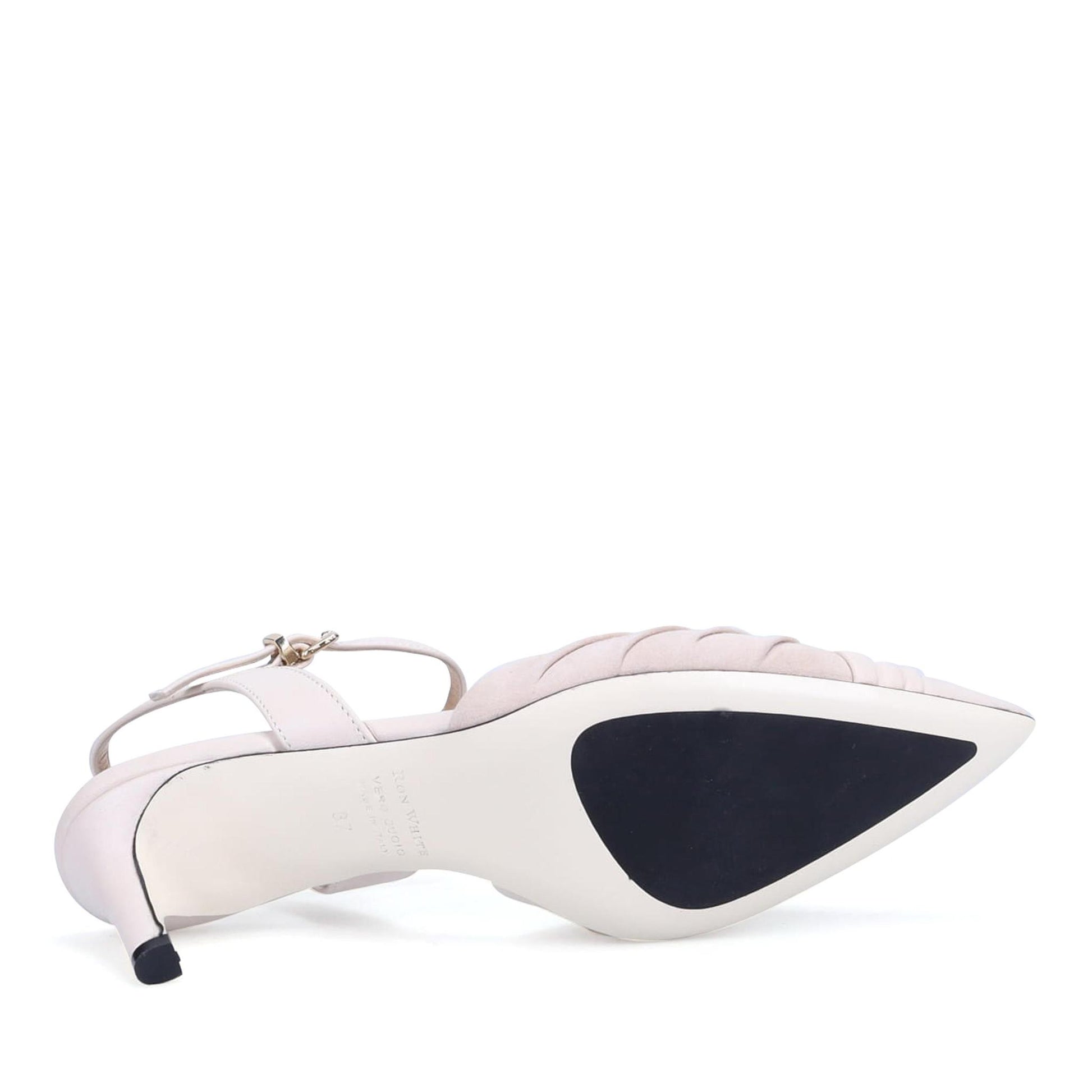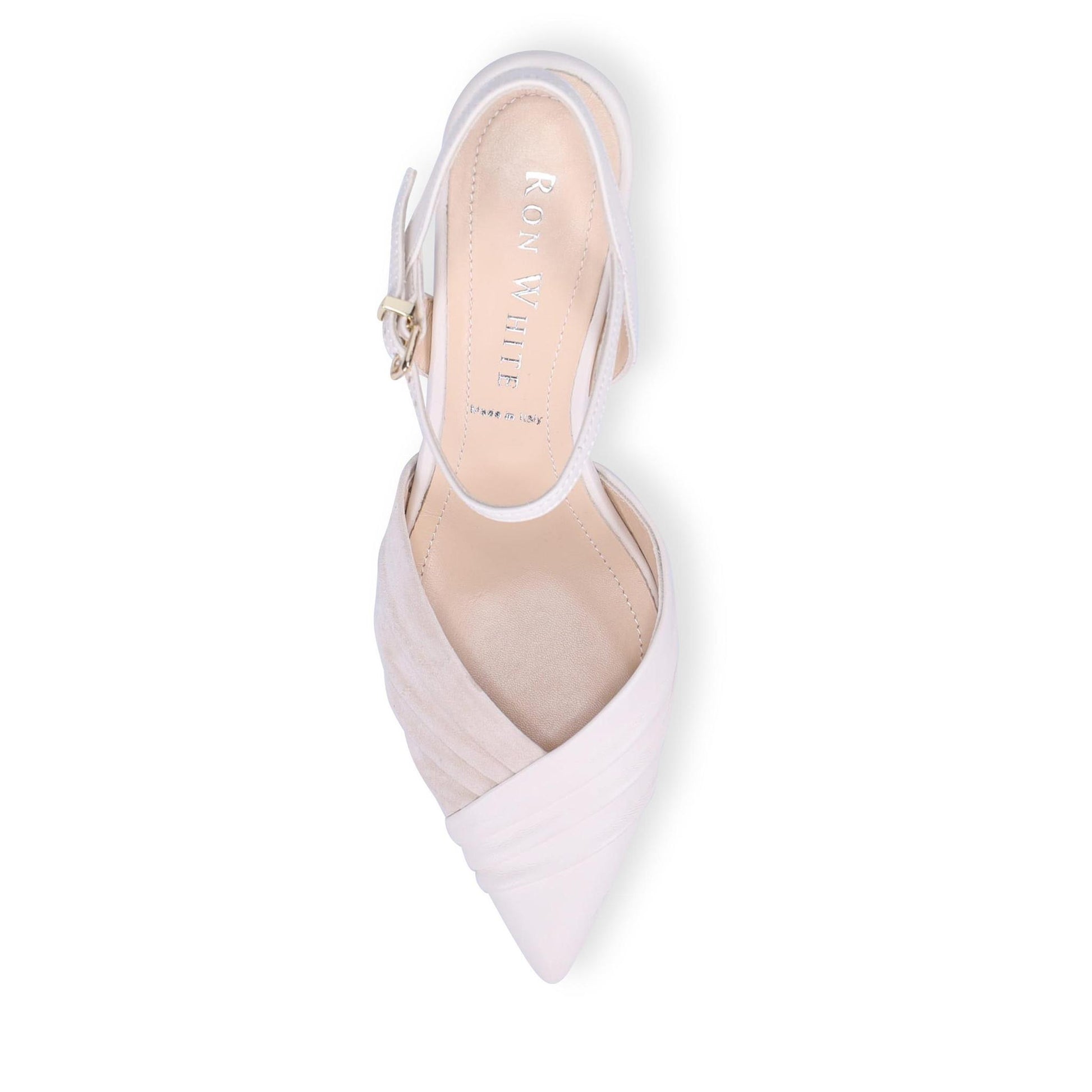 Quintina Kitten Heel in Ruched Buttery Nappa and Cashmere Suede. Sumptuous double padding. Ankle strap with adjustable buckle. Made in Italy.