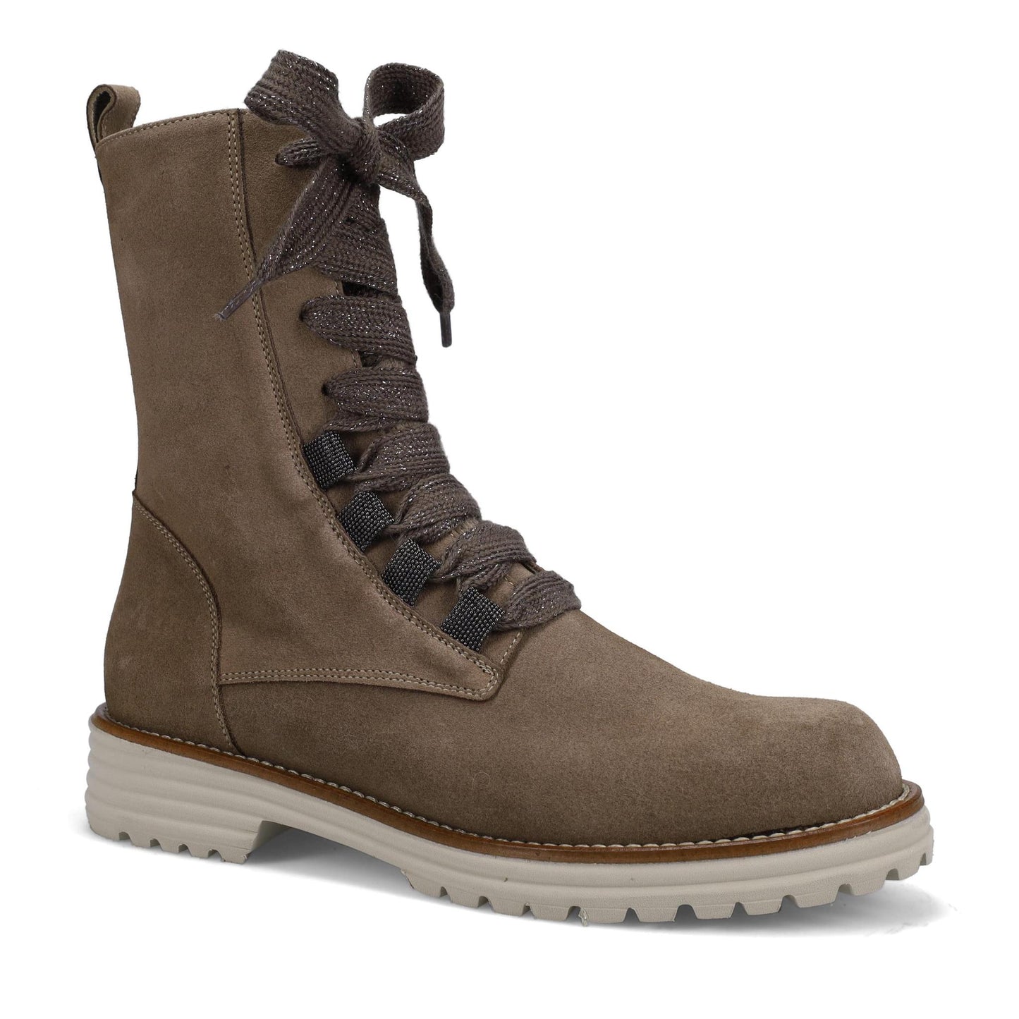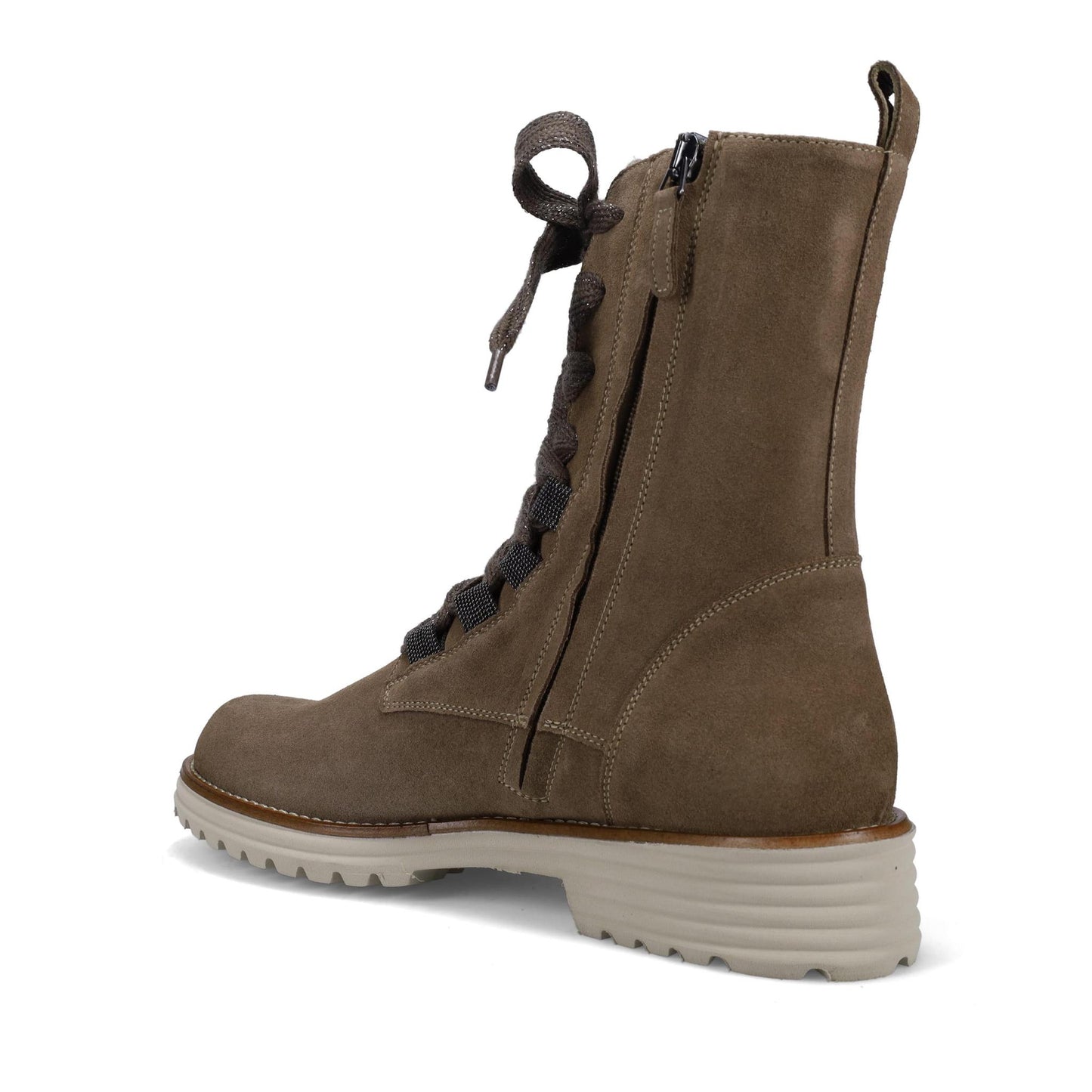 Rachel Ankle Boot in Weatherproof Cashmere Suede. Functioning Laces with Inside Zipper. Seamless Sacchetto Construction. Double Padding. Ultralight Rubber Lug Outsole. Made in Italy.