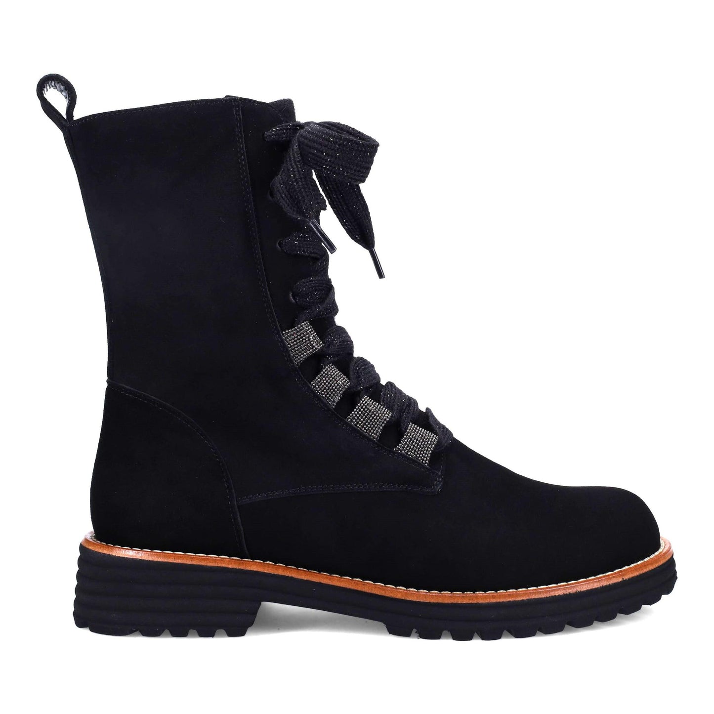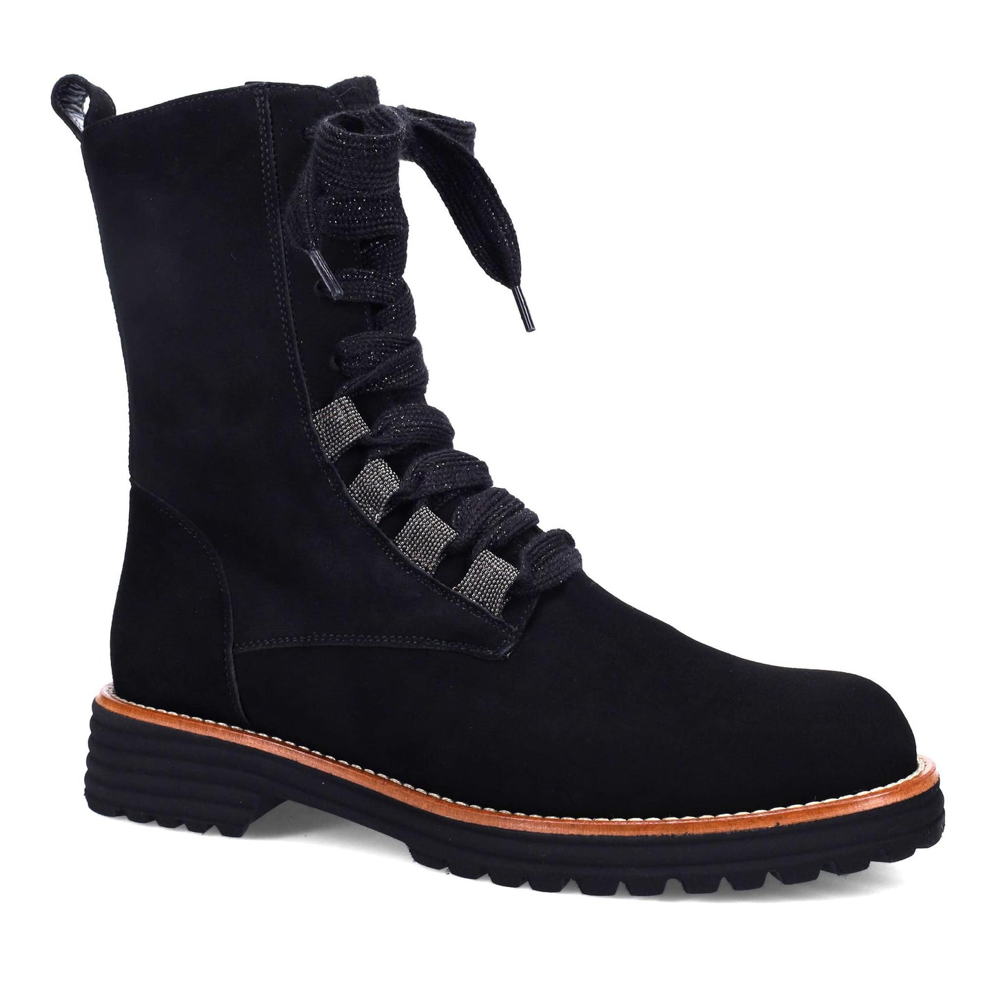 Rachel Ankle Boot in Weatherproof Cashmere Suede. Functioning Laces with Inside Zipper. Seamless Sacchetto Construction. Double Padding. Ultralight Rubber Lug Outsole. Made in Italy.