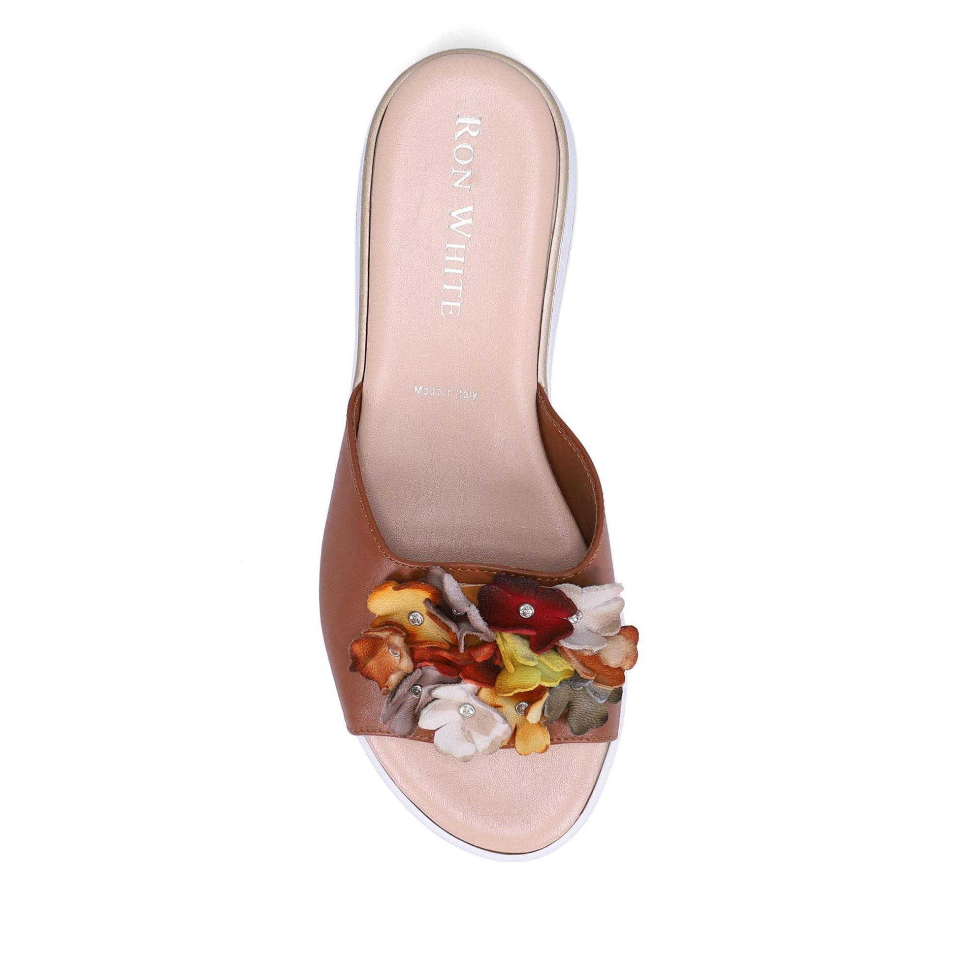Ravella Slide Sandal in Buttery Nappa. Adorned with Leather Flowers and Gems. Thick 5mm pillow cushioning. Anti-slip outsole. Made in Italy.