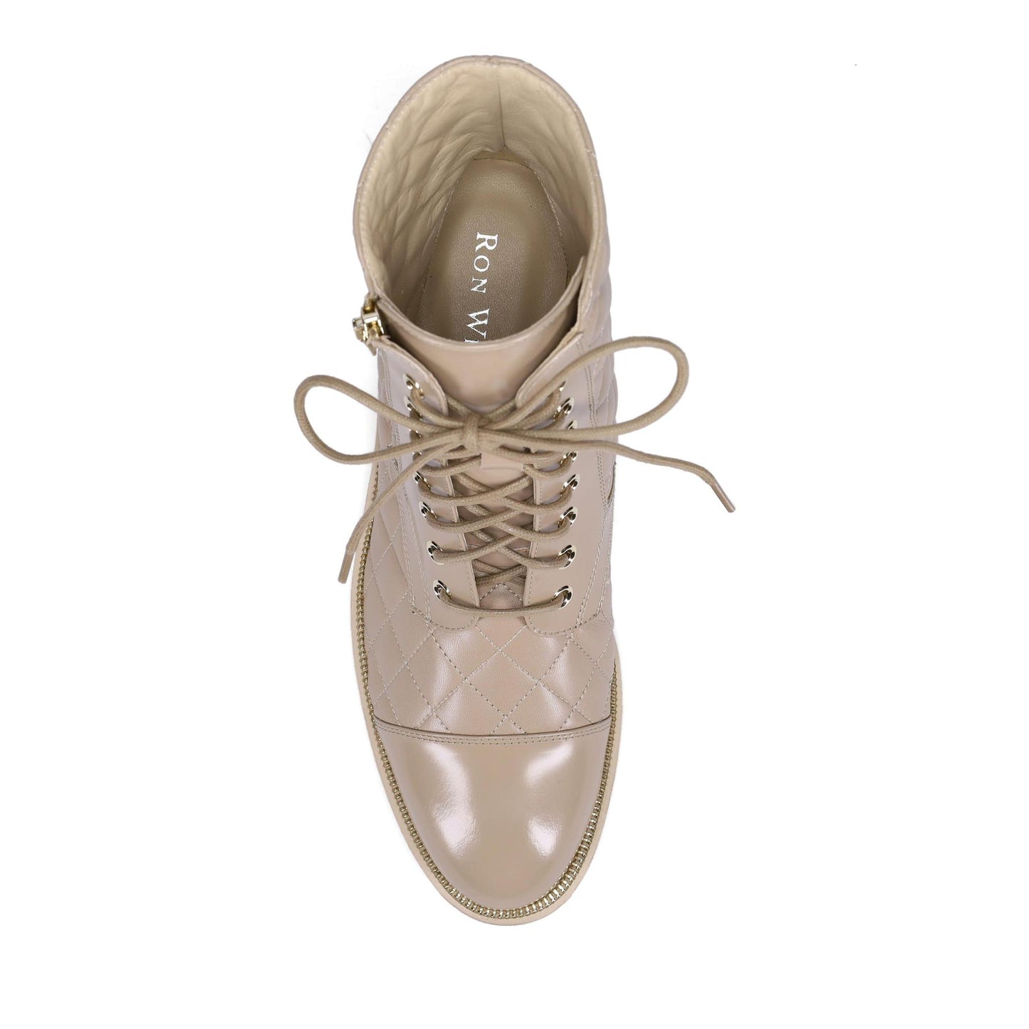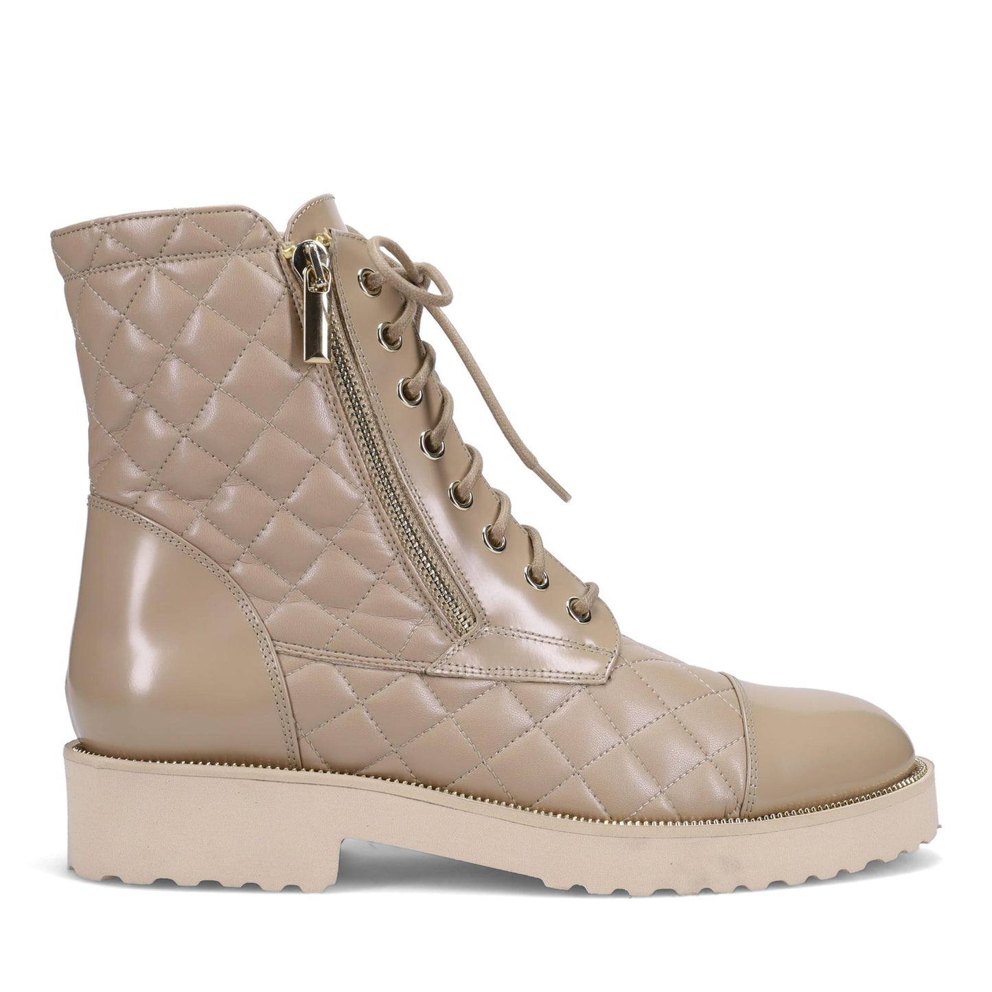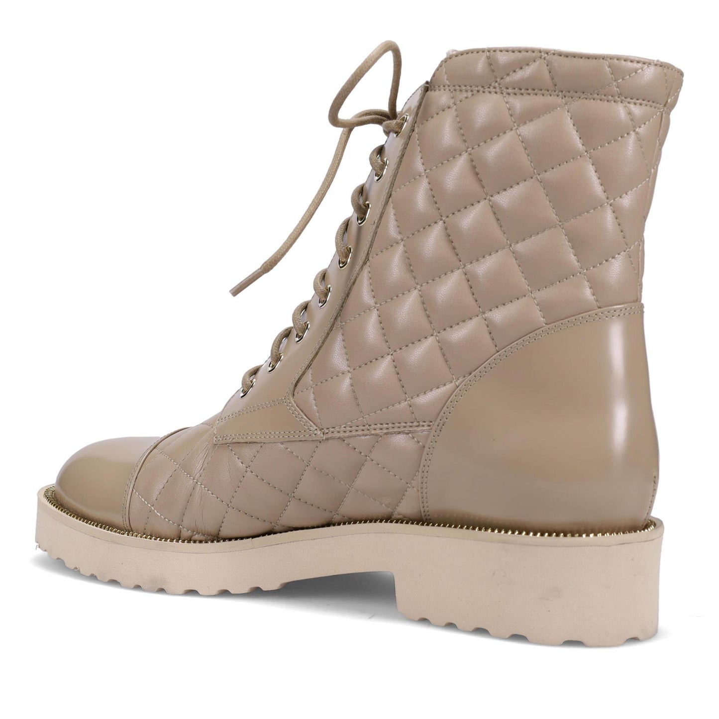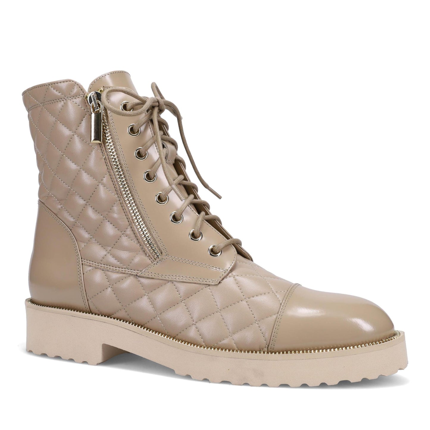 Tiffany Ankle Boot in Weatherproof Quilted Buttery Nappa and Shine Calf. Platino Outside Zipper Matching the Zipper Welt Detail. Full Functioning Laces. Double Padding. Made in Italy.