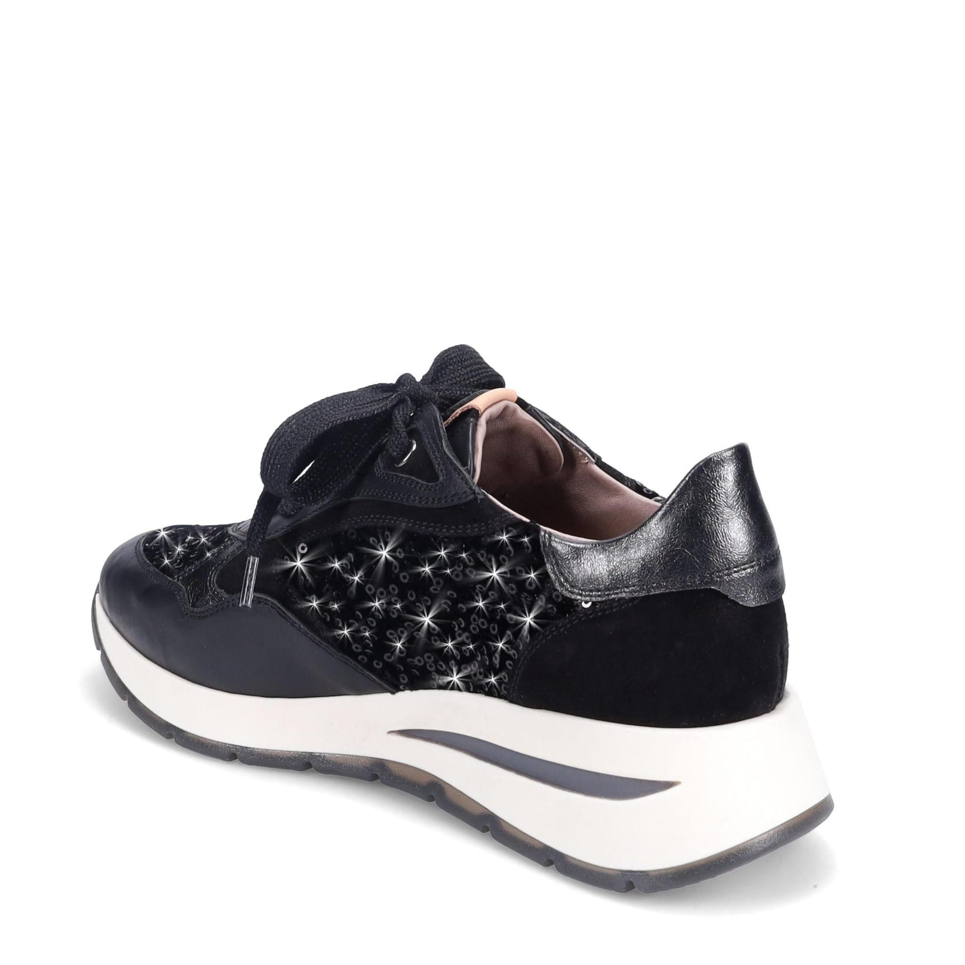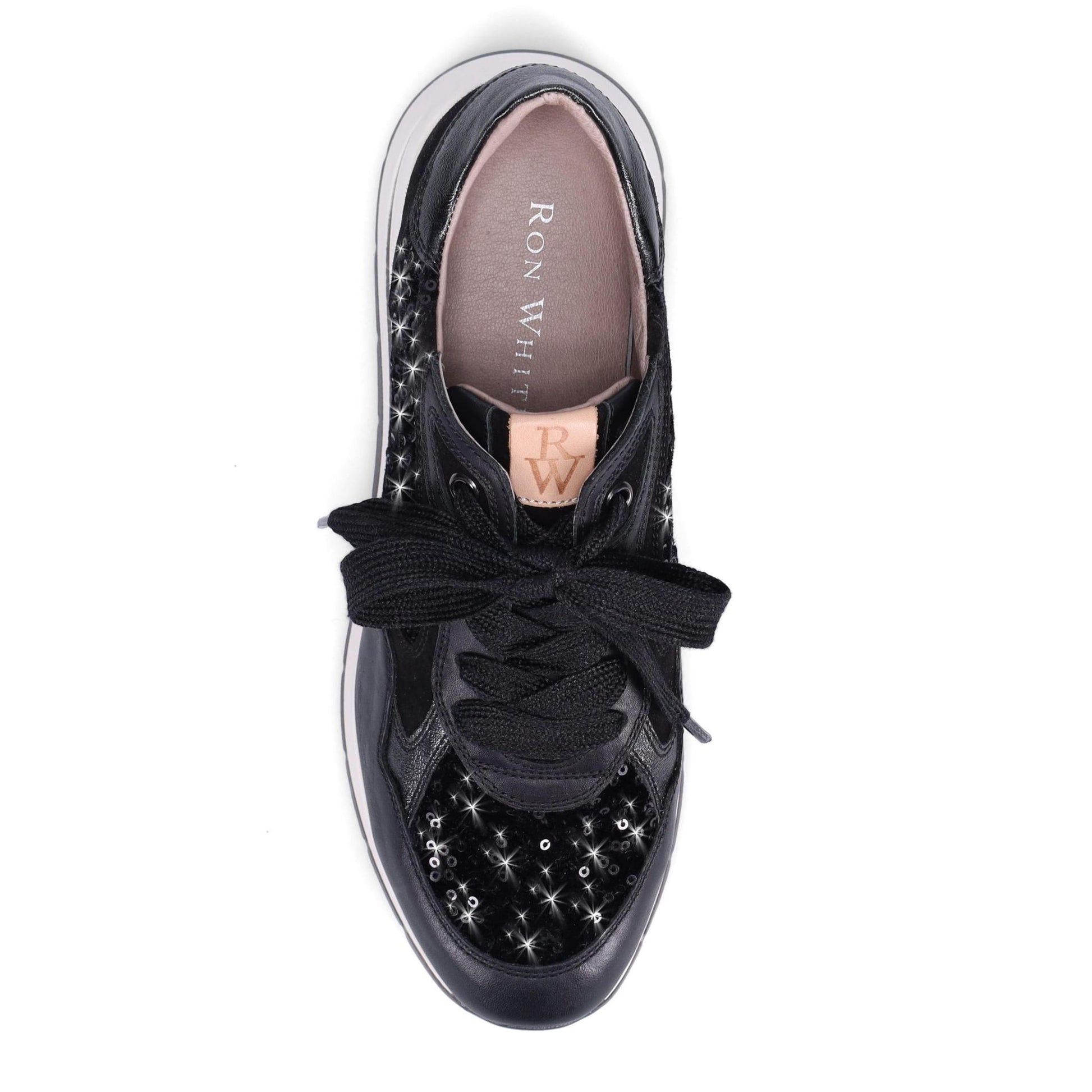 Zara in Metallic Calf with Sequined Velvet. Knit Laces. Featuring a Full Removable Footbed with Arch Support and Metatarsal Cushion. Anti-Slip Rubber Sole. Weatherproof. Made in Italy.