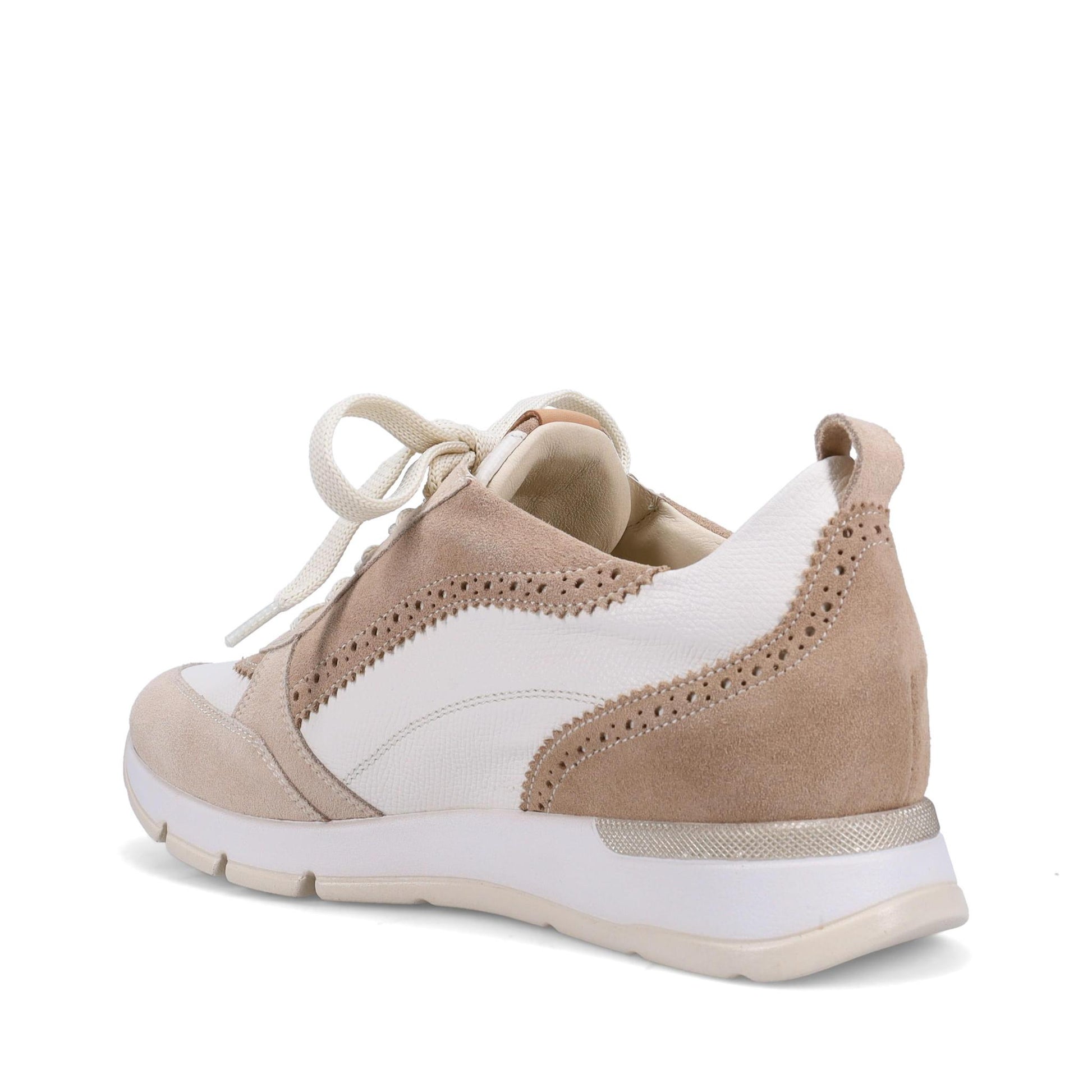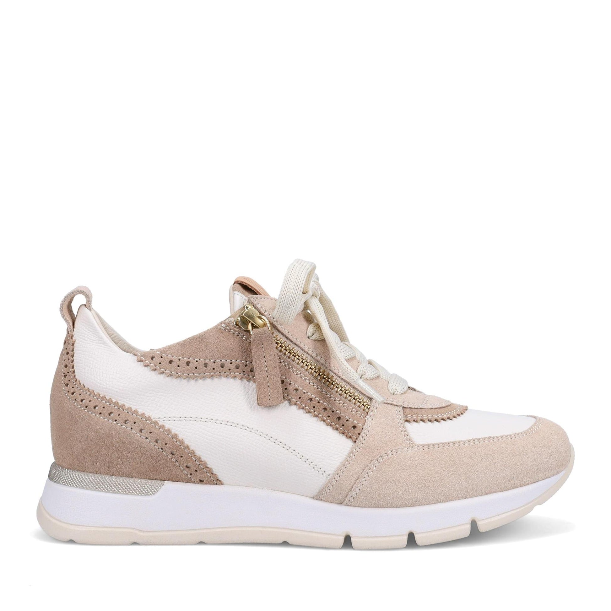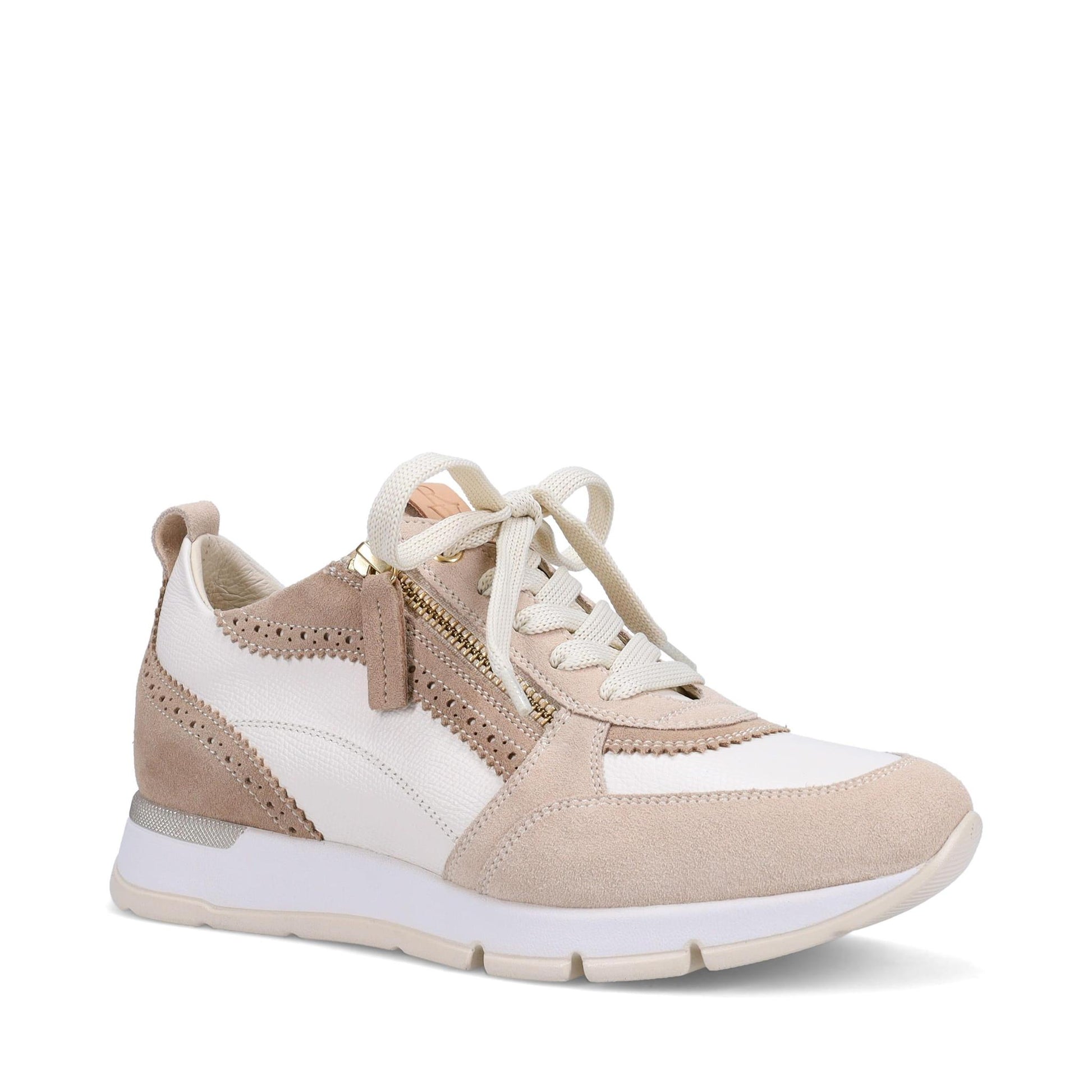 Zeanna Footbed Sneaker in Suede and Tumbled Calf. Laces and outside zipper. Removable footbed with arch support. Anti-slip rubber outsole. Internal Wedge. Made in Italy.