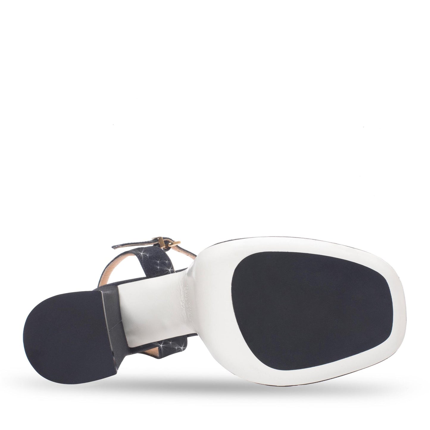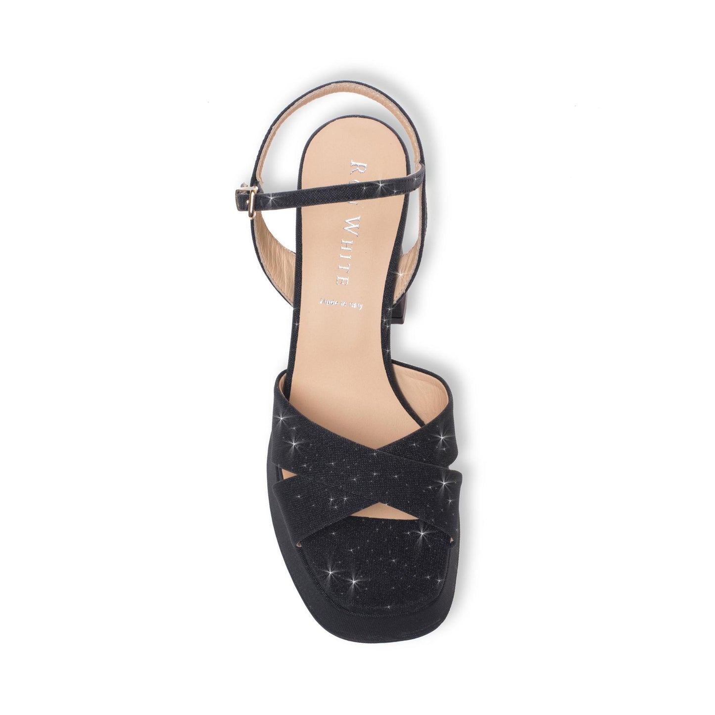 Zion Platform Sandal in All-Over Galaxy. Double Padding. Adjustable Buckle. Asymmetrical Heel. Made in Italy.